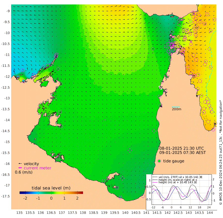 5cm/s 86T +3cm/s rms + 7cm/s -42T. ARA-GOC87 57m 11cm/s 135T +3cm/s rms + 2cm/s -2T. ARA-GOC87 60m 1cm/s -25T +2cm/s rms + 3cm/s 61T. ARA-GOC87 47m 99cm Daru 101cm Bobo Island 80cm Meer Island Barge 94cm Bramble Cay 109cm Unnamed Cay 99cm Pearce Cay 106cm Stephens Island 116cm Merrie England Shoals 104cm Mutacomal Reef 104cm Darnley Island Barge 82cm East Cay 102cm Yorke Island Barge 100cm Rennel Island 99cm Aureed Island 87cm Dungeness Reef 54cm Zagai Island 47cm Yam Island -14cm Dauan Island -7cm Saibai Island 8cm Phipi Reef 42cm Warrior Reef - West -5cm Mabuiag Island Barge 103cm Half Way Island 96cm Coconut Island 100cm Dugong Islet 72cm Poll Island 82cm Kirkcaldie Reef 58cm Suarji Island 72cm Sue Islet -28cm Hawkesbury Island 57cm Alert Patches 56cm Twin Island -25cm Badu Island 45cm St Pauls (Moa Island) -5cm Kubin (Moa Island) 30cm Ince Point 19cm Thursday Island 21cm Nardana Patches 5cm Turtle Head -5cm Round Island -15cm Goods Island -21cm Booby Island -20cm White Rocks Area 12cm Carpentaria 38cm Papou Point 3cm Bampfield Head -20cm Crab Island -23cm Red Wallis Island -7cm Packe Island 111cm Harrington Reef -22cm Herald Camp 13cm Sharp Point -3cm Red Island Point 36cm Possession Island 59cm Alpha Rock 76cm Frederick Point 101cm Wyborn Reef Light 94cm Tetley Island 66cm Triangle Reef 112cm Turtle Head Island 75cm Maclennan Cay 60cm Raine Island 102cm Mcsweeny Reef 99cm Collette Reef 78cm Shadwell Reef 111cm Hannibal Island 96cm Round Point -7cm Vrilya Point 95cm Cape Grenville 83cm Hicks Island 81cm Sir Charles Hardy Island 29cm Harvey Island 88cm Kay Reef 69cm Rocky Island 60cm Chapman Island 61cm Ham Reef 69cm Jubilee Reef 67cm Night Island 64cm Unnamed Reef No. 3 75cm Morris Island 72cm 1st 3 Mile Opening 73cm Creech Reef 68cm Fife Island 82cm Eden Reef 81cm Stanley Island 82cm Normanby River -116cm Yabooma Island -106cm Hutchison River -102cm Elcho Island -111cm North West Crocodile Island -42cm Cape Wessel -81cm Stevens Island 2cm Guluwuru Island -77cm Hopeful Bay -53cm Auster Point -61cm Two Island Bay -82cm Cadell Strait 75cm Mallison Island -13cm Melville Bay (Gove Harbour) -10cm Truant Island 1cm Cape Arnhem 4cm Cape Grey 0cm Hawk Island -4cm Milner Bay (Groote Eylandt) -3cm Cape Beatrice 4cm West Island 9cm Centre Island -5cm Mornington Island -4cm West Wellesley Islands -35cm Bountiful Island -60cm Albert River Mouth -52cm Sweers Island -60cm Karumba -16cm Nassau River Offshore -4cm Christmas Creek -3cm Archer River 3cm Boyd Point -12cm Weipa (Humbug Point) 9cm Pennefather River -14cm Cullen Point