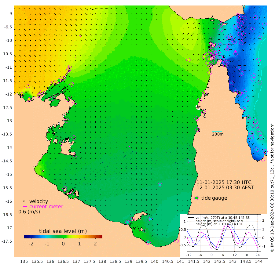 18cm/s 126T +3cm/s rms + 7cm/s -42T. ARA-GOC87 57m 20cm/s 16T +3cm/s rms + 2cm/s -2T. ARA-GOC87 60m 22cm/s 125T +2cm/s rms + 3cm/s 61T. ARA-GOC87 47m -158cm Daru -156cm Bobo Island -103cm Meer Island Barge -133cm Bramble Cay -158cm Unnamed Cay -154cm Pearce Cay -151cm Stephens Island -159cm Merrie England Shoals -164cm Mutacomal Reef -141cm Darnley Island Barge -115cm East Cay -147cm Yorke Island Barge -154cm Rennel Island -153cm Aureed Island -150cm Dungeness Reef -114cm Zagai Island -119cm Yam Island -63cm Dauan Island -57cm Saibai Island -95cm Phipi Reef -123cm Warrior Reef - West -31cm Mabuiag Island Barge -153cm Half Way Island -145cm Coconut Island -159cm Dugong Islet -131cm Poll Island -140cm Kirkcaldie Reef -122cm Suarji Island -122cm Sue Islet 17cm Hawkesbury Island -98cm Alert Patches -103cm Twin Island 14cm Badu Island -95cm St Pauls (Moa Island) -20cm Kubin (Moa Island) -66cm Ince Point -45cm Thursday Island -50cm Nardana Patches -31cm Turtle Head -10cm Round Island 12cm Goods Island 45cm Booby Island 28cm White Rocks Area 56cm Carpentaria -80cm Papou Point 31cm Bampfield Head 46cm Crab Island 34cm Red Wallis Island -16cm Packe Island -165cm Harrington Reef 0cm Herald Camp -30cm Sharp Point -22cm Red Island Point -64cm Possession Island -102cm Alpha Rock -127cm Frederick Point -150cm Wyborn Reef Light -143cm Tetley Island -94cm Triangle Reef -146cm Turtle Head Island -105cm Maclennan Cay -74cm Raine Island -144cm Mcsweeny Reef -136cm Collette Reef -100cm Shadwell Reef -150cm Hannibal Island -134cm Round Point 56cm Vrilya Point -127cm Cape Grenville -117cm Hicks Island -123cm Sir Charles Hardy Island -40cm Harvey Island -112cm Kay Reef -93cm Rocky Island -82cm Chapman Island -78cm Ham Reef -86cm Jubilee Reef -87cm Night Island -82cm Unnamed Reef No. 3 -96cm Morris Island -84cm 1st 3 Mile Opening -91cm Creech Reef -92cm Fife Island -103cm Eden Reef -99cm Stanley Island -111cm Normanby River 97cm Yabooma Island 93cm Hutchison River 99cm Elcho Island 96cm North West Crocodile Island 55cm Cape Wessel 85cm Stevens Island 12cm Guluwuru Island 77cm Hopeful Bay 66cm Auster Point 69cm Two Island Bay 73cm Cadell Strait -31cm Mallison Island 21cm Melville Bay (Gove Harbour) 26cm Truant Island 9cm Cape Arnhem -1cm Cape Grey -10cm Hawk Island -3cm Milner Bay (Groote Eylandt) -18cm Cape Beatrice -31cm West Island -32cm Centre Island -85cm Mornington Island -89cm West Wellesley Islands -99cm Bountiful Island -79cm Albert River Mouth -66cm Sweers Island -84cm Karumba -86cm Nassau River Offshore -76cm Christmas Creek -22cm Archer River -6cm Boyd Point -6cm Weipa (Humbug Point) 27cm Pennefather River 34cm Cullen Point