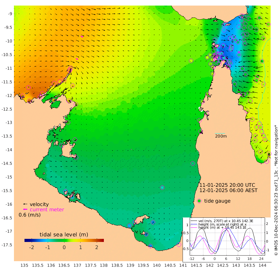 38cm/s 120T +3cm/s rms + 7cm/s -42T. ARA-GOC87 57m 5cm/s 111T +3cm/s rms + 2cm/s -2T. ARA-GOC87 60m 37cm/s 117T +2cm/s rms + 3cm/s 61T. ARA-GOC87 47m -67cm Daru -48cm Bobo Island 28cm Meer Island Barge 7cm Bramble Cay -36cm Unnamed Cay -29cm Pearce Cay -18cm Stephens Island -28cm Merrie England Shoals -68cm Mutacomal Reef -10cm Darnley Island Barge 27cm East Cay -39cm Yorke Island Barge -48cm Rennel Island -48cm Aureed Island -74cm Dungeness Reef -100cm Zagai Island -107cm Yam Island -106cm Dauan Island -99cm Saibai Island -115cm Phipi Reef -111cm Warrior Reef - West -76cm Mabuiag Island Barge -48cm Half Way Island -67cm Coconut Island -68cm Dugong Islet -90cm Poll Island -88cm Kirkcaldie Reef -116cm Suarji Island -88cm Sue Islet 14cm Hawkesbury Island -90cm Alert Patches -92cm Twin Island -2cm Badu Island -107cm St Pauls (Moa Island) -23cm Kubin (Moa Island) -73cm Ince Point -56cm Thursday Island -62cm Nardana Patches -29cm Turtle Head -15cm Round Island 22cm Goods Island 46cm Booby Island 31cm White Rocks Area 50cm Carpentaria -80cm Papou Point 44cm Bampfield Head 41cm Crab Island 32cm Red Wallis Island -8cm Packe Island -75cm Harrington Reef 0cm Herald Camp -47cm Sharp Point -21cm Red Island Point -60cm Possession Island -90cm Alpha Rock -84cm Frederick Point -65cm Wyborn Reef Light -73cm Tetley Island 11cm Triangle Reef -47cm Turtle Head Island 18cm Maclennan Cay 48cm Raine Island -29cm Mcsweeny Reef -17cm Collette Reef 18cm Shadwell Reef -13cm Hannibal Island 10cm Round Point 48cm Vrilya Point 8cm Cape Grenville 17cm Hicks Island 19cm Sir Charles Hardy Island 1cm Harvey Island 32cm Kay Reef 38cm Rocky Island 49cm Chapman Island 48cm Ham Reef 43cm Jubilee Reef 31cm Night Island 48cm Unnamed Reef No. 3 44cm Morris Island 45cm 1st 3 Mile Opening 43cm Creech Reef 39cm Fife Island 64cm Eden Reef 44cm Stanley Island 46cm Normanby River 153cm Yabooma Island 184cm Hutchison River 162cm Elcho Island 146cm North West Crocodile Island 116cm Cape Wessel 144cm Stevens Island 108cm Guluwuru Island 136cm Hopeful Bay 124cm Auster Point 126cm Two Island Bay 165cm Cadell Strait 120cm Mallison Island 93cm Melville Bay (Gove Harbour) 103cm Truant Island 59cm Cape Arnhem 20cm Cape Grey -4cm Hawk Island -41cm Milner Bay (Groote Eylandt) -52cm Cape Beatrice -104cm West Island -103cm Centre Island -118cm Mornington Island -123cm West Wellesley Islands -136cm Bountiful Island -138cm Albert River Mouth -142cm Sweers Island -142cm Karumba -90cm Nassau River Offshore -54cm Christmas Creek 7cm Archer River 17cm Boyd Point 22cm Weipa (Humbug Point) 33cm Pennefather River 31cm Cullen Point
