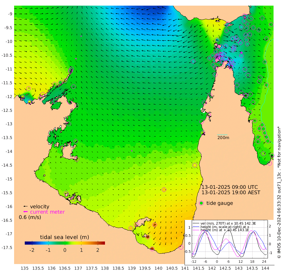 22cm/s -70T +3cm/s rms + 7cm/s -42T. ARA-GOC87 57m 19cm/s -81T +3cm/s rms + 2cm/s -2T. ARA-GOC87 60m 16cm/s -63T +2cm/s rms + 3cm/s 61T. ARA-GOC87 47m -70cm Daru -66cm Bobo Island -6cm Meer Island Barge -18cm Bramble Cay -49cm Unnamed Cay -58cm Pearce Cay -44cm Stephens Island -44cm Merrie England Shoals -67cm Mutacomal Reef -38cm Darnley Island Barge -2cm East Cay -58cm Yorke Island Barge -61cm Rennel Island -63cm Aureed Island -72cm Dungeness Reef -88cm Zagai Island -85cm Yam Island -68cm Dauan Island -70cm Saibai Island -47cm Phipi Reef -79cm Warrior Reef - West -83cm Mabuiag Island Barge -67cm Half Way Island -80cm Coconut Island -78cm Dugong Islet -90cm Poll Island -85cm Kirkcaldie Reef -96cm Suarji Island -92cm Sue Islet -67cm Hawkesbury Island -102cm Alert Patches -104cm Twin Island -63cm Badu Island -111cm St Pauls (Moa Island) -73cm Kubin (Moa Island) -94cm Ince Point -90cm Thursday Island -90cm Nardana Patches -68cm Turtle Head -61cm Round Island -52cm Goods Island -55cm Booby Island -55cm White Rocks Area -79cm Carpentaria -97cm Papou Point -69cm Bampfield Head -43cm Crab Island -56cm Red Wallis Island -58cm Packe Island -93cm Harrington Reef -47cm Herald Camp -32cm Sharp Point -58cm Red Island Point -85cm Possession Island -98cm Alpha Rock -99cm Frederick Point -85cm Wyborn Reef Light -92cm Tetley Island -17cm Triangle Reef -102cm Turtle Head Island -10cm Maclennan Cay 14cm Raine Island -52cm Mcsweeny Reef -36cm Collette Reef -7cm Shadwell Reef -35cm Hannibal Island -20cm Round Point -55cm Vrilya Point -14cm Cape Grenville -9cm Hicks Island -3cm Sir Charles Hardy Island -6cm Harvey Island 2cm Kay Reef 11cm Rocky Island 18cm Chapman Island 13cm Ham Reef 7cm Jubilee Reef 5cm Night Island 13cm Unnamed Reef No. 3 10cm Morris Island 7cm 1st 3 Mile Opening 7cm Creech Reef 5cm Fife Island 23cm Eden Reef 11cm Stanley Island 12cm Normanby River 53cm Yabooma Island 61cm Hutchison River 60cm Elcho Island 62cm North West Crocodile Island -8cm Cape Wessel 30cm Stevens Island -13cm Guluwuru Island 45cm Hopeful Bay 4cm Auster Point 3cm Two Island Bay 23cm Cadell Strait -35cm Mallison Island -3cm Melville Bay (Gove Harbour) -17cm Truant Island -9cm Cape Arnhem 5cm Cape Grey 22cm Hawk Island 32cm Milner Bay (Groote Eylandt) 43cm Cape Beatrice 46cm West Island 49cm Centre Island 117cm Mornington Island 109cm West Wellesley Islands 166cm Bountiful Island 210cm Albert River Mouth 202cm Sweers Island 205cm Karumba 110cm Nassau River Offshore 74cm Christmas Creek 32cm Archer River -5cm Boyd Point 19cm Weipa (Humbug Point) -28cm Pennefather River -32cm Cullen Point