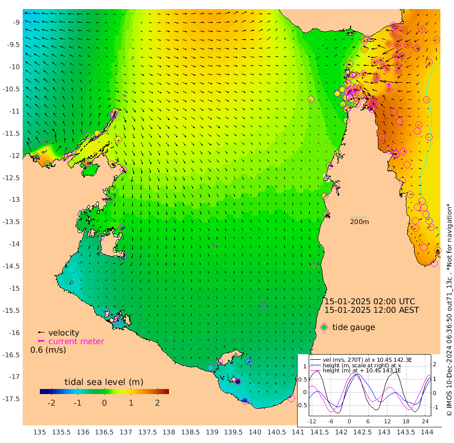 24cm/s 116T +3cm/s rms + 7cm/s -42T. ARA-GOC87 57m 36cm/s 165T +3cm/s rms + 2cm/s -2T. ARA-GOC87 60m 13cm/s 113T +2cm/s rms + 3cm/s 61T. ARA-GOC87 47m 177cm Daru 181cm Bobo Island 117cm Meer Island Barge 145cm Bramble Cay 169cm Unnamed Cay 185cm Pearce Cay 167cm Stephens Island 166cm Merrie England Shoals 178cm Mutacomal Reef 157cm Darnley Island Barge 130cm East Cay 167cm Yorke Island Barge 175cm Rennel Island 175cm Aureed Island 172cm Dungeness Reef 148cm Zagai Island 150cm Yam Island 121cm Dauan Island 112cm Saibai Island 117cm Phipi Reef 158cm Warrior Reef - West 99cm Mabuiag Island Barge 171cm Half Way Island 175cm Coconut Island 180cm Dugong Islet 165cm Poll Island 164cm Kirkcaldie Reef 153cm Suarji Island 156cm Sue Islet 105cm Hawkesbury Island 149cm Alert Patches 155cm Twin Island 95cm Badu Island 149cm St Pauls (Moa Island) 113cm Kubin (Moa Island) 130cm Ince Point 118cm Thursday Island 120cm Nardana Patches 112cm Turtle Head 94cm Round Island 92cm Goods Island 70cm Booby Island 79cm White Rocks Area 48cm Carpentaria 133cm Papou Point 88cm Bampfield Head 50cm Crab Island 78cm Red Wallis Island 108cm Packe Island 191cm Harrington Reef 91cm Herald Camp 33cm Sharp Point 97cm Red Island Point 121cm Possession Island 144cm Alpha Rock 170cm Frederick Point 183cm Wyborn Reef Light 181cm Tetley Island 119cm Triangle Reef 193cm Turtle Head Island 120cm Maclennan Cay 90cm Raine Island 164cm Mcsweeny Reef 150cm Collette Reef 113cm Shadwell Reef 160cm Hannibal Island 153cm Round Point 39cm Vrilya Point 134cm Cape Grenville 130cm Hicks Island 137cm Sir Charles Hardy Island 42cm Harvey Island 120cm Kay Reef 104cm Rocky Island 102cm Chapman Island 97cm Ham Reef 102cm Jubilee Reef 97cm Night Island 100cm Unnamed Reef No. 3 107cm Morris Island 97cm 1st 3 Mile Opening 105cm Creech Reef 113cm Fife Island 115cm Eden Reef 107cm Stanley Island 120cm Normanby River 3cm Yabooma Island 20cm Hutchison River -9cm Elcho Island -14cm North West Crocodile Island 47cm Cape Wessel 16cm Stevens Island 79cm Guluwuru Island 6cm Hopeful Bay 31cm Auster Point 32cm Two Island Bay 58cm Cadell Strait 156cm Mallison Island 57cm Melville Bay (Gove Harbour) 69cm Truant Island 43cm Cape Arnhem 4cm Cape Grey -14cm Hawk Island -73cm Milner Bay (Groote Eylandt) -70cm Cape Beatrice -108cm West Island -113cm Centre Island -92cm Mornington Island -85cm West Wellesley Islands -117cm Bountiful Island -179cm Albert River Mouth -199cm Sweers Island -165cm Karumba -41cm Nassau River Offshore 10cm Christmas Creek 28cm Archer River 46cm Boyd Point 39cm Weipa (Humbug Point) 28cm Pennefather River 40cm Cullen Point