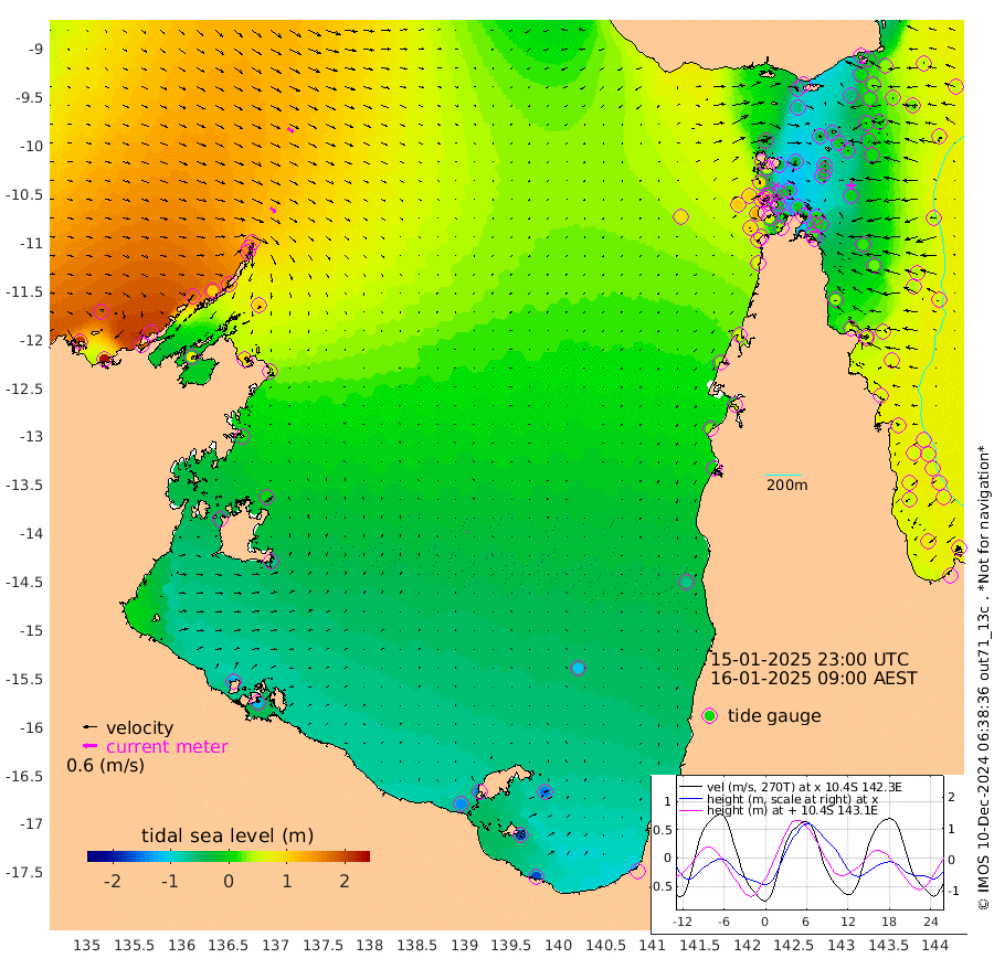 29cm/s 128T +3cm/s rms + 7cm/s -42T. ARA-GOC87 57m 3cm/s 95T +3cm/s rms + 2cm/s -2T. ARA-GOC87 60m 30cm/s 123T +2cm/s rms + 3cm/s 61T. ARA-GOC87 47m -11cm Daru 0cm Bobo Island 47cm Meer Island Barge 46cm Bramble Cay 26cm Unnamed Cay 18cm Pearce Cay 25cm Stephens Island 32cm Merrie England Shoals 6cm Mutacomal Reef 24cm Darnley Island Barge 51cm East Cay 6cm Yorke Island Barge 10cm Rennel Island -3cm Aureed Island -14cm Dungeness Reef -46cm Zagai Island -39cm Yam Island -57cm Dauan Island -54cm Saibai Island -64cm Phipi Reef -58cm Warrior Reef - West -16cm Mabuiag Island Barge 6cm Half Way Island -8cm Coconut Island -4cm Dugong Islet -23cm Poll Island -24cm Kirkcaldie Reef -40cm Suarji Island -28cm Sue Islet 96cm Hawkesbury Island -15cm Alert Patches -19cm Twin Island 61cm Badu Island -35cm St Pauls (Moa Island) 51cm Kubin (Moa Island) -3cm Ince Point 13cm Thursday Island 8cm Nardana Patches 39cm Turtle Head 67cm Round Island 89cm Goods Island 106cm Booby Island 105cm White Rocks Area 87cm Carpentaria -17cm Papou Point 131cm Bampfield Head 77cm Crab Island 94cm Red Wallis Island 63cm Packe Island -9cm Harrington Reef 84cm Herald Camp -30cm Sharp Point 32cm Red Island Point 13cm Possession Island -14cm Alpha Rock -15cm Frederick Point 8cm Wyborn Reef Light 1cm Tetley Island 38cm Triangle Reef 19cm Turtle Head Island 43cm Maclennan Cay 58cm Raine Island 18cm Mcsweeny Reef 26cm Collette Reef 43cm Shadwell Reef 33cm Hannibal Island 52cm Round Point 71cm Vrilya Point 47cm Cape Grenville 46cm Hicks Island 54cm Sir Charles Hardy Island 11cm Harvey Island 63cm Kay Reef 57cm Rocky Island 66cm Chapman Island 61cm Ham Reef 57cm Jubilee Reef 45cm Night Island 61cm Unnamed Reef No. 3 61cm Morris Island 60cm 1st 3 Mile Opening 56cm Creech Reef 46cm Fife Island 79cm Eden Reef 64cm Stanley Island 69cm Normanby River 206cm Yabooma Island 230cm Hutchison River 199cm Elcho Island 184cm North West Crocodile Island 134cm Cape Wessel 178cm Stevens Island 104cm Guluwuru Island 169cm Hopeful Bay 149cm Auster Point 148cm Two Island Bay 169cm Cadell Strait 73cm Mallison Island 94cm Melville Bay (Gove Harbour) 105cm Truant Island 52cm Cape Arnhem 13cm Cape Grey -5cm Hawk Island -48cm Milner Bay (Groote Eylandt) -61cm Cape Beatrice -117cm West Island -115cm Centre Island -144cm Mornington Island -140cm West Wellesley Islands -149cm Bountiful Island -167cm Albert River Mouth -179cm Sweers Island -173cm Karumba -108cm Nassau River Offshore -61cm Christmas Creek 10cm Archer River 29cm Boyd Point 39cm Weipa (Humbug Point) 35cm Pennefather River 59cm Cullen Point