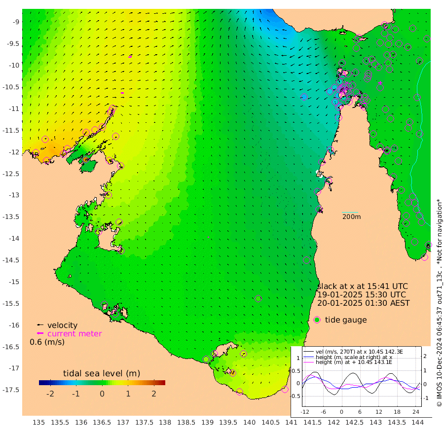 29cm/s 91T +3cm/s rms + 7cm/s -42T. ARA-GOC87 57m 10cm/s -27T +3cm/s rms + 2cm/s -2T. ARA-GOC87 60m 32cm/s 78T +2cm/s rms + 3cm/s 61T. ARA-GOC87 47m -3cm Daru 2cm Bobo Island -9cm Meer Island Barge -2cm Bramble Cay -8cm Unnamed Cay 2cm Pearce Cay -9cm Stephens Island -6cm Merrie England Shoals -9cm Mutacomal Reef -7cm Darnley Island Barge -10cm East Cay -7cm Yorke Island Barge -13cm Rennel Island -5cm Aureed Island -13cm Dungeness Reef -8cm Zagai Island -28cm Yam Island -11cm Dauan Island -10cm Saibai Island 0cm Phipi Reef -7cm Warrior Reef - West -31cm Mabuiag Island Barge -18cm Half Way Island -8cm Coconut Island -25cm Dugong Islet -18cm Poll Island -28cm Kirkcaldie Reef -28cm Suarji Island -17cm Sue Islet -87cm Hawkesbury Island -35cm Alert Patches -36cm Twin Island -55cm Badu Island -34cm St Pauls (Moa Island) -73cm Kubin (Moa Island) -48cm Ince Point -58cm Thursday Island -55cm Nardana Patches -65cm Turtle Head -79cm Round Island -84cm Goods Island -103cm Booby Island -97cm White Rocks Area -118cm Carpentaria -36cm Papou Point -116cm Bampfield Head -83cm Crab Island -102cm Red Wallis Island -84cm Packe Island -21cm Harrington Reef -117cm Herald Camp -8cm Sharp Point -56cm Red Island Point -51cm Possession Island -32cm Alpha Rock -26cm Frederick Point -6cm Wyborn Reef Light -9cm Tetley Island -8cm Triangle Reef -13cm Turtle Head Island -20cm Maclennan Cay -9cm Raine Island -6cm Mcsweeny Reef -3cm Collette Reef -6cm Shadwell Reef -2cm Hannibal Island -2cm Round Point -85cm Vrilya Point -15cm Cape Grenville -12cm Hicks Island -23cm Sir Charles Hardy Island -5cm Harvey Island -12cm Kay Reef -10cm Rocky Island -5cm Chapman Island -13cm Ham Reef -11cm Jubilee Reef -11cm Night Island -12cm Unnamed Reef No. 3 -11cm Morris Island -16cm 1st 3 Mile Opening -15cm Creech Reef -1cm Fife Island -10cm Eden Reef -15cm Stanley Island -13cm Normanby River 87cm Yabooma Island 111cm Hutchison River 95cm Elcho Island 89cm North West Crocodile Island 71cm Cape Wessel 107cm Stevens Island 86cm Guluwuru Island 93cm Hopeful Bay 80cm Auster Point 71cm Two Island Bay 127cm Cadell Strait 159cm Mallison Island 86cm Melville Bay (Gove Harbour) 86cm Truant Island 63cm Cape Arnhem 54cm Cape Grey 50cm Hawk Island 39cm Milner Bay (Groote Eylandt) 30cm Cape Beatrice 8cm West Island 5cm Centre Island 38cm Mornington Island 34cm West Wellesley Islands 57cm Bountiful Island 89cm Albert River Mouth 116cm Sweers Island 81cm Karumba 18cm Nassau River Offshore -13cm Christmas Creek -30cm Archer River -53cm Boyd Point -52cm Weipa (Humbug Point) -45cm Pennefather River -85cm Cullen Point