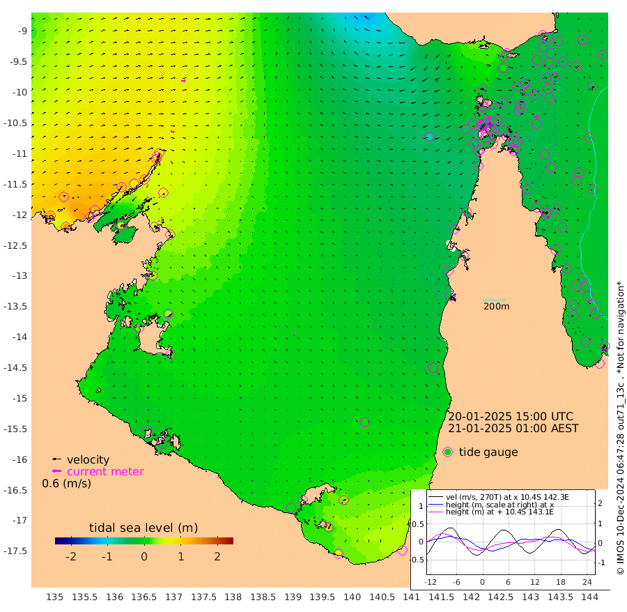 25cm/s 102T +3cm/s rms + 7cm/s -42T. ARA-GOC87 57m 10cm/s -31T +3cm/s rms + 2cm/s -2T. ARA-GOC87 60m 27cm/s 88T +2cm/s rms + 3cm/s 61T. ARA-GOC87 47m -18cm Daru -19cm Bobo Island -20cm Meer Island Barge -17cm Bramble Cay -22cm Unnamed Cay -16cm Pearce Cay -25cm Stephens Island -21cm Merrie England Shoals -23cm Mutacomal Reef -24cm Darnley Island Barge -24cm East Cay -24cm Yorke Island Barge -26cm Rennel Island -26cm Aureed Island -22cm Dungeness Reef -19cm Zagai Island -30cm Yam Island -4cm Dauan Island -13cm Saibai Island 8cm Phipi Reef -17cm Warrior Reef - West -16cm Mabuiag Island Barge -29cm Half Way Island -24cm Coconut Island -35cm Dugong Islet -25cm Poll Island -32cm Kirkcaldie Reef -32cm Suarji Island -26cm Sue Islet -31cm Hawkesbury Island -28cm Alert Patches -32cm Twin Island -14cm Badu Island -28cm St Pauls (Moa Island) -33cm Kubin (Moa Island) -31cm Ince Point -34cm Thursday Island -32cm Nardana Patches -32cm Turtle Head -33cm Round Island -36cm Goods Island -47cm Booby Island -46cm White Rocks Area -80cm Carpentaria -29cm Papou Point -59cm Bampfield Head -34cm Crab Island -52cm Red Wallis Island -42cm Packe Island -35cm Harrington Reef -58cm Herald Camp -9cm Sharp Point -26cm Red Island Point -30cm Possession Island -34cm Alpha Rock -30cm Frederick Point -20cm Wyborn Reef Light -21cm Tetley Island -20cm Triangle Reef -18cm Turtle Head Island -30cm Maclennan Cay -17cm Raine Island -22cm Mcsweeny Reef -19cm Collette Reef -17cm Shadwell Reef -20cm Hannibal Island -16cm Round Point -38cm Vrilya Point -27cm Cape Grenville -23cm Hicks Island -37cm Sir Charles Hardy Island -9cm Harvey Island -26cm Kay Reef -21cm Rocky Island -17cm Chapman Island -24cm Ham Reef -21cm Jubilee Reef -21cm Night Island -24cm Unnamed Reef No. 3 -22cm Morris Island -22cm 1st 3 Mile Opening -25cm Creech Reef -16cm Fife Island -22cm Eden Reef -25cm Stanley Island -26cm Normanby River 120cm Yabooma Island 137cm Hutchison River 120cm Elcho Island 116cm North West Crocodile Island 65cm Cape Wessel 120cm Stevens Island 65cm Guluwuru Island 107cm Hopeful Bay 88cm Auster Point 84cm Two Island Bay 134cm Cadell Strait 81cm Mallison Island 72cm Melville Bay (Gove Harbour) 71cm Truant Island 47cm Cape Arnhem 39cm Cape Grey 38cm Hawk Island 26cm Milner Bay (Groote Eylandt) 17cm Cape Beatrice -8cm West Island -9cm Centre Island 19cm Mornington Island 12cm West Wellesley Islands 37cm Bountiful Island 69cm Albert River Mouth 93cm Sweers Island 68cm Karumba 11cm Nassau River Offshore -11cm Christmas Creek -14cm Archer River -33cm Boyd Point -27cm Weipa (Humbug Point) -15cm Pennefather River -45cm Cullen Point