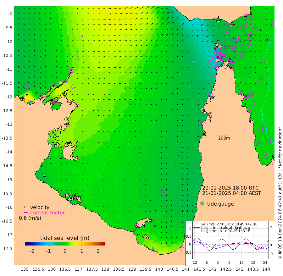 22cm/s 84T +3cm/s rms + 7cm/s -42T. ARA-GOC87 57m 7cm/s 40T +3cm/s rms + 2cm/s -2T. ARA-GOC87 60m 22cm/s 74T +2cm/s rms + 3cm/s 61T. ARA-GOC87 47m -11cm Daru -1cm Bobo Island 0cm Meer Island Barge -3cm Bramble Cay -12cm Unnamed Cay -7cm Pearce Cay -9cm Stephens Island -9cm Merrie England Shoals -18cm Mutacomal Reef 0cm Darnley Island Barge -3cm East Cay -4cm Yorke Island Barge -18cm Rennel Island -4cm Aureed Island -25cm Dungeness Reef -16cm Zagai Island -40cm Yam Island -38cm Dauan Island -20cm Saibai Island -36cm Phipi Reef -23cm Warrior Reef - West -44cm Mabuiag Island Barge -22cm Half Way Island -12cm Coconut Island -29cm Dugong Islet -30cm Poll Island -36cm Kirkcaldie Reef -37cm Suarji Island -18cm Sue Islet -105cm Hawkesbury Island -44cm Alert Patches -44cm Twin Island -78cm Badu Island -46cm St Pauls (Moa Island) -89cm Kubin (Moa Island) -58cm Ince Point -67cm Thursday Island -65cm Nardana Patches -79cm Turtle Head -90cm Round Island -97cm Goods Island -103cm Booby Island -106cm White Rocks Area -70cm Carpentaria -44cm Papou Point -101cm Bampfield Head -83cm Crab Island -103cm Red Wallis Island -96cm Packe Island -23cm Harrington Reef -119cm Herald Camp -9cm Sharp Point -67cm Red Island Point -57cm Possession Island -34cm Alpha Rock -31cm Frederick Point -13cm Wyborn Reef Light -16cm Tetley Island -3cm Triangle Reef -20cm Turtle Head Island -11cm Maclennan Cay -2cm Raine Island -6cm Mcsweeny Reef -1cm Collette Reef 0cm Shadwell Reef -1cm Hannibal Island -4cm Round Point -71cm Vrilya Point -8cm Cape Grenville -8cm Hicks Island -11cm Sir Charles Hardy Island -3cm Harvey Island -2cm Kay Reef -2cm Rocky Island 2cm Chapman Island 1cm Ham Reef 0cm Jubilee Reef -3cm Night Island 1cm Unnamed Reef No. 3 -2cm Morris Island -7cm 1st 3 Mile Opening -3cm Creech Reef 6cm Fife Island 0cm Eden Reef -5cm Stanley Island -6cm Normanby River -30cm Yabooma Island -14cm Hutchison River -12cm Elcho Island -21cm North West Crocodile Island 28cm Cape Wessel 11cm Stevens Island 58cm Guluwuru Island 9cm Hopeful Bay 16cm Auster Point 7cm Two Island Bay 26cm Cadell Strait 180cm Mallison Island 48cm Melville Bay (Gove Harbour) 51cm Truant Island 44cm Cape Arnhem 38cm Cape Grey 31cm Hawk Island 26cm Milner Bay (Groote Eylandt) 16cm Cape Beatrice 10cm West Island 10cm Centre Island 10cm Mornington Island 5cm West Wellesley Islands 3cm Bountiful Island 6cm Albert River Mouth 36cm Sweers Island 1cm Karumba -16cm Nassau River Offshore -30cm Christmas Creek -35cm Archer River -43cm Boyd Point -55cm Weipa (Humbug Point) -38cm Pennefather River -72cm Cullen Point