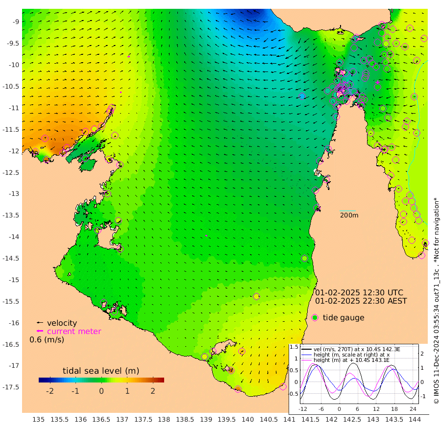 15cm/s 100T +3cm/s rms + 7cm/s -42T. ARA-GOC87 57m 17cm/s -61T +3cm/s rms + 2cm/s -2T. ARA-GOC87 60m 21cm/s 78T +2cm/s rms + 3cm/s 61T. ARA-GOC87 47m 12cm Daru 22cm Bobo Island 40cm Meer Island Barge 45cm Bramble Cay 28cm Unnamed Cay 40cm Pearce Cay 37cm Stephens Island 34cm Merrie England Shoals 11cm Mutacomal Reef 31cm Darnley Island Barge 45cm East Cay 17cm Yorke Island Barge 21cm Rennel Island 20cm Aureed Island 10cm Dungeness Reef -36cm Zagai Island -39cm Yam Island -56cm Dauan Island -78cm Saibai Island -19cm Phipi Reef -33cm Warrior Reef - West -74cm Mabuiag Island Barge 20cm Half Way Island 0cm Coconut Island 7cm Dugong Islet -16cm Poll Island -16cm Kirkcaldie Reef -36cm Suarji Island -35cm Sue Islet -65cm Hawkesbury Island -45cm Alert Patches -44cm Twin Island -59cm Badu Island -54cm St Pauls (Moa Island) -54cm Kubin (Moa Island) -55cm Ince Point -59cm Thursday Island -58cm Nardana Patches -49cm Turtle Head -53cm Round Island -51cm Goods Island -70cm Booby Island -59cm White Rocks Area -116cm Carpentaria -49cm Papou Point -81cm Bampfield Head -58cm Crab Island -70cm Red Wallis Island -49cm Packe Island 4cm Harrington Reef -67cm Herald Camp -23cm Sharp Point -48cm Red Island Point -42cm Possession Island -49cm Alpha Rock -25cm Frederick Point 1cm Wyborn Reef Light -10cm Tetley Island 23cm Triangle Reef 13cm Turtle Head Island 31cm Maclennan Cay 41cm Raine Island 25cm Mcsweeny Reef 28cm Collette Reef 32cm Shadwell Reef 38cm Hannibal Island 49cm Round Point -69cm Vrilya Point 38cm Cape Grenville 43cm Hicks Island 28cm Sir Charles Hardy Island 12cm Harvey Island 39cm Kay Reef 42cm Rocky Island 42cm Chapman Island 31cm Ham Reef 36cm Jubilee Reef 39cm Night Island 35cm Unnamed Reef No. 3 45cm Morris Island 40cm 1st 3 Mile Opening 40cm Creech Reef 48cm Fife Island 60cm Eden Reef 45cm Stanley Island 56cm Normanby River 148cm Yabooma Island 172cm Hutchison River 147cm Elcho Island 143cm North West Crocodile Island 63cm Cape Wessel 127cm Stevens Island 59cm Guluwuru Island 122cm Hopeful Bay 93cm Auster Point 92cm Two Island Bay 144cm Cadell Strait 3cm Mallison Island 69cm Melville Bay (Gove Harbour) 63cm Truant Island 41cm Cape Arnhem 37cm Cape Grey 46cm Hawk Island 36cm Milner Bay (Groote Eylandt) 37cm Cape Beatrice 15cm West Island 17cm Centre Island 78cm Mornington Island 72cm West Wellesley Islands 110cm Bountiful Island 156cm Albert River Mouth 170cm Sweers Island 154cm Karumba 71cm Nassau River Offshore 35cm Christmas Creek 3cm Archer River -32cm Boyd Point -15cm Weipa (Humbug Point) -31cm Pennefather River -62cm Cullen Point
