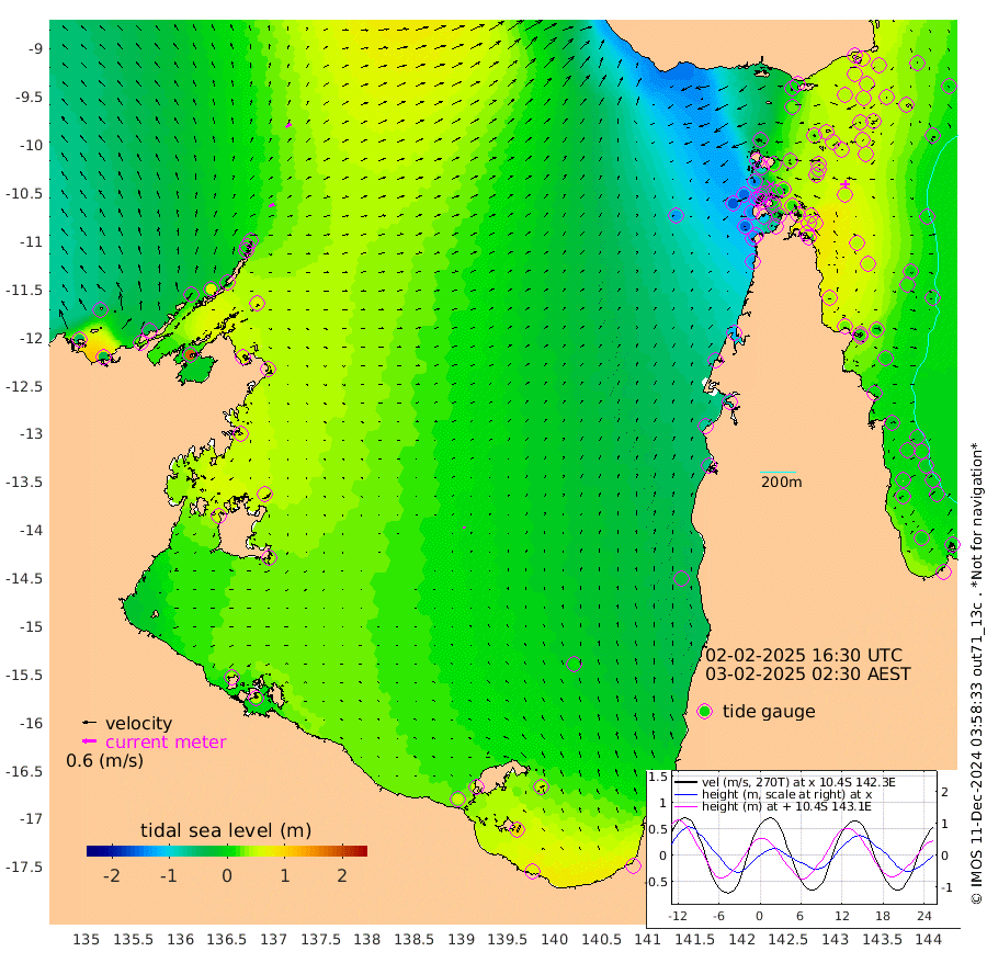 26cm/s 71T +3cm/s rms + 7cm/s -42T. ARA-GOC87 57m 9cm/s 15T +3cm/s rms + 2cm/s -2T. ARA-GOC87 60m 28cm/s 57T +2cm/s rms + 3cm/s 61T. ARA-GOC87 47m 60cm Daru 59cm Bobo Island 18cm Meer Island Barge 28cm Bramble Cay 44cm Unnamed Cay 44cm Pearce Cay 41cm Stephens Island 41cm Merrie England Shoals 47cm Mutacomal Reef 44cm Darnley Island Barge 12cm East Cay 52cm Yorke Island Barge 40cm Rennel Island 52cm Aureed Island 43cm Dungeness Reef 50cm Zagai Island 27cm Yam Island 11cm Dauan Island 14cm Saibai Island 25cm Phipi Reef 44cm Warrior Reef - West -22cm Mabuiag Island Barge 40cm Half Way Island 49cm Coconut Island 39cm Dugong Islet 37cm Poll Island 32cm Kirkcaldie Reef 29cm Suarji Island 42cm Sue Islet -140cm Hawkesbury Island 5cm Alert Patches 8cm Twin Island -102cm Badu Island 15cm St Pauls (Moa Island) -86cm Kubin (Moa Island) -25cm Ince Point -48cm Thursday Island -41cm Nardana Patches -78cm Turtle Head -93cm Round Island -131cm Goods Island -158cm Booby Island -154cm White Rocks Area -131cm Carpentaria 1cm Papou Point -142cm Bampfield Head -132cm Crab Island -155cm Red Wallis Island -111cm Packe Island 49cm Harrington Reef -139cm Herald Camp 13cm Sharp Point -80cm Red Island Point -23cm Possession Island 17cm Alpha Rock 28cm Frederick Point 52cm Wyborn Reef Light 49cm Tetley Island 12cm Triangle Reef 50cm Turtle Head Island 6cm Maclennan Cay -5cm Raine Island 44cm Mcsweeny Reef 39cm Collette Reef 17cm Shadwell Reef 43cm Hannibal Island 24cm Round Point -124cm Vrilya Point 17cm Cape Grenville 16cm Hicks Island 4cm Sir Charles Hardy Island 7cm Harvey Island 6cm Kay Reef 1cm Rocky Island -9cm Chapman Island -8cm Ham Reef 1cm Jubilee Reef 5cm Night Island -9cm Unnamed Reef No. 3 2cm Morris Island -1cm 1st 3 Mile Opening -1cm Creech Reef 11cm Fife Island -2cm Eden Reef 0cm Stanley Island 0cm Normanby River -48cm Yabooma Island -31cm Hutchison River -34cm Elcho Island -42cm North West Crocodile Island 15cm Cape Wessel 0cm Stevens Island 67cm Guluwuru Island -8cm Hopeful Bay 9cm Auster Point 7cm Two Island Bay 23cm Cadell Strait 185cm Mallison Island 58cm Melville Bay (Gove Harbour) 60cm Truant Island 56cm Cape Arnhem 55cm Cape Grey 54cm Hawk Island 54cm Milner Bay (Groote Eylandt) 43cm Cape Beatrice 45cm West Island 44cm Centre Island 56cm Mornington Island 49cm West Wellesley Islands 51cm Bountiful Island 64cm Albert River Mouth 102cm Sweers Island 58cm Karumba 9cm Nassau River Offshore -25cm Christmas Creek -64cm Archer River -73cm Boyd Point -90cm Weipa (Humbug Point) -71cm Pennefather River -116cm Cullen Point