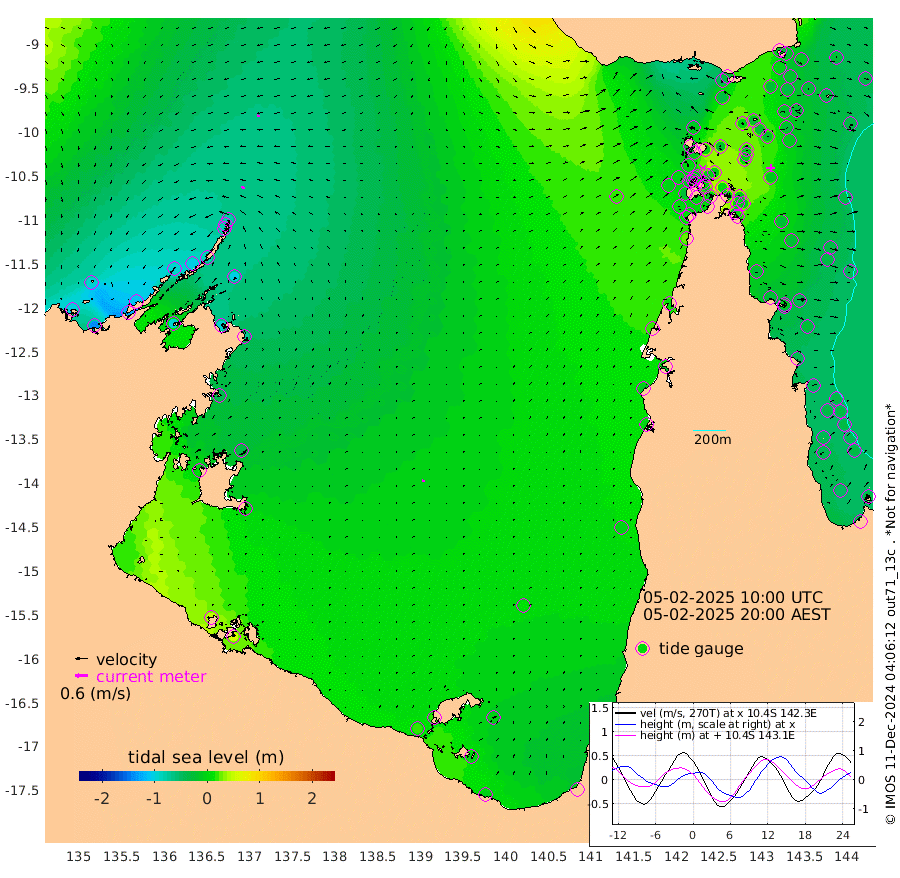 17cm/s -66T +3cm/s rms + 7cm/s -42T. ARA-GOC87 57m 11cm/s 24T +3cm/s rms + 2cm/s -2T. ARA-GOC87 60m 15cm/s -84T +2cm/s rms + 3cm/s 61T. ARA-GOC87 47m -19cm Daru -25cm Bobo Island -37cm Meer Island Barge -29cm Bramble Cay -18cm Unnamed Cay -31cm Pearce Cay -27cm Stephens Island -10cm Merrie England Shoals -4cm Mutacomal Reef -30cm Darnley Island Barge -35cm East Cay -24cm Yorke Island Barge -20cm Rennel Island -29cm Aureed Island -21cm Dungeness Reef -21cm Zagai Island -5cm Yam Island -41cm Dauan Island -26cm Saibai Island -37cm Phipi Reef -27cm Warrior Reef - West -8cm Mabuiag Island Barge -9cm Half Way Island -17cm Coconut Island -9cm Dugong Islet -10cm Poll Island 2cm Kirkcaldie Reef -20cm Suarji Island -6cm Sue Islet 0cm Hawkesbury Island -5cm Alert Patches -2cm Twin Island -18cm Badu Island -4cm St Pauls (Moa Island) -10cm Kubin (Moa Island) -3cm Ince Point 0cm Thursday Island -3cm Nardana Patches -14cm Turtle Head -10cm Round Island -16cm Goods Island -5cm Booby Island -3cm White Rocks Area 20cm Carpentaria 1cm Papou Point -23cm Bampfield Head 8cm Crab Island 5cm Red Wallis Island -4cm Packe Island -7cm Harrington Reef -3cm Herald Camp 10cm Sharp Point 7cm Red Island Point -8cm Possession Island 6cm Alpha Rock -6cm Frederick Point -13cm Wyborn Reef Light -10cm Tetley Island -33cm Triangle Reef -15cm Turtle Head Island -32cm Maclennan Cay -39cm Raine Island -24cm Mcsweeny Reef -24cm Collette Reef -32cm Shadwell Reef -25cm Hannibal Island -30cm Round Point 26cm Vrilya Point -22cm Cape Grenville -33cm Hicks Island -39cm Sir Charles Hardy Island -8cm Harvey Island -26cm Kay Reef -38cm Rocky Island -41cm Chapman Island -36cm Ham Reef -36cm Jubilee Reef -32cm Night Island -34cm Unnamed Reef No. 3 -39cm Morris Island -44cm 1st 3 Mile Opening -37cm Creech Reef -43cm Fife Island -47cm Eden Reef -32cm Stanley Island -33cm Normanby River -102cm Yabooma Island -138cm Hutchison River -109cm Elcho Island -93cm North West Crocodile Island -80cm Cape Wessel -94cm Stevens Island -102cm Guluwuru Island -89cm Hopeful Bay -87cm Auster Point -81cm Two Island Bay -122cm Cadell Strait -90cm Mallison Island -96cm Melville Bay (Gove Harbour) -100cm Truant Island -71cm Cape Arnhem -44cm Cape Grey -31cm Hawk Island 5cm Milner Bay (Groote Eylandt) 11cm Cape Beatrice 50cm West Island 54cm Centre Island 16cm Mornington Island 18cm West Wellesley Islands -6cm Bountiful Island -2cm Albert River Mouth -6cm Sweers Island 6cm Karumba 9cm Nassau River Offshore 0cm Christmas Creek -5cm Archer River -8cm Boyd Point -17cm Weipa (Humbug Point) 17cm Pennefather River 12cm Cullen Point