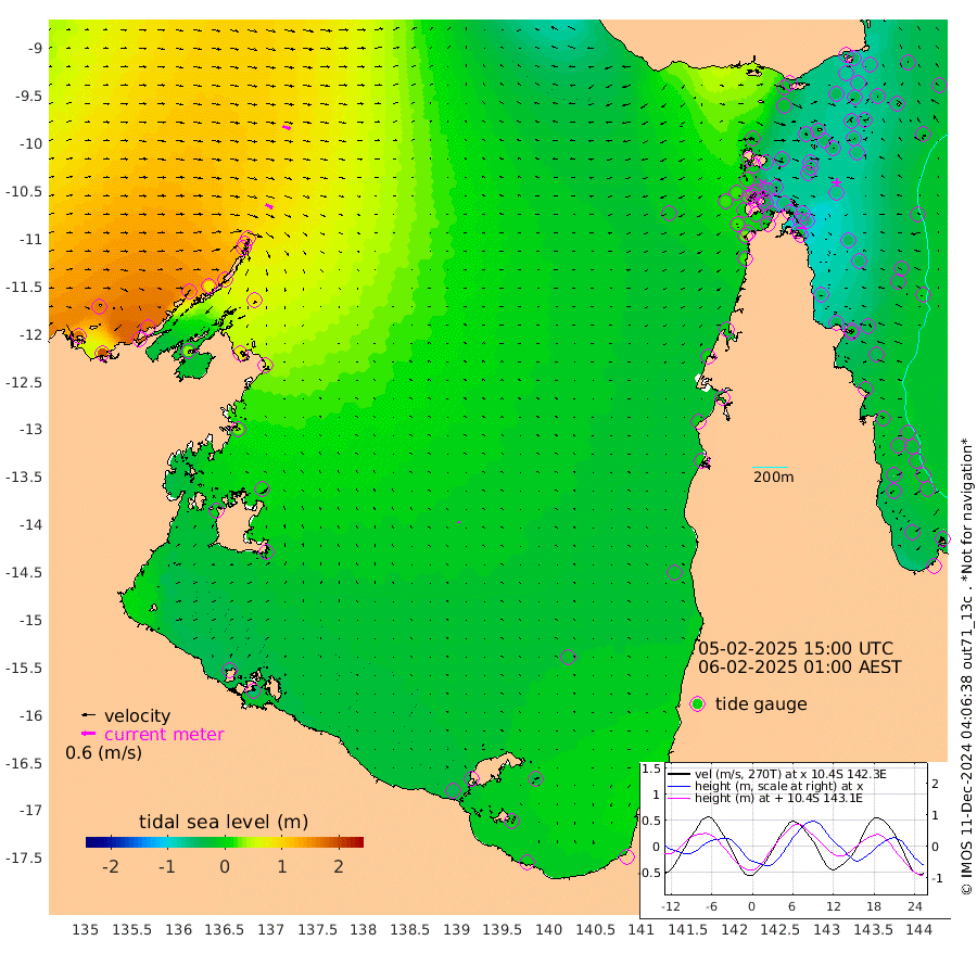 34cm/s 118T +3cm/s rms + 7cm/s -42T. ARA-GOC87 57m 7cm/s -25T +3cm/s rms + 2cm/s -2T. ARA-GOC87 60m 35cm/s 109T +2cm/s rms + 3cm/s 61T. ARA-GOC87 47m -57cm Daru -50cm Bobo Island -30cm Meer Island Barge -41cm Bramble Cay -62cm Unnamed Cay -39cm Pearce Cay -51cm Stephens Island -63cm Merrie England Shoals -68cm Mutacomal Reef -51cm Darnley Island Barge -33cm East Cay -56cm Yorke Island Barge -56cm Rennel Island -50cm Aureed Island -52cm Dungeness Reef -43cm Zagai Island -52cm Yam Island -10cm Dauan Island -26cm Saibai Island -17cm Phipi Reef -40cm Warrior Reef - West -18cm Mabuiag Island Barge -58cm Half Way Island -52cm Coconut Island -65cm Dugong Islet -50cm Poll Island -61cm Kirkcaldie Reef -51cm Suarji Island -60cm Sue Islet 9cm Hawkesbury Island -45cm Alert Patches -45cm Twin Island 24cm Badu Island -42cm St Pauls (Moa Island) -2cm Kubin (Moa Island) -30cm Ince Point -21cm Thursday Island -23cm Nardana Patches -5cm Turtle Head -8cm Round Island 16cm Goods Island 20cm Booby Island 17cm White Rocks Area -14cm Carpentaria -36cm Papou Point -3cm Bampfield Head 23cm Crab Island 16cm Red Wallis Island 3cm Packe Island -67cm Harrington Reef -13cm Herald Camp -21cm Sharp Point -5cm Red Island Point -32cm Possession Island -57cm Alpha Rock -52cm Frederick Point -60cm Wyborn Reef Light -59cm Tetley Island -26cm Triangle Reef -53cm Turtle Head Island -34cm Maclennan Cay -13cm Raine Island -52cm Mcsweeny Reef -50cm Collette Reef -33cm Shadwell Reef -55cm Hannibal Island -38cm Round Point 15cm Vrilya Point -48cm Cape Grenville -36cm Hicks Island -45cm Sir Charles Hardy Island -15cm Harvey Island -41cm Kay Reef -26cm Rocky Island -16cm Chapman Island -23cm Ham Reef -24cm Jubilee Reef -23cm Night Island -21cm Unnamed Reef No. 3 -26cm Morris Island -22cm 1st 3 Mile Opening -25cm Creech Reef -16cm Fife Island -23cm Eden Reef -32cm Stanley Island -32cm Normanby River 166cm Yabooma Island 190cm Hutchison River 167cm Elcho Island 160cm North West Crocodile Island 98cm Cape Wessel 150cm Stevens Island 77cm Guluwuru Island 133cm Hopeful Bay 115cm Auster Point 116cm Two Island Bay 172cm Cadell Strait 32cm Mallison Island 82cm Melville Bay (Gove Harbour) 86cm Truant Island 52cm Cape Arnhem 25cm Cape Grey 15cm Hawk Island -4cm Milner Bay (Groote Eylandt) -14cm Cape Beatrice -53cm West Island -54cm Centre Island -38cm Mornington Island -45cm West Wellesley Islands -34cm Bountiful Island -1cm Albert River Mouth 0cm Sweers Island -7cm Karumba -21cm Nassau River Offshore -20cm Christmas Creek 1cm Archer River -5cm Boyd Point 6cm Weipa (Humbug Point) 12cm Pennefather River 4cm Cullen Point