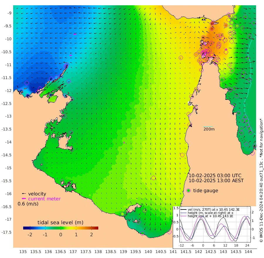 37cm/s -90T +3cm/s rms + 7cm/s -42T. ARA-GOC87 57m 28cm/s 179T +3cm/s rms + 2cm/s -2T. ARA-GOC87 60m 45cm/s -96T +2cm/s rms + 3cm/s 61T. ARA-GOC87 47m 80cm Daru 54cm Bobo Island -18cm Meer Island Barge -6cm Bramble Cay 36cm Unnamed Cay 40cm Pearce Cay 23cm Stephens Island 23cm Merrie England Shoals 69cm Mutacomal Reef 15cm Darnley Island Barge -18cm East Cay 46cm Yorke Island Barge 61cm Rennel Island 57cm Aureed Island 99cm Dungeness Reef 139cm Zagai Island 148cm Yam Island 199cm Dauan Island 176cm Saibai Island 193cm Phipi Reef 163cm Warrior Reef - West 166cm Mabuiag Island Barge 57cm Half Way Island 91cm Coconut Island 82cm Dugong Islet 122cm Poll Island 122cm Kirkcaldie Reef 166cm Suarji Island 120cm Sue Islet 146cm Hawkesbury Island 163cm Alert Patches 153cm Twin Island 159cm Badu Island 174cm St Pauls (Moa Island) 150cm Kubin (Moa Island) 162cm Ince Point 160cm Thursday Island 163cm Nardana Patches 159cm Turtle Head 139cm Round Island 139cm Goods Island 132cm Booby Island 127cm White Rocks Area 97cm Carpentaria 142cm Papou Point 125cm Bampfield Head 113cm Crab Island 132cm Red Wallis Island 146cm Packe Island 90cm Harrington Reef 146cm Herald Camp 58cm Sharp Point 135cm Red Island Point 140cm Possession Island 129cm Alpha Rock 126cm Frederick Point 76cm Wyborn Reef Light 90cm Tetley Island 8cm Triangle Reef 72cm Turtle Head Island -2cm Maclennan Cay -25cm Raine Island 37cm Mcsweeny Reef 22cm Collette Reef -5cm Shadwell Reef 13cm Hannibal Island -6cm Round Point 98cm Vrilya Point -6cm Cape Grenville -8cm Hicks Island -3cm Sir Charles Hardy Island 0cm Harvey Island -27cm Kay Reef -25cm Rocky Island -32cm Chapman Island -30cm Ham Reef -25cm Jubilee Reef -18cm Night Island -29cm Unnamed Reef No. 3 -29cm Morris Island -20cm 1st 3 Mile Opening -23cm Creech Reef -24cm Fife Island -52cm Eden Reef -33cm Stanley Island -44cm Normanby River -172cm Yabooma Island -191cm Hutchison River -178cm Elcho Island -165cm North West Crocodile Island -142cm Cape Wessel -176cm Stevens Island -124cm Guluwuru Island -169cm Hopeful Bay -147cm Auster Point -153cm Two Island Bay -179cm Cadell Strait -176cm Mallison Island -112cm Melville Bay (Gove Harbour) -119cm Truant Island -74cm Cape Arnhem -52cm Cape Grey -43cm Hawk Island -39cm Milner Bay (Groote Eylandt) -19cm Cape Beatrice 9cm West Island 5cm Centre Island 32cm Mornington Island 33cm West Wellesley Islands 26cm Bountiful Island 0cm Albert River Mouth -26cm Sweers Island 18cm Karumba 59cm Nassau River Offshore 80cm Christmas Creek 70cm Archer River 81cm Boyd Point 82cm Weipa (Humbug Point) 71cm Pennefather River 95cm Cullen Point