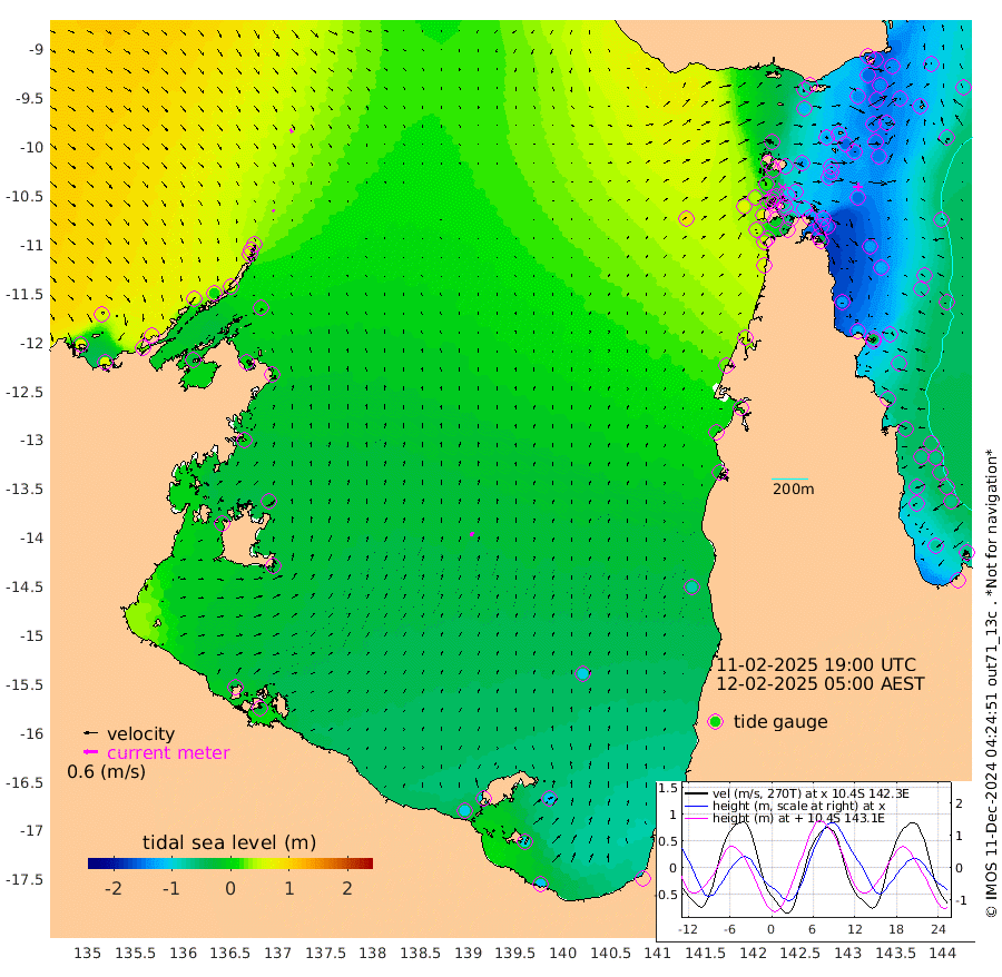 11cm/s 143T +3cm/s rms + 7cm/s -42T. ARA-GOC87 57m 19cm/s 23T +3cm/s rms + 2cm/s -2T. ARA-GOC87 60m 17cm/s 140T +2cm/s rms + 3cm/s 61T. ARA-GOC87 47m -157cm Daru -156cm Bobo Island -79cm Meer Island Barge -112cm Bramble Cay -138cm Unnamed Cay -154cm Pearce Cay -136cm Stephens Island -139cm Merrie England Shoals -155cm Mutacomal Reef -121cm Darnley Island Barge -94cm East Cay -135cm Yorke Island Barge -148cm Rennel Island -150cm Aureed Island -150cm Dungeness Reef -125cm Zagai Island -126cm Yam Island -88cm Dauan Island -74cm Saibai Island -117cm Phipi Reef -141cm Warrior Reef - West -44cm Mabuiag Island Barge -144cm Half Way Island -148cm Coconut Island -151cm Dugong Islet -138cm Poll Island -142cm Kirkcaldie Reef -130cm Suarji Island -124cm Sue Islet 22cm Hawkesbury Island -105cm Alert Patches -112cm Twin Island 5cm Badu Island -109cm St Pauls (Moa Island) -19cm Kubin (Moa Island) -73cm Ince Point -50cm Thursday Island -56cm Nardana Patches -32cm Turtle Head 4cm Round Island 20cm Goods Island 60cm Booby Island 39cm White Rocks Area 89cm Carpentaria -89cm Papou Point 70cm Bampfield Head 50cm Crab Island 43cm Red Wallis Island -12cm Packe Island -165cm Harrington Reef 29cm Herald Camp -35cm Sharp Point -31cm Red Island Point -60cm Possession Island -103cm Alpha Rock -134cm Frederick Point -146cm Wyborn Reef Light -142cm Tetley Island -79cm Triangle Reef -143cm Turtle Head Island -81cm Maclennan Cay -52cm Raine Island -133cm Mcsweeny Reef -120cm Collette Reef -78cm Shadwell Reef -130cm Hannibal Island -117cm Round Point 63cm Vrilya Point -100cm Cape Grenville -95cm Hicks Island -89cm Sir Charles Hardy Island -32cm Harvey Island -81cm Kay Reef -67cm Rocky Island -59cm Chapman Island -52cm Ham Reef -61cm Jubilee Reef -66cm Night Island -58cm Unnamed Reef No. 3 -69cm Morris Island -54cm 1st 3 Mile Opening -64cm Creech Reef -81cm Fife Island -69cm Eden Reef -67cm Stanley Island -82cm Normanby River 73cm Yabooma Island 64cm Hutchison River 74cm Elcho Island 67cm North West Crocodile Island 41cm Cape Wessel 57cm Stevens Island 6cm Guluwuru Island 59cm Hopeful Bay 49cm Auster Point 54cm Two Island Bay 30cm Cadell Strait -29cm Mallison Island 8cm Melville Bay (Gove Harbour) 14cm Truant Island 1cm Cape Arnhem -7cm Cape Grey -16cm Hawk Island -6cm Milner Bay (Groote Eylandt) -24cm Cape Beatrice -31cm West Island -27cm Centre Island -98cm Mornington Island -100cm West Wellesley Islands -107cm Bountiful Island -106cm Albert River Mouth -97cm Sweers Island -116cm Karumba -101cm Nassau River Offshore -79cm Christmas Creek -20cm Archer River 5cm Boyd Point 5cm Weipa (Humbug Point) 26cm Pennefather River 49cm Cullen Point