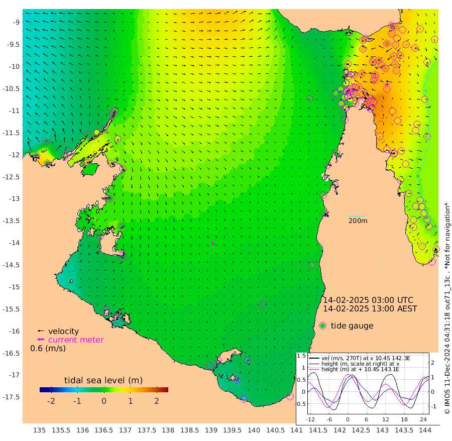 6cm/s 98T +3cm/s rms + 7cm/s -42T. ARA-GOC87 57m 30cm/s 169T +3cm/s rms + 2cm/s -2T. ARA-GOC87 60m 4cm/s -35T +2cm/s rms + 3cm/s 61T. ARA-GOC87 47m 140cm Daru 137cm Bobo Island 59cm Meer Island Barge 83cm Bramble Cay 112cm Unnamed Cay 127cm Pearce Cay 109cm Stephens Island 104cm Merrie England Shoals 133cm Mutacomal Reef 100cm Darnley Island Barge 68cm East Cay 119cm Yorke Island Barge 126cm Rennel Island 131cm Aureed Island 134cm Dungeness Reef 144cm Zagai Island 144cm Yam Island 139cm Dauan Island 132cm Saibai Island 125cm Phipi Reef 160cm Warrior Reef - West 101cm Mabuiag Island Barge 120cm Half Way Island 138cm Coconut Island 135cm Dugong Islet 141cm Poll Island 134cm Kirkcaldie Reef 141cm Suarji Island 136cm Sue Islet 63cm Hawkesbury Island 126cm Alert Patches 135cm Twin Island 62cm Badu Island 140cm St Pauls (Moa Island) 86cm Kubin (Moa Island) 112cm Ince Point 95cm Thursday Island 100cm Nardana Patches 80cm Turtle Head 66cm Round Island 45cm Goods Island 19cm Booby Island 26cm White Rocks Area 9cm Carpentaria 120cm Papou Point 35cm Bampfield Head 10cm Crab Island 34cm Red Wallis Island 74cm Packe Island 146cm Harrington Reef 59cm Herald Camp 40cm Sharp Point 67cm Red Island Point 98cm Possession Island 129cm Alpha Rock 143cm Frederick Point 142cm Wyborn Reef Light 146cm Tetley Island 72cm Triangle Reef 137cm Turtle Head Island 65cm Maclennan Cay 34cm Raine Island 111cm Mcsweeny Reef 96cm Collette Reef 59cm Shadwell Reef 98cm Hannibal Island 88cm Round Point -2cm Vrilya Point 73cm Cape Grenville 71cm Hicks Island 77cm Sir Charles Hardy Island 24cm Harvey Island 54cm Kay Reef 46cm Rocky Island 41cm Chapman Island 40cm Ham Reef 44cm Jubilee Reef 46cm Night Island 42cm Unnamed Reef No. 3 45cm Morris Island 34cm 1st 3 Mile Opening 43cm Creech Reef 59cm Fife Island 40cm Eden Reef 41cm Stanley Island 50cm Normanby River -38cm Yabooma Island -27cm Hutchison River -43cm Elcho Island -43cm North West Crocodile Island 20cm Cape Wessel -18cm Stevens Island 47cm Guluwuru Island -25cm Hopeful Bay -2cm Auster Point 5cm Two Island Bay 17cm Cadell Strait 123cm Mallison Island 33cm Melville Bay (Gove Harbour) 42cm Truant Island 30cm Cape Arnhem 0cm Cape Grey -4cm Hawk Island -49cm Milner Bay (Groote Eylandt) -44cm Cape Beatrice -64cm West Island -72cm Centre Island -46cm Mornington Island -47cm West Wellesley Islands -69cm Bountiful Island -111cm Albert River Mouth -126cm Sweers Island -96cm Karumba -18cm Nassau River Offshore 10cm Christmas Creek 3cm Archer River 20cm Boyd Point 9cm Weipa (Humbug Point) -5cm Pennefather River 12cm Cullen Point