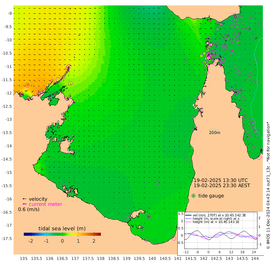 22cm/s 118T +3cm/s rms + 7cm/s -42T. ARA-GOC87 57m 15cm/s -10T +3cm/s rms + 2cm/s -2T. ARA-GOC87 60m 24cm/s 107T +2cm/s rms + 3cm/s 61T. ARA-GOC87 47m -8cm Daru -11cm Bobo Island -16cm Meer Island Barge -14cm Bramble Cay -13cm Unnamed Cay -5cm Pearce Cay -11cm Stephens Island -14cm Merrie England Shoals -13cm Mutacomal Reef -19cm Darnley Island Barge -17cm East Cay -17cm Yorke Island Barge -9cm Rennel Island -16cm Aureed Island -4cm Dungeness Reef -11cm Zagai Island -7cm Yam Island -4cm Dauan Island -25cm Saibai Island 7cm Phipi Reef -13cm Warrior Reef - West 0cm Mabuiag Island Barge -6cm Half Way Island -8cm Coconut Island -10cm Dugong Islet -3cm Poll Island -5cm Kirkcaldie Reef -6cm Suarji Island -16cm Sue Islet 29cm Hawkesbury Island 0cm Alert Patches 0cm Twin Island 27cm Badu Island 4cm St Pauls (Moa Island) 25cm Kubin (Moa Island) 6cm Ince Point 11cm Thursday Island 10cm Nardana Patches 16cm Turtle Head 29cm Round Island 24cm Goods Island 24cm Booby Island 25cm White Rocks Area -13cm Carpentaria 4cm Papou Point 24cm Bampfield Head 26cm Crab Island 19cm Red Wallis Island 22cm Packe Island -7cm Harrington Reef 23cm Herald Camp -5cm Sharp Point 13cm Red Island Point 16cm Possession Island -11cm Alpha Rock -4cm Frederick Point -7cm Wyborn Reef Light -6cm Tetley Island -16cm Triangle Reef 11cm Turtle Head Island -18cm Maclennan Cay -13cm Raine Island -13cm Mcsweeny Reef -17cm Collette Reef -18cm Shadwell Reef -18cm Hannibal Island -10cm Round Point 18cm Vrilya Point -19cm Cape Grenville -12cm Hicks Island -30cm Sir Charles Hardy Island -4cm Harvey Island -24cm Kay Reef -19cm Rocky Island -22cm Chapman Island -25cm Ham Reef -20cm Jubilee Reef -14cm Night Island -25cm Unnamed Reef No. 3 -18cm Morris Island -13cm 1st 3 Mile Opening -19cm Creech Reef -15cm Fife Island -21cm Eden Reef -20cm Stanley Island -19cm Normanby River 144cm Yabooma Island 154cm Hutchison River 135cm Elcho Island 133cm North West Crocodile Island 64cm Cape Wessel 121cm Stevens Island 38cm Guluwuru Island 106cm Hopeful Bay 92cm Auster Point 98cm Two Island Bay 125cm Cadell Strait -53cm Mallison Island 50cm Melville Bay (Gove Harbour) 52cm Truant Island 27cm Cape Arnhem 15cm Cape Grey 14cm Hawk Island 7cm Milner Bay (Groote Eylandt) -3cm Cape Beatrice -25cm West Island -23cm Centre Island -25cm Mornington Island -33cm West Wellesley Islands -26cm Bountiful Island -1cm Albert River Mouth 10cm Sweers Island 4cm Karumba -22cm Nassau River Offshore -26cm Christmas Creek -12cm Archer River -13cm Boyd Point -6cm Weipa (Humbug Point) 12cm Pennefather River 6cm Cullen Point