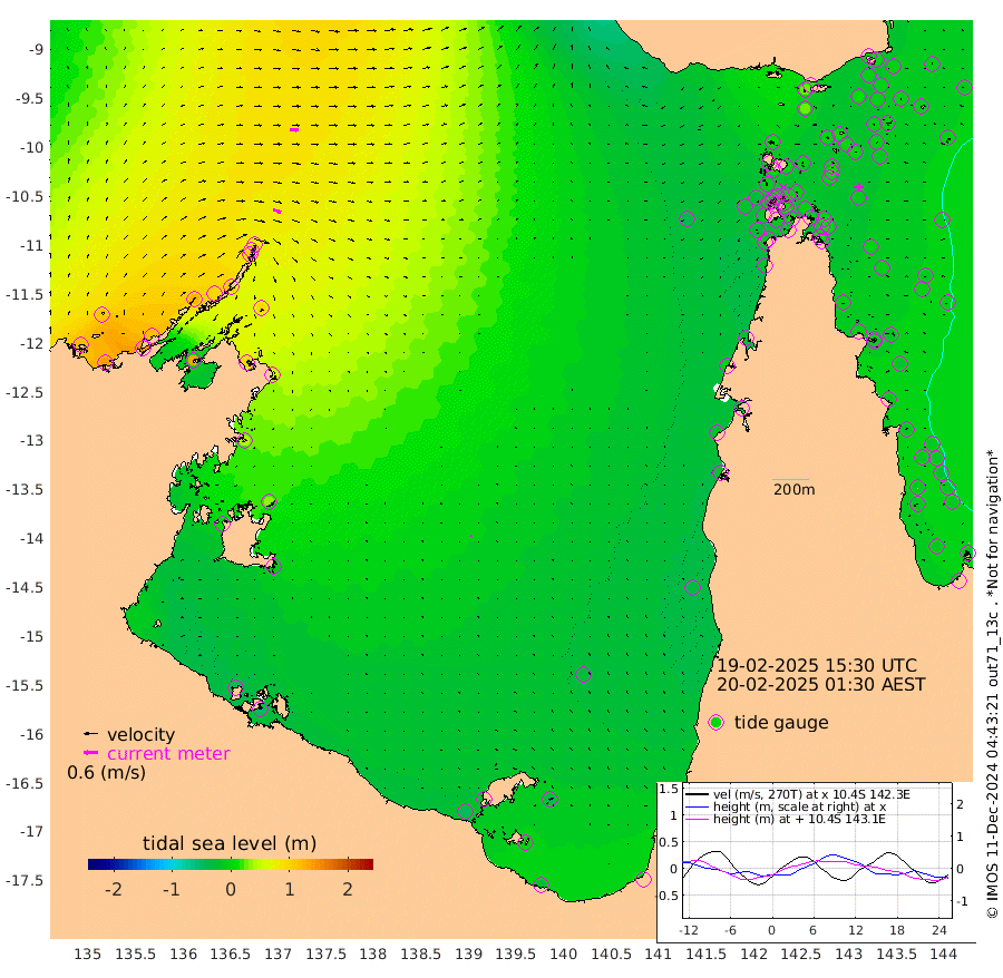 36cm/s 107T +3cm/s rms + 7cm/s -42T. ARA-GOC87 57m 5cm/s 14T +3cm/s rms + 2cm/s -2T. ARA-GOC87 60m 34cm/s 96T +2cm/s rms + 3cm/s 61T. ARA-GOC87 47m 6cm Daru 3cm Bobo Island -6cm Meer Island Barge -5cm Bramble Cay -3cm Unnamed Cay -1cm Pearce Cay -6cm Stephens Island -6cm Merrie England Shoals -4cm Mutacomal Reef -5cm Darnley Island Barge -12cm East Cay -1cm Yorke Island Barge -7cm Rennel Island -6cm Aureed Island 0cm Dungeness Reef 14cm Zagai Island 2cm Yam Island 25cm Dauan Island 16cm Saibai Island 30cm Phipi Reef 12cm Warrior Reef - West 10cm Mabuiag Island Barge -8cm Half Way Island 2cm Coconut Island -12cm Dugong Islet 0cm Poll Island -5cm Kirkcaldie Reef -4cm Suarji Island 1cm Sue Islet -4cm Hawkesbury Island -2cm Alert Patches -3cm Twin Island 12cm Badu Island 4cm St Pauls (Moa Island) 0cm Kubin (Moa Island) -3cm Ince Point -5cm Thursday Island -4cm Nardana Patches -6cm Turtle Head 4cm Round Island -10cm Goods Island -18cm Booby Island -24cm White Rocks Area -39cm Carpentaria 1cm Papou Point -8cm Bampfield Head -10cm Crab Island -25cm Red Wallis Island -12cm Packe Island -10cm Harrington Reef -15cm Herald Camp -1cm Sharp Point -9cm Red Island Point 3cm Possession Island -6cm Alpha Rock -3cm Frederick Point 6cm Wyborn Reef Light 7cm Tetley Island -5cm Triangle Reef 12cm Turtle Head Island -15cm Maclennan Cay -7cm Raine Island -4cm Mcsweeny Reef -4cm Collette Reef -4cm Shadwell Reef -4cm Hannibal Island -5cm Round Point -16cm Vrilya Point -14cm Cape Grenville -8cm Hicks Island -19cm Sir Charles Hardy Island -4cm Harvey Island -17cm Kay Reef -11cm Rocky Island -13cm Chapman Island -15cm Ham Reef -10cm Jubilee Reef -10cm Night Island -17cm Unnamed Reef No. 3 -12cm Morris Island -8cm 1st 3 Mile Opening -14cm Creech Reef -9cm Fife Island -14cm Eden Reef -16cm Stanley Island -19cm Normanby River 114cm Yabooma Island 138cm Hutchison River 115cm Elcho Island 106cm North West Crocodile Island 81cm Cape Wessel 121cm Stevens Island 95cm Guluwuru Island 105cm Hopeful Bay 98cm Auster Point 100cm Two Island Bay 142cm Cadell Strait 132cm Mallison Island 92cm Melville Bay (Gove Harbour) 97cm Truant Island 64cm Cape Arnhem 40cm Cape Grey 31cm Hawk Island 5cm Milner Bay (Groote Eylandt) -12cm Cape Beatrice -48cm West Island -47cm Centre Island -36cm Mornington Island -49cm West Wellesley Islands -38cm Bountiful Island -25cm Albert River Mouth -7cm Sweers Island -22cm Karumba -36cm Nassau River Offshore -34cm Christmas Creek -21cm Archer River -21cm Boyd Point -21cm Weipa (Humbug Point) -5cm Pennefather River -21cm Cullen Point