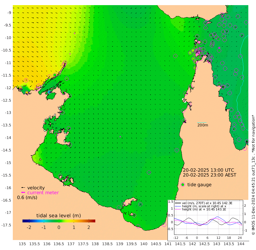 13cm/s 123T +3cm/s rms + 7cm/s -42T. ARA-GOC87 57m 19cm/s -3T +3cm/s rms + 2cm/s -2T. ARA-GOC87 60m 18cm/s 115T +2cm/s rms + 3cm/s 61T. ARA-GOC87 47m -27cm Daru -26cm Bobo Island -31cm Meer Island Barge -32cm Bramble Cay -32cm Unnamed Cay -19cm Pearce Cay -26cm Stephens Island -32cm Merrie England Shoals -30cm Mutacomal Reef -36cm Darnley Island Barge -31cm East Cay -33cm Yorke Island Barge -23cm Rennel Island -27cm Aureed Island -18cm Dungeness Reef -23cm Zagai Island -17cm Yam Island -24cm Dauan Island -42cm Saibai Island -21cm Phipi Reef -28cm Warrior Reef - West -11cm Mabuiag Island Barge -17cm Half Way Island -20cm Coconut Island -20cm Dugong Islet -12cm Poll Island -15cm Kirkcaldie Reef -11cm Suarji Island -29cm Sue Islet 19cm Hawkesbury Island -8cm Alert Patches -5cm Twin Island 13cm Badu Island -2cm St Pauls (Moa Island) 19cm Kubin (Moa Island) 1cm Ince Point 8cm Thursday Island 6cm Nardana Patches 10cm Turtle Head 19cm Round Island 19cm Goods Island 25cm Booby Island 30cm White Rocks Area 5cm Carpentaria 0cm Papou Point 20cm Bampfield Head 27cm Crab Island 26cm Red Wallis Island 21cm Packe Island -15cm Harrington Reef 18cm Herald Camp -6cm Sharp Point 8cm Red Island Point 7cm Possession Island -16cm Alpha Rock -11cm Frederick Point -23cm Wyborn Reef Light -21cm Tetley Island -29cm Triangle Reef -7cm Turtle Head Island -28cm Maclennan Cay -27cm Raine Island -29cm Mcsweeny Reef -35cm Collette Reef -35cm Shadwell Reef -37cm Hannibal Island -28cm Round Point 23cm Vrilya Point -33cm Cape Grenville -27cm Hicks Island -44cm Sir Charles Hardy Island -9cm Harvey Island -39cm Kay Reef -34cm Rocky Island -36cm Chapman Island -37cm Ham Reef -34cm Jubilee Reef -24cm Night Island -35cm Unnamed Reef No. 3 -32cm Morris Island -28cm 1st 3 Mile Opening -32cm Creech Reef -27cm Fife Island -38cm Eden Reef -34cm Stanley Island -31cm Normanby River 109cm Yabooma Island 108cm Hutchison River 100cm Elcho Island 101cm North West Crocodile Island 44cm Cape Wessel 85cm Stevens Island 3cm Guluwuru Island 71cm Hopeful Bay 64cm Auster Point 71cm Two Island Bay 78cm Cadell Strait -119cm Mallison Island 18cm Melville Bay (Gove Harbour) 20cm Truant Island 6cm Cape Arnhem -1cm Cape Grey 2cm Hawk Island 11cm Milner Bay (Groote Eylandt) 3cm Cape Beatrice -4cm West Island -1cm Centre Island -24cm Mornington Island -27cm West Wellesley Islands -33cm Bountiful Island -6cm Albert River Mouth -2cm Sweers Island -6cm Karumba -25cm Nassau River Offshore -32cm Christmas Creek -20cm Archer River -16cm Boyd Point -12cm Weipa (Humbug Point) 9cm Pennefather River 10cm Cullen Point