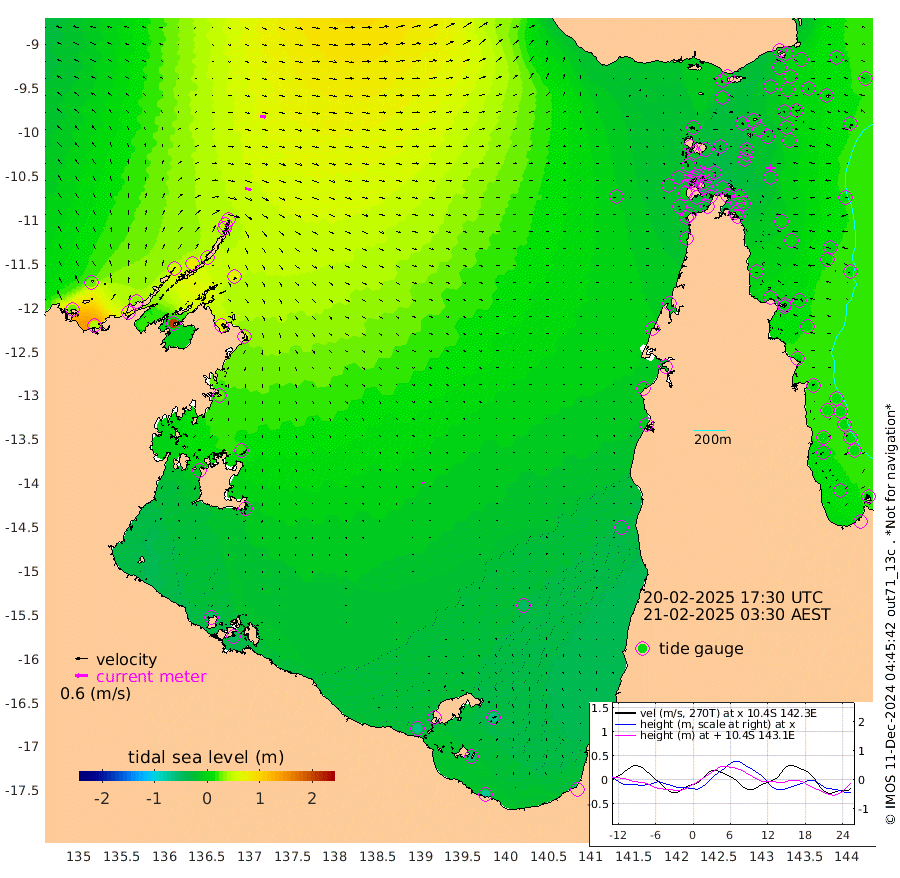 32cm/s 106T +3cm/s rms + 7cm/s -42T. ARA-GOC87 57m 8cm/s 128T +3cm/s rms + 2cm/s -2T. ARA-GOC87 60m 27cm/s 97T +2cm/s rms + 3cm/s 61T. ARA-GOC87 47m -4cm Daru -5cm Bobo Island 10cm Meer Island Barge 4cm Bramble Cay -1cm Unnamed Cay -9cm Pearce Cay -4cm Stephens Island -2cm Merrie England Shoals -10cm Mutacomal Reef 6cm Darnley Island Barge 2cm East Cay 1cm Yorke Island Barge -14cm Rennel Island -9cm Aureed Island -15cm Dungeness Reef -4cm Zagai Island -18cm Yam Island 1cm Dauan Island 6cm Saibai Island -3cm Phipi Reef -9cm Warrior Reef - West -9cm Mabuiag Island Barge -14cm Half Way Island -10cm Coconut Island -20cm Dugong Islet -18cm Poll Island -21cm Kirkcaldie Reef -29cm Suarji Island -8cm Sue Islet -19cm Hawkesbury Island -21cm Alert Patches -24cm Twin Island -10cm Badu Island -21cm St Pauls (Moa Island) -19cm Kubin (Moa Island) -22cm Ince Point -23cm Thursday Island -22cm Nardana Patches -23cm Turtle Head -12cm Round Island -21cm Goods Island -20cm Booby Island -35cm White Rocks Area -9cm Carpentaria -21cm Papou Point -4cm Bampfield Head -14cm Crab Island -29cm Red Wallis Island -25cm Packe Island -24cm Harrington Reef -21cm Herald Camp -7cm Sharp Point -27cm Red Island Point -16cm Possession Island -17cm Alpha Rock -20cm Frederick Point -4cm Wyborn Reef Light -5cm Tetley Island 6cm Triangle Reef -3cm Turtle Head Island -1cm Maclennan Cay 9cm Raine Island -2cm Mcsweeny Reef 4cm Collette Reef 12cm Shadwell Reef 5cm Hannibal Island 2cm Round Point -7cm Vrilya Point 0cm Cape Grenville 2cm Hicks Island 3cm Sir Charles Hardy Island 0cm Harvey Island 5cm Kay Reef 7cm Rocky Island 8cm Chapman Island 9cm Ham Reef 10cm Jubilee Reef 6cm Night Island 5cm Unnamed Reef No. 3 7cm Morris Island 10cm 1st 3 Mile Opening 7cm Creech Reef 5cm Fife Island 12cm Eden Reef 7cm Stanley Island 0cm Normanby River 27cm Yabooma Island 44cm Hutchison River 35cm Elcho Island 23cm North West Crocodile Island 49cm Cape Wessel 53cm Stevens Island 82cm Guluwuru Island 48cm Hopeful Bay 49cm Auster Point 52cm Two Island Bay 72cm Cadell Strait 207cm Mallison Island 68cm Melville Bay (Gove Harbour) 74cm Truant Island 53cm Cape Arnhem 27cm Cape Grey 17cm Hawk Island -10cm Milner Bay (Groote Eylandt) -25cm Cape Beatrice -54cm West Island -51cm Centre Island -52cm Mornington Island -62cm West Wellesley Islands -67cm Bountiful Island -74cm Albert River Mouth -59cm Sweers Island -74cm Karumba -47cm Nassau River Offshore -31cm Christmas Creek -12cm Archer River -7cm Boyd Point -12cm Weipa (Humbug Point) 4cm Pennefather River -9cm Cullen Point
