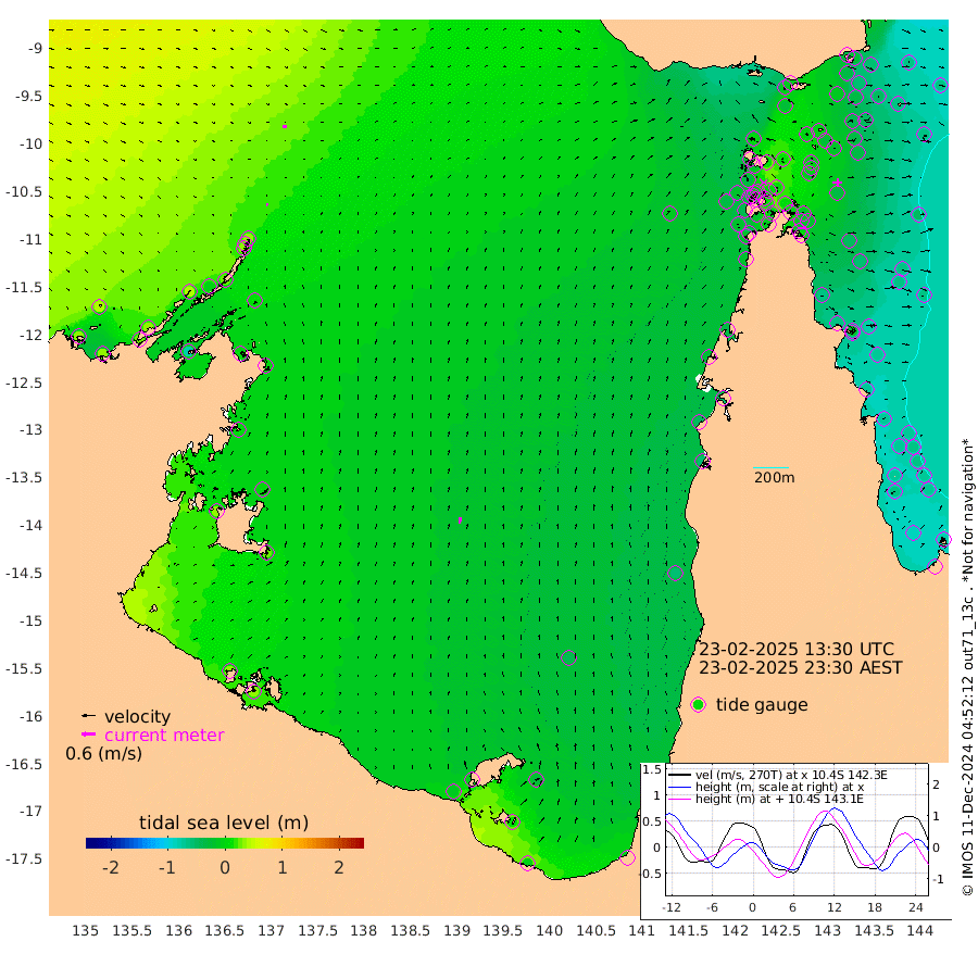 11cm/s 83T +3cm/s rms + 7cm/s -42T. ARA-GOC87 57m 30cm/s 9T +3cm/s rms + 2cm/s -2T. ARA-GOC87 60m 16cm/s 95T +2cm/s rms + 3cm/s 61T. ARA-GOC87 47m -33cm Daru -28cm Bobo Island -67cm Meer Island Barge -62cm Bramble Cay -53cm Unnamed Cay -37cm Pearce Cay -52cm Stephens Island -54cm Merrie England Shoals -34cm Mutacomal Reef -60cm Darnley Island Barge -66cm East Cay -46cm Yorke Island Barge -38cm Rennel Island -30cm Aureed Island -27cm Dungeness Reef 0cm Zagai Island -3cm Yam Island -12cm Dauan Island -8cm Saibai Island -23cm Phipi Reef -10cm Warrior Reef - West 5cm Mabuiag Island Barge -34cm Half Way Island -16cm Coconut Island -31cm Dugong Islet -5cm Poll Island -16cm Kirkcaldie Reef 9cm Suarji Island -15cm Sue Islet -33cm Hawkesbury Island -4cm Alert Patches 5cm Twin Island -16cm Badu Island 11cm St Pauls (Moa Island) -16cm Kubin (Moa Island) 0cm Ince Point -2cm Thursday Island -2cm Nardana Patches -20cm Turtle Head -25cm Round Island -31cm Goods Island -30cm Booby Island -15cm White Rocks Area -14cm Carpentaria 12cm Papou Point -39cm Bampfield Head -21cm Crab Island -19cm Red Wallis Island -21cm Packe Island -16cm Harrington Reef -47cm Herald Camp 7cm Sharp Point -10cm Red Island Point -8cm Possession Island 2cm Alpha Rock -4cm Frederick Point -23cm Wyborn Reef Light -16cm Tetley Island -51cm Triangle Reef -27cm Turtle Head Island -60cm Maclennan Cay -66cm Raine Island -45cm Mcsweeny Reef -55cm Collette Reef -66cm Shadwell Reef -61cm Hannibal Island -60cm Round Point -19cm Vrilya Point -65cm Cape Grenville -64cm Hicks Island -77cm Sir Charles Hardy Island -20cm Harvey Island -73cm Kay Reef -71cm Rocky Island -70cm Chapman Island -70cm Ham Reef -70cm Jubilee Reef -60cm Night Island -67cm Unnamed Reef No. 3 -72cm Morris Island -73cm 1st 3 Mile Opening -72cm Creech Reef -62cm Fife Island -88cm Eden Reef -79cm Stanley Island -75cm Normanby River 36cm Yabooma Island 31cm Hutchison River 36cm Elcho Island 41cm North West Crocodile Island 34cm Cape Wessel 40cm Stevens Island -7cm Guluwuru Island 24cm Hopeful Bay 31cm Auster Point 28cm Two Island Bay 23cm Cadell Strait -81cm Mallison Island 4cm Melville Bay (Gove Harbour) 8cm Truant Island 3cm Cape Arnhem 7cm Cape Grey 5cm Hawk Island 34cm Milner Bay (Groote Eylandt) 23cm Cape Beatrice 35cm West Island 35cm Centre Island -14cm Mornington Island -12cm West Wellesley Islands -26cm Bountiful Island -2cm Albert River Mouth 8cm Sweers Island -12cm Karumba -40cm Nassau River Offshore -59cm Christmas Creek -56cm Archer River -49cm Boyd Point -57cm Weipa (Humbug Point) -29cm Pennefather River -31cm Cullen Point
