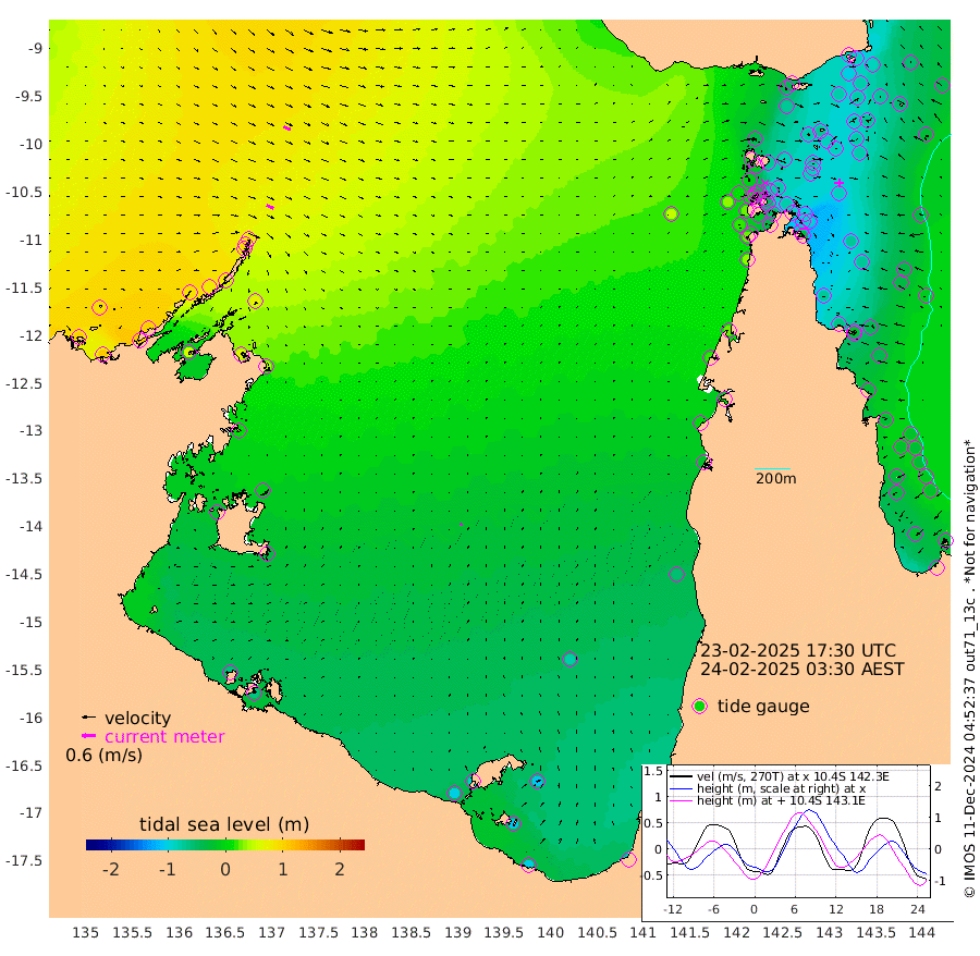 33cm/s 117T +3cm/s rms + 7cm/s -42T. ARA-GOC87 57m 8cm/s 54T +3cm/s rms + 2cm/s -2T. ARA-GOC87 60m 33cm/s 114T +2cm/s rms + 3cm/s 61T. ARA-GOC87 47m -89cm Daru -83cm Bobo Island -27cm Meer Island Barge -57cm Bramble Cay -81cm Unnamed Cay -77cm Pearce Cay -68cm Stephens Island -86cm Merrie England Shoals -102cm Mutacomal Reef -56cm Darnley Island Barge -42cm East Cay -70cm Yorke Island Barge -85cm Rennel Island -78cm Aureed Island -83cm Dungeness Reef -70cm Zagai Island -76cm Yam Island -44cm Dauan Island -48cm Saibai Island -69cm Phipi Reef -79cm Warrior Reef - West -40cm Mabuiag Island Barge -76cm Half Way Island -87cm Coconut Island -85cm Dugong Islet -83cm Poll Island -85cm Kirkcaldie Reef -89cm Suarji Island -79cm Sue Islet -1cm Hawkesbury Island -77cm Alert Patches -76cm Twin Island -1cm Badu Island -70cm St Pauls (Moa Island) -12cm Kubin (Moa Island) -52cm Ince Point -38cm Thursday Island -42cm Nardana Patches -25cm Turtle Head -12cm Round Island 9cm Goods Island 31cm Booby Island 12cm White Rocks Area 45cm Carpentaria -58cm Papou Point 26cm Bampfield Head 29cm Crab Island 18cm Red Wallis Island -12cm Packe Island -98cm Harrington Reef 3cm Herald Camp -28cm Sharp Point -31cm Red Island Point -49cm Possession Island -78cm Alpha Rock -85cm Frederick Point -93cm Wyborn Reef Light -92cm Tetley Island -36cm Triangle Reef -76cm Turtle Head Island -33cm Maclennan Cay -13cm Raine Island -73cm Mcsweeny Reef -68cm Collette Reef -36cm Shadwell Reef -72cm Hannibal Island -63cm Round Point 36cm Vrilya Point -56cm Cape Grenville -42cm Hicks Island -40cm Sir Charles Hardy Island -15cm Harvey Island -44cm Kay Reef -27cm Rocky Island -25cm Chapman Island -20cm Ham Reef -20cm Jubilee Reef -24cm Night Island -24cm Unnamed Reef No. 3 -26cm Morris Island -11cm 1st 3 Mile Opening -21cm Creech Reef -30cm Fife Island -18cm Eden Reef -27cm Stanley Island -35cm Normanby River 98cm Yabooma Island 111cm Hutchison River 101cm Elcho Island 90cm North West Crocodile Island 75cm Cape Wessel 88cm Stevens Island 76cm Guluwuru Island 76cm Hopeful Bay 80cm Auster Point 94cm Two Island Bay 110cm Cadell Strait 56cm Mallison Island 63cm Melville Bay (Gove Harbour) 72cm Truant Island 44cm Cape Arnhem 15cm Cape Grey -6cm Hawk Island -17cm Milner Bay (Groote Eylandt) -33cm Cape Beatrice -62cm West Island -61cm Centre Island -95cm Mornington Island -99cm West Wellesley Islands -110cm Bountiful Island -102cm Albert River Mouth -109cm Sweers Island -115cm Karumba -82cm Nassau River Offshore -58cm Christmas Creek -19cm Archer River 2cm Boyd Point 2cm Weipa (Humbug Point) 16cm Pennefather River 25cm Cullen Point