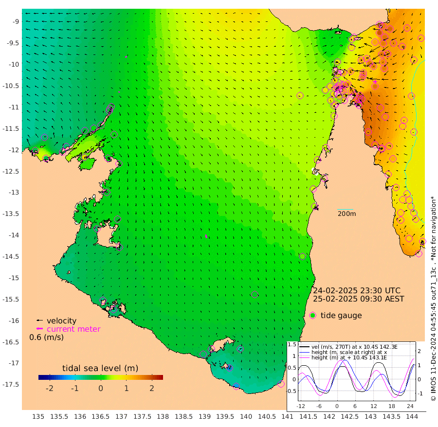 8cm/s -169T +3cm/s rms + 7cm/s -42T. ARA-GOC87 57m 34cm/s 167T +3cm/s rms + 2cm/s -2T. ARA-GOC87 60m 15cm/s -121T +2cm/s rms + 3cm/s 61T. ARA-GOC87 47m 169cm Daru 159cm Bobo Island 103cm Meer Island Barge 142cm Bramble Cay 172cm Unnamed Cay 163cm Pearce Cay 156cm Stephens Island 180cm Merrie England Shoals 189cm Mutacomal Reef 141cm Darnley Island Barge 115cm East Cay 150cm Yorke Island Barge 168cm Rennel Island 152cm Aureed Island 158cm Dungeness Reef 122cm Zagai Island 133cm Yam Island 86cm Dauan Island 78cm Saibai Island 93cm Phipi Reef 129cm Warrior Reef - West 89cm Mabuiag Island Barge 164cm Half Way Island 164cm Coconut Island 171cm Dugong Islet 154cm Poll Island 157cm Kirkcaldie Reef 141cm Suarji Island 143cm Sue Islet 112cm Hawkesbury Island 151cm Alert Patches 149cm Twin Island 97cm Badu Island 139cm St Pauls (Moa Island) 114cm Kubin (Moa Island) 130cm Ince Point 122cm Thursday Island 123cm Nardana Patches 118cm Turtle Head 103cm Round Island 103cm Goods Island 89cm Booby Island 100cm White Rocks Area 68cm Carpentaria 117cm Papou Point 104cm Bampfield Head 64cm Crab Island 97cm Red Wallis Island 122cm Packe Island 183cm Harrington Reef 99cm Herald Camp 33cm Sharp Point 92cm Red Island Point 117cm Possession Island 150cm Alpha Rock 163cm Frederick Point 184cm Wyborn Reef Light 181cm Tetley Island 106cm Triangle Reef 183cm Turtle Head Island 107cm Maclennan Cay 80cm Raine Island 159cm Mcsweeny Reef 148cm Collette Reef 109cm Shadwell Reef 161cm Hannibal Island 152cm Round Point 60cm Vrilya Point 137cm Cape Grenville 118cm Hicks Island 124cm Sir Charles Hardy Island 39cm Harvey Island 124cm Kay Reef 96cm Rocky Island 93cm Chapman Island 86cm Ham Reef 92cm Jubilee Reef 91cm Night Island 92cm Unnamed Reef No. 3 101cm Morris Island 88cm 1st 3 Mile Opening 95cm Creech Reef 101cm Fife Island 103cm Eden Reef 106cm Stanley Island 112cm Normanby River -43cm Yabooma Island -43cm Hutchison River -53cm Elcho Island -56cm North West Crocodile Island -14cm Cape Wessel -26cm Stevens Island 4cm Guluwuru Island -31cm Hopeful Bay -22cm Auster Point -29cm Two Island Bay -34cm Cadell Strait 101cm Mallison Island -2cm Melville Bay (Gove Harbour) 3cm Truant Island -2cm Cape Arnhem -22cm Cape Grey -22cm Hawk Island -57cm Milner Bay (Groote Eylandt) -48cm Cape Beatrice -61cm West Island -67cm Centre Island -55cm Mornington Island -46cm West Wellesley Islands -78cm Bountiful Island -128cm Albert River Mouth -145cm Sweers Island -118cm Karumba -10cm Nassau River Offshore 29cm Christmas Creek 43cm Archer River 54cm Boyd Point 51cm Weipa (Humbug Point) 49cm Pennefather River 56cm Cullen Point