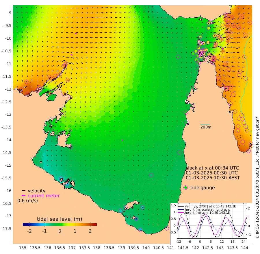 30cm/s 110T +3cm/s rms + 7cm/s -42T. ARA-GOC87 57m 21cm/s 173T +3cm/s rms + 2cm/s -2T. ARA-GOC87 60m 24cm/s 100T +2cm/s rms + 3cm/s 61T. ARA-GOC87 47m 155cm Daru 159cm Bobo Island 121cm Meer Island Barge 152cm Bramble Cay 165cm Unnamed Cay 171cm Pearce Cay 164cm Stephens Island 167cm Merrie England Shoals 162cm Mutacomal Reef 148cm Darnley Island Barge 134cm East Cay 148cm Yorke Island Barge 160cm Rennel Island 146cm Aureed Island 140cm Dungeness Reef 90cm Zagai Island 99cm Yam Island 43cm Dauan Island 31cm Saibai Island 44cm Phipi Reef 94cm Warrior Reef - West 35cm Mabuiag Island Barge 158cm Half Way Island 138cm Coconut Island 158cm Dugong Islet 122cm Poll Island 127cm Kirkcaldie Reef 87cm Suarji Island 108cm Sue Islet 57cm Hawkesbury Island 87cm Alert Patches 96cm Twin Island 43cm Badu Island 84cm St Pauls (Moa Island) 64cm Kubin (Moa Island) 70cm Ince Point 59cm Thursday Island 61cm Nardana Patches 56cm Turtle Head 40cm Round Island 46cm Goods Island 20cm Booby Island 37cm White Rocks Area -16cm Carpentaria 81cm Papou Point 23cm Bampfield Head 3cm Crab Island 25cm Red Wallis Island 53cm Packe Island 162cm Harrington Reef 28cm Herald Camp 9cm Sharp Point 47cm Red Island Point 61cm Possession Island 95cm Alpha Rock 123cm Frederick Point 159cm Wyborn Reef Light 150cm Tetley Island 107cm Triangle Reef 176cm Turtle Head Island 119cm Maclennan Cay 97cm Raine Island 153cm Mcsweeny Reef 141cm Collette Reef 111cm Shadwell Reef 157cm Hannibal Island 157cm Round Point -11cm Vrilya Point 136cm Cape Grenville 134cm Hicks Island 135cm Sir Charles Hardy Island 42cm Harvey Island 128cm Kay Reef 111cm Rocky Island 102cm Chapman Island 98cm Ham Reef 109cm Jubilee Reef 99cm Night Island 101cm Unnamed Reef No. 3 118cm Morris Island 105cm 1st 3 Mile Opening 109cm Creech Reef 118cm Fife Island 130cm Eden Reef 117cm Stanley Island 139cm Normanby River 165cm Yabooma Island 201cm Hutchison River 153cm Elcho Island 146cm North West Crocodile Island 131cm Cape Wessel 156cm Stevens Island 148cm Guluwuru Island 128cm Hopeful Bay 132cm Auster Point 141cm Two Island Bay 197cm Cadell Strait 156cm Mallison Island 125cm Melville Bay (Gove Harbour) 135cm Truant Island 80cm Cape Arnhem 40cm Cape Grey 12cm Hawk Island -43cm Milner Bay (Groote Eylandt) -43cm Cape Beatrice -96cm West Island -112cm Centre Island -88cm Mornington Island -80cm West Wellesley Islands -84cm Bountiful Island -112cm Albert River Mouth -135cm Sweers Island -116cm Karumba -49cm Nassau River Offshore -21cm Christmas Creek -9cm Archer River 1cm Boyd Point 1cm Weipa (Humbug Point) -13cm Pennefather River -13cm Cullen Point
