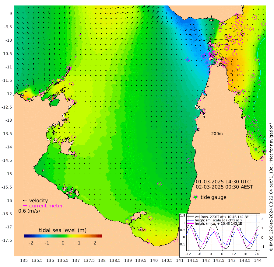 28cm/s 74T +3cm/s rms + 7cm/s -42T. ARA-GOC87 57m 12cm/s 4T +3cm/s rms + 2cm/s -2T. ARA-GOC87 60m 32cm/s 61T +2cm/s rms + 3cm/s 61T. ARA-GOC87 47m 115cm Daru 114cm Bobo Island 36cm Meer Island Barge 63cm Bramble Cay 93cm Unnamed Cay 95cm Pearce Cay 84cm Stephens Island 90cm Merrie England Shoals 106cm Mutacomal Reef 78cm Darnley Island Barge 37cm East Cay 95cm Yorke Island Barge 92cm Rennel Island 100cm Aureed Island 98cm Dungeness Reef 102cm Zagai Island 83cm Yam Island 48cm Dauan Island 47cm Saibai Island 76cm Phipi Reef 97cm Warrior Reef - West 14cm Mabuiag Island Barge 90cm Half Way Island 107cm Coconut Island 93cm Dugong Islet 94cm Poll Island 89cm Kirkcaldie Reef 88cm Suarji Island 91cm Sue Islet -109cm Hawkesbury Island 58cm Alert Patches 64cm Twin Island -70cm Badu Island 70cm St Pauls (Moa Island) -50cm Kubin (Moa Island) 21cm Ince Point -7cm Thursday Island 1cm Nardana Patches -43cm Turtle Head -57cm Round Island -107cm Goods Island -146cm Booby Island -132cm White Rocks Area -139cm Carpentaria 52cm Papou Point -120cm Bampfield Head -121cm Crab Island -139cm Red Wallis Island -79cm Packe Island 111cm Harrington Reef -112cm Herald Camp 28cm Sharp Point -44cm Red Island Point 24cm Possession Island 68cm Alpha Rock 86cm Frederick Point 112cm Wyborn Reef Light 110cm Tetley Island 34cm Triangle Reef 110cm Turtle Head Island 27cm Maclennan Cay 6cm Raine Island 87cm Mcsweeny Reef 76cm Collette Reef 37cm Shadwell Reef 84cm Hannibal Island 62cm Round Point -125cm Vrilya Point 47cm Cape Grenville 43cm Hicks Island 27cm Sir Charles Hardy Island 16cm Harvey Island 28cm Kay Reef 17cm Rocky Island 4cm Chapman Island 1cm Ham Reef 13cm Jubilee Reef 19cm Night Island 2cm Unnamed Reef No. 3 17cm Morris Island 10cm 1st 3 Mile Opening 12cm Creech Reef 25cm Fife Island 9cm Eden Reef 13cm Stanley Island 19cm Normanby River -15cm Yabooma Island 8cm Hutchison River -5cm Elcho Island -11cm North West Crocodile Island 31cm Cape Wessel 29cm Stevens Island 77cm Guluwuru Island 15cm Hopeful Bay 30cm Auster Point 24cm Two Island Bay 48cm Cadell Strait 164cm Mallison Island 70cm Melville Bay (Gove Harbour) 72cm Truant Island 62cm Cape Arnhem 60cm Cape Grey 59cm Hawk Island 55cm Milner Bay (Groote Eylandt) 42cm Cape Beatrice 39cm West Island 39cm Centre Island 59cm Mornington Island 51cm West Wellesley Islands 60cm Bountiful Island 71cm Albert River Mouth 106cm Sweers Island 69cm Karumba 15cm Nassau River Offshore -19cm Christmas Creek -63cm Archer River -75cm Boyd Point -90cm Weipa (Humbug Point) -73cm Pennefather River -116cm Cullen Point