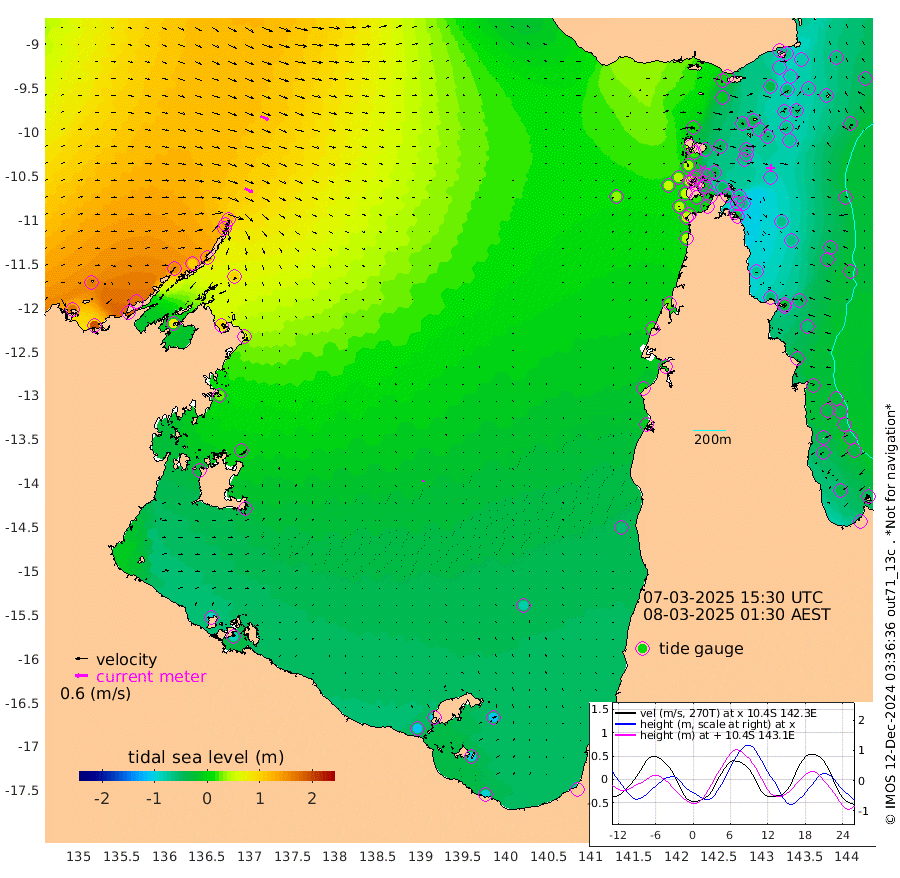 42cm/s 117T +3cm/s rms + 7cm/s -42T. ARA-GOC87 57m 8cm/s 31T +3cm/s rms + 2cm/s -2T. ARA-GOC87 60m 42cm/s 111T +2cm/s rms + 3cm/s 61T. ARA-GOC87 47m -69cm Daru -61cm Bobo Island -40cm Meer Island Barge -56cm Bramble Cay -75cm Unnamed Cay -59cm Pearce Cay -68cm Stephens Island -80cm Merrie England Shoals -80cm Mutacomal Reef -62cm Darnley Island Barge -46cm East Cay -65cm Yorke Island Barge -72cm Rennel Island -64cm Aureed Island -63cm Dungeness Reef -33cm Zagai Island -42cm Yam Island 7cm Dauan Island 4cm Saibai Island -11cm Phipi Reef -35cm Warrior Reef - West 9cm Mabuiag Island Barge -73cm Half Way Island -58cm Coconut Island -78cm Dugong Islet -53cm Poll Island -64cm Kirkcaldie Reef -48cm Suarji Island -53cm Sue Islet 43cm Hawkesbury Island -39cm Alert Patches -38cm Twin Island 53cm Badu Island -31cm St Pauls (Moa Island) 22cm Kubin (Moa Island) -16cm Ince Point -4cm Thursday Island -7cm Nardana Patches 10cm Turtle Head 24cm Round Island 40cm Goods Island 52cm Booby Island 41cm White Rocks Area 34cm Carpentaria -20cm Papou Point 48cm Bampfield Head 49cm Crab Island 43cm Red Wallis Island 22cm Packe Island -80cm Harrington Reef 26cm Herald Camp -17cm Sharp Point 15cm Red Island Point -14cm Possession Island -47cm Alpha Rock -52cm Frederick Point -65cm Wyborn Reef Light -60cm Tetley Island -33cm Triangle Reef -61cm Turtle Head Island -44cm Maclennan Cay -23cm Raine Island -67cm Mcsweeny Reef -63cm Collette Reef -42cm Shadwell Reef -70cm Hannibal Island -56cm Round Point 41cm Vrilya Point -62cm Cape Grenville -48cm Hicks Island -50cm Sir Charles Hardy Island -19cm Harvey Island -53cm Kay Reef -36cm Rocky Island -26cm Chapman Island -29cm Ham Reef -32cm Jubilee Reef -36cm Night Island -31cm Unnamed Reef No. 3 -38cm Morris Island -31cm 1st 3 Mile Opening -36cm Creech Reef -37cm Fife Island -37cm Eden Reef -46cm Stanley Island -49cm Normanby River 166cm Yabooma Island 191cm Hutchison River 167cm Elcho Island 158cm North West Crocodile Island 117cm Cape Wessel 155cm Stevens Island 100cm Guluwuru Island 137cm Hopeful Bay 127cm Auster Point 130cm Two Island Bay 176cm Cadell Strait 76cm Mallison Island 94cm Melville Bay (Gove Harbour) 104cm Truant Island 62cm Cape Arnhem 24cm Cape Grey 5cm Hawk Island -24cm Milner Bay (Groote Eylandt) -43cm Cape Beatrice -90cm West Island -88cm Centre Island -101cm Mornington Island -112cm West Wellesley Islands -107cm Bountiful Island -97cm Albert River Mouth -99cm Sweers Island -100cm Karumba -79cm Nassau River Offshore -54cm Christmas Creek -8cm Archer River 3cm Boyd Point 9cm Weipa (Humbug Point) 19cm Pennefather River 30cm Cullen Point
