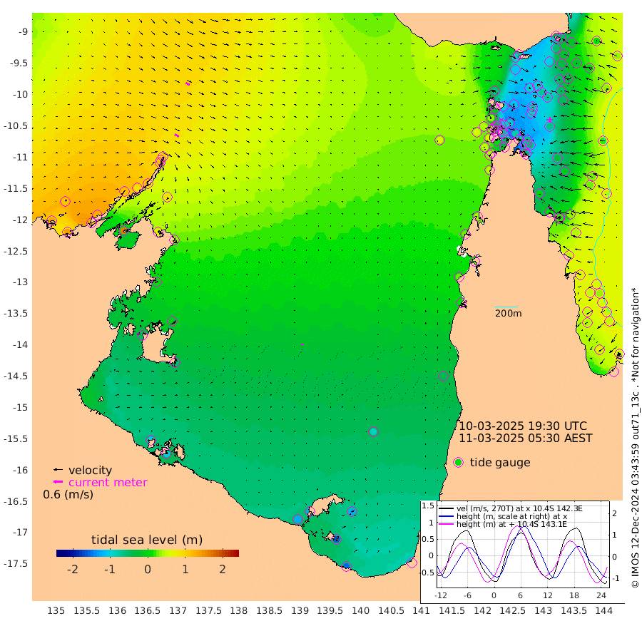 30cm/s 121T +3cm/s rms + 7cm/s -42T. ARA-GOC87 57m 12cm/s 142T +3cm/s rms + 2cm/s -2T. ARA-GOC87 60m 28cm/s 119T +2cm/s rms + 3cm/s 61T. ARA-GOC87 47m -66cm Daru -52cm Bobo Island 32cm Meer Island Barge 12cm Bramble Cay -26cm Unnamed Cay -32cm Pearce Cay -18cm Stephens Island -20cm Merrie England Shoals -57cm Mutacomal Reef -5cm Darnley Island Barge 30cm East Cay -33cm Yorke Island Barge -47cm Rennel Island -48cm Aureed Island -72cm Dungeness Reef -96cm Zagai Island -96cm Yam Island -91cm Dauan Island -77cm Saibai Island -109cm Phipi Reef -105cm Warrior Reef - West -61cm Mabuiag Island Barge -46cm Half Way Island -70cm Coconut Island -61cm Dugong Islet -86cm Poll Island -85cm Kirkcaldie Reef -110cm Suarji Island -78cm Sue Islet 35cm Hawkesbury Island -84cm Alert Patches -86cm Twin Island 5cm Badu Island -100cm St Pauls (Moa Island) -10cm Kubin (Moa Island) -65cm Ince Point -47cm Thursday Island -53cm Nardana Patches -21cm Turtle Head 1cm Round Island 32cm Goods Island 57cm Booby Island 43cm White Rocks Area 65cm Carpentaria -78cm Papou Point 63cm Bampfield Head 41cm Crab Island 45cm Red Wallis Island 7cm Packe Island -77cm Harrington Reef 32cm Herald Camp -44cm Sharp Point -18cm Red Island Point -54cm Possession Island -75cm Alpha Rock -81cm Frederick Point -59cm Wyborn Reef Light -66cm Tetley Island 18cm Triangle Reef -51cm Turtle Head Island 24cm Maclennan Cay 49cm Raine Island -26cm Mcsweeny Reef -11cm Collette Reef 25cm Shadwell Reef -7cm Hannibal Island 14cm Round Point 49cm Vrilya Point 17cm Cape Grenville 21cm Hicks Island 35cm Sir Charles Hardy Island 3cm Harvey Island 42cm Kay Reef 45cm Rocky Island 59cm Chapman Island 57cm Ham Reef 48cm Jubilee Reef 34cm Night Island 54cm Unnamed Reef No. 3 47cm Morris Island 48cm 1st 3 Mile Opening 47cm Creech Reef 38cm Fife Island 70cm Eden Reef 52cm Stanley Island 53cm Normanby River 129cm Yabooma Island 136cm Hutchison River 122cm Elcho Island 109cm North West Crocodile Island 102cm Cape Wessel 116cm Stevens Island 89cm Guluwuru Island 117cm Hopeful Bay 103cm Auster Point 108cm Two Island Bay 126cm Cadell Strait 159cm Mallison Island 75cm Melville Bay (Gove Harbour) 85cm Truant Island 45cm Cape Arnhem 7cm Cape Grey -12cm Hawk Island -47cm Milner Bay (Groote Eylandt) -60cm Cape Beatrice -102cm West Island -102cm Centre Island -124cm Mornington Island -121cm West Wellesley Islands -127cm Bountiful Island -157cm Albert River Mouth -159cm Sweers Island -160cm Karumba -83cm Nassau River Offshore -41cm Christmas Creek 15cm Archer River 27cm Boyd Point 34cm Weipa (Humbug Point) 28cm Pennefather River 45cm Cullen Point