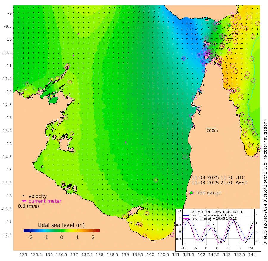 21cm/s 49T +3cm/s rms + 7cm/s -42T. ARA-GOC87 57m 26cm/s -7T +3cm/s rms + 2cm/s -2T. ARA-GOC87 60m 27cm/s 52T +2cm/s rms + 3cm/s 61T. ARA-GOC87 47m 81cm Daru 94cm Bobo Island 51cm Meer Island Barge 76cm Bramble Cay 86cm Unnamed Cay 91cm Pearce Cay 88cm Stephens Island 94cm Merrie England Shoals 86cm Mutacomal Reef 75cm Darnley Island Barge 63cm East Cay 76cm Yorke Island Barge 82cm Rennel Island 84cm Aureed Island 62cm Dungeness Reef 24cm Zagai Island 17cm Yam Island -68cm Dauan Island -63cm Saibai Island -38cm Phipi Reef 11cm Warrior Reef - West -68cm Mabuiag Island Barge 82cm Half Way Island 73cm Coconut Island 75cm Dugong Islet 47cm Poll Island 48cm Kirkcaldie Reef 24cm Suarji Island 33cm Sue Islet -146cm Hawkesbury Island -4cm Alert Patches 8cm Twin Island -129cm Badu Island -5cm St Pauls (Moa Island) -96cm Kubin (Moa Island) -38cm Ince Point -60cm Thursday Island -55cm Nardana Patches -88cm Turtle Head -103cm Round Island -133cm Goods Island -162cm Booby Island -134cm White Rocks Area -142cm Carpentaria -4cm Papou Point -148cm Bampfield Head -136cm Crab Island -146cm Red Wallis Island -106cm Packe Island 92cm Harrington Reef -145cm Herald Camp 1cm Sharp Point -76cm Red Island Point -30cm Possession Island 19cm Alpha Rock 42cm Frederick Point 81cm Wyborn Reef Light 71cm Tetley Island 38cm Triangle Reef 81cm Turtle Head Island 46cm Maclennan Cay 30cm Raine Island 81cm Mcsweeny Reef 74cm Collette Reef 44cm Shadwell Reef 86cm Hannibal Island 80cm Round Point -134cm Vrilya Point 68cm Cape Grenville 61cm Hicks Island 45cm Sir Charles Hardy Island 21cm Harvey Island 58cm Kay Reef 41cm Rocky Island 33cm Chapman Island 29cm Ham Reef 36cm Jubilee Reef 41cm Night Island 34cm Unnamed Reef No. 3 46cm Morris Island 31cm 1st 3 Mile Opening 38cm Creech Reef 55cm Fife Island 48cm Eden Reef 47cm Stanley Island 64cm Normanby River 25cm Yabooma Island 37cm Hutchison River 30cm Elcho Island 26cm North West Crocodile Island 45cm Cape Wessel 49cm Stevens Island 51cm Guluwuru Island 38cm Hopeful Bay 42cm Auster Point 35cm Two Island Bay 47cm Cadell Strait 71cm Mallison Island 49cm Melville Bay (Gove Harbour) 50cm Truant Island 39cm Cape Arnhem 47cm Cape Grey 49cm Hawk Island 65cm Milner Bay (Groote Eylandt) 60cm Cape Beatrice 67cm West Island 67cm Centre Island 72cm Mornington Island 75cm West Wellesley Islands 74cm Bountiful Island 100cm Albert River Mouth 124cm Sweers Island 89cm Karumba 23cm Nassau River Offshore -23cm Christmas Creek -68cm Archer River -88cm Boyd Point -98cm Weipa (Humbug Point) -87cm Pennefather River -127cm Cullen Point