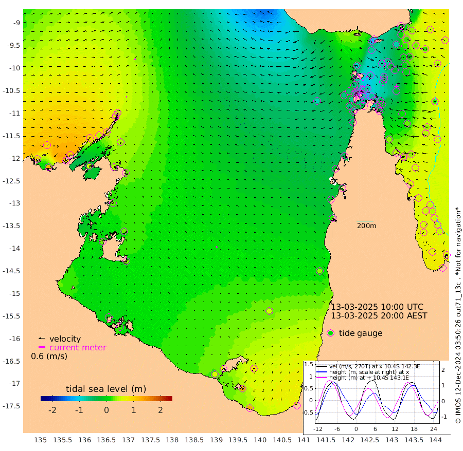 9cm/s 82T +3cm/s rms + 7cm/s -42T. ARA-GOC87 57m 17cm/s -46T +3cm/s rms + 2cm/s -2T. ARA-GOC87 60m 16cm/s 73T +2cm/s rms + 3cm/s 61T. ARA-GOC87 47m -11cm Daru 1cm Bobo Island 41cm Meer Island Barge 47cm Bramble Cay 19cm Unnamed Cay 17cm Pearce Cay 25cm Stephens Island 35cm Merrie England Shoals 0cm Mutacomal Reef 22cm Darnley Island Barge 52cm East Cay 0cm Yorke Island Barge 4cm Rennel Island -4cm Aureed Island -25cm Dungeness Reef -75cm Zagai Island -76cm Yam Island -106cm Dauan Island -105cm Saibai Island -75cm Phipi Reef -77cm Warrior Reef - West -96cm Mabuiag Island Barge -2cm Half Way Island -22cm Coconut Island -21cm Dugong Islet -51cm Poll Island -44cm Kirkcaldie Reef -80cm Suarji Island -58cm Sue Islet -69cm Hawkesbury Island -73cm Alert Patches -76cm Twin Island -68cm Badu Island -96cm St Pauls (Moa Island) -79cm Kubin (Moa Island) -83cm Ince Point -83cm Thursday Island -84cm Nardana Patches -67cm Turtle Head -71cm Round Island -56cm Goods Island -63cm Booby Island -53cm White Rocks Area -88cm Carpentaria -79cm Papou Point -74cm Bampfield Head -46cm Crab Island -64cm Red Wallis Island -66cm Packe Island -22cm Harrington Reef -80cm Herald Camp -34cm Sharp Point -50cm Red Island Point -71cm Possession Island -69cm Alpha Rock -54cm Frederick Point -17cm Wyborn Reef Light -30cm Tetley Island 22cm Triangle Reef -16cm Turtle Head Island 31cm Maclennan Cay 53cm Raine Island 15cm Mcsweeny Reef 27cm Collette Reef 39cm Shadwell Reef 36cm Hannibal Island 51cm Round Point -49cm Vrilya Point 44cm Cape Grenville 43cm Hicks Island 35cm Sir Charles Hardy Island 11cm Harvey Island 59cm Kay Reef 53cm Rocky Island 61cm Chapman Island 51cm Ham Reef 50cm Jubilee Reef 44cm Night Island 55cm Unnamed Reef No. 3 57cm Morris Island 47cm 1st 3 Mile Opening 50cm Creech Reef 57cm Fife Island 74cm Eden Reef 61cm Stanley Island 70cm Normanby River 106cm Yabooma Island 121cm Hutchison River 108cm Elcho Island 104cm North West Crocodile Island 47cm Cape Wessel 98cm Stevens Island 40cm Guluwuru Island 98cm Hopeful Bay 65cm Auster Point 52cm Two Island Bay 95cm Cadell Strait 59cm Mallison Island 44cm Melville Bay (Gove Harbour) 38cm Truant Island 23cm Cape Arnhem 27cm Cape Grey 30cm Hawk Island 28cm Milner Bay (Groote Eylandt) 31cm Cape Beatrice 14cm West Island 17cm Centre Island 65cm Mornington Island 65cm West Wellesley Islands 89cm Bountiful Island 128cm Albert River Mouth 134cm Sweers Island 123cm Karumba 57cm Nassau River Offshore 31cm Christmas Creek 16cm Archer River -21cm Boyd Point -6cm Weipa (Humbug Point) -17cm Pennefather River -51cm Cullen Point