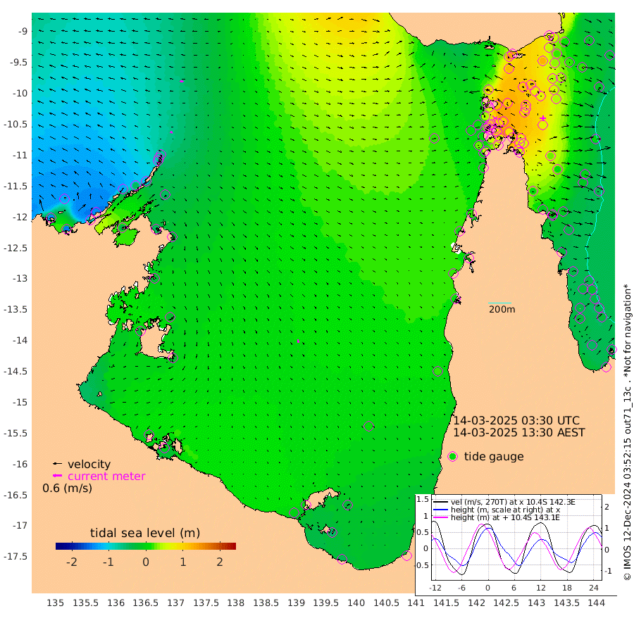 14cm/s -73T +3cm/s rms + 7cm/s -42T. ARA-GOC87 57m 22cm/s 170T +3cm/s rms + 2cm/s -2T. ARA-GOC87 60m 22cm/s -77T +2cm/s rms + 3cm/s 61T. ARA-GOC87 47m 62cm Daru 53cm Bobo Island -15cm Meer Island Barge -8cm Bramble Cay 22cm Unnamed Cay 37cm Pearce Cay 20cm Stephens Island 10cm Merrie England Shoals 48cm Mutacomal Reef 17cm Darnley Island Barge -17cm East Cay 42cm Yorke Island Barge 43cm Rennel Island 53cm Aureed Island 70cm Dungeness Reef 109cm Zagai Island 109cm Yam Island 132cm Dauan Island 126cm Saibai Island 118cm Phipi Reef 124cm Warrior Reef - West 95cm Mabuiag Island Barge 45cm Half Way Island 67cm Coconut Island 63cm Dugong Islet 89cm Poll Island 84cm Kirkcaldie Reef 106cm Suarji Island 90cm Sue Islet 43cm Hawkesbury Island 93cm Alert Patches 99cm Twin Island 48cm Badu Island 115cm St Pauls (Moa Island) 66cm Kubin (Moa Island) 90cm Ince Point 79cm Thursday Island 83cm Nardana Patches 60cm Turtle Head 48cm Round Island 27cm Goods Island 14cm Booby Island 9cm White Rocks Area 20cm Carpentaria 95cm Papou Point 11cm Bampfield Head 14cm Crab Island 25cm Red Wallis Island 52cm Packe Island 69cm Harrington Reef 47cm Herald Camp 43cm Sharp Point 53cm Red Island Point 75cm Possession Island 88cm Alpha Rock 88cm Frederick Point 58cm Wyborn Reef Light 69cm Tetley Island 5cm Triangle Reef 54cm Turtle Head Island -6cm Maclennan Cay -34cm Raine Island 26cm Mcsweeny Reef 13cm Collette Reef -13cm Shadwell Reef 7cm Hannibal Island -9cm Round Point 12cm Vrilya Point -11cm Cape Grenville -11cm Hicks Island -9cm Sir Charles Hardy Island 0cm Harvey Island -32cm Kay Reef -29cm Rocky Island -37cm Chapman Island -31cm Ham Reef -28cm Jubilee Reef -20cm Night Island -32cm Unnamed Reef No. 3 -33cm Morris Island -34cm 1st 3 Mile Opening -28cm Creech Reef -23cm Fife Island -48cm Eden Reef -38cm Stanley Island -40cm Normanby River -140cm Yabooma Island -146cm Hutchison River -136cm Elcho Island -126cm North West Crocodile Island -71cm Cape Wessel -121cm Stevens Island -46cm Guluwuru Island -118cm Hopeful Bay -91cm Auster Point -78cm Two Island Bay -96cm Cadell Strait -32cm Mallison Island -51cm Melville Bay (Gove Harbour) -50cm Truant Island -26cm Cape Arnhem -28cm Cape Grey -18cm Hawk Island -29cm Milner Bay (Groote Eylandt) -18cm Cape Beatrice -3cm West Island -6cm Centre Island 3cm Mornington Island -3cm West Wellesley Islands -24cm Bountiful Island -44cm Albert River Mouth -56cm Sweers Island -26cm Karumba 10cm Nassau River Offshore 20cm Christmas Creek 3cm Archer River 18cm Boyd Point 4cm Weipa (Humbug Point) 7cm Pennefather River 20cm Cullen Point
