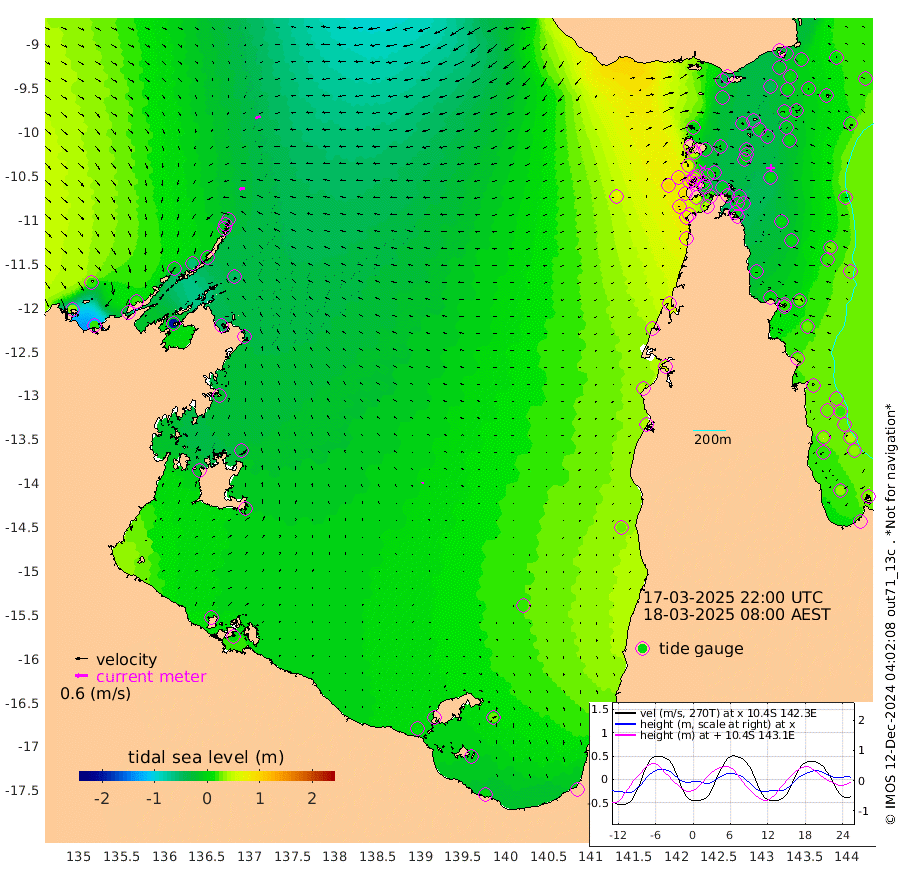 25cm/s -99T +3cm/s rms + 7cm/s -42T. ARA-GOC87 57m 5cm/s -151T +3cm/s rms + 2cm/s -2T. ARA-GOC87 60m 25cm/s -113T +2cm/s rms + 3cm/s 61T. ARA-GOC87 47m -15cm Daru -19cm Bobo Island 20cm Meer Island Barge 13cm Bramble Cay 6cm Unnamed Cay 0cm Pearce Cay 9cm Stephens Island 8cm Merrie England Shoals -8cm Mutacomal Reef 5cm Darnley Island Barge 21cm East Cay -6cm Yorke Island Barge 3cm Rennel Island -10cm Aureed Island -3cm Dungeness Reef -39cm Zagai Island -22cm Yam Island -32cm Dauan Island -42cm Saibai Island -27cm Phipi Reef -39cm Warrior Reef - West -2cm Mabuiag Island Barge 6cm Half Way Island -17cm Coconut Island 5cm Dugong Islet -14cm Poll Island -3cm Kirkcaldie Reef -8cm Suarji Island -19cm Sue Islet 73cm Hawkesbury Island 6cm Alert Patches -3cm Twin Island 51cm Badu Island -9cm St Pauls (Moa Island) 45cm Kubin (Moa Island) 14cm Ince Point 29cm Thursday Island 24cm Nardana Patches 49cm Turtle Head 48cm Round Island 81cm Goods Island 96cm Booby Island 97cm White Rocks Area 73cm Carpentaria -5cm Papou Point 84cm Bampfield Head 70cm Crab Island 84cm Red Wallis Island 56cm Packe Island -2cm Harrington Reef 72cm Herald Camp -13cm Sharp Point 41cm Red Island Point 16cm Possession Island -11cm Alpha Rock -8cm Frederick Point -16cm Wyborn Reef Light -20cm Tetley Island 8cm Triangle Reef 3cm Turtle Head Island 25cm Maclennan Cay 29cm Raine Island 4cm Mcsweeny Reef 4cm Collette Reef 15cm Shadwell Reef 6cm Hannibal Island 15cm Round Point 68cm Vrilya Point 21cm Cape Grenville 21cm Hicks Island 25cm Sir Charles Hardy Island 6cm Harvey Island 28cm Kay Reef 28cm Rocky Island 26cm Chapman Island 26cm Ham Reef 27cm Jubilee Reef 22cm Night Island 27cm Unnamed Reef No. 3 31cm Morris Island 38cm 1st 3 Mile Opening 31cm Creech Reef 21cm Fife Island 36cm Eden Reef 35cm Stanley Island 36cm Normanby River 32cm Yabooma Island 18cm Hutchison River 17cm Elcho Island 22cm North West Crocodile Island -30cm Cape Wessel -13cm Stevens Island -58cm Guluwuru Island -7cm Hopeful Bay -13cm Auster Point -18cm Two Island Bay -33cm Cadell Strait -200cm Mallison Island -45cm Melville Bay (Gove Harbour) -51cm Truant Island -43cm Cape Arnhem -21cm Cape Grey -27cm Hawk Island -11cm Milner Bay (Groote Eylandt) -2cm Cape Beatrice 12cm West Island 6cm Centre Island -3cm Mornington Island 9cm West Wellesley Islands 28cm Bountiful Island 7cm Albert River Mouth -1cm Sweers Island 6cm Karumba 18cm Nassau River Offshore 27cm Christmas Creek 42cm Archer River 44cm Boyd Point 59cm Weipa (Humbug Point) 41cm Pennefather River 57cm Cullen Point