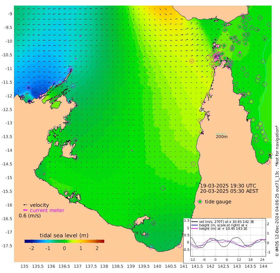 16cm/s -88T +3cm/s rms + 7cm/s -42T. ARA-GOC87 57m 18cm/s 151T +3cm/s rms + 2cm/s -2T. ARA-GOC87 60m 22cm/s -98T +2cm/s rms + 3cm/s 61T. ARA-GOC87 47m -7cm Daru -3cm Bobo Island 15cm Meer Island Barge 6cm Bramble Cay 2cm Unnamed Cay 0cm Pearce Cay 3cm Stephens Island 4cm Merrie England Shoals -1cm Mutacomal Reef 12cm Darnley Island Barge 15cm East Cay 8cm Yorke Island Barge -2cm Rennel Island 8cm Aureed Island -3cm Dungeness Reef -6cm Zagai Island -9cm Yam Island -9cm Dauan Island 9cm Saibai Island -10cm Phipi Reef -8cm Warrior Reef - West 8cm Mabuiag Island Barge -1cm Half Way Island 0cm Coconut Island 1cm Dugong Islet -4cm Poll Island -3cm Kirkcaldie Reef 5cm Suarji Island 8cm Sue Islet 21cm Hawkesbury Island 12cm Alert Patches 6cm Twin Island 11cm Badu Island 1cm St Pauls (Moa Island) 7cm Kubin (Moa Island) 9cm Ince Point 15cm Thursday Island 12cm Nardana Patches 16cm Turtle Head 14cm Round Island 24cm Goods Island 40cm Booby Island 30cm White Rocks Area 72cm Carpentaria -3cm Papou Point 46cm Bampfield Head 29cm Crab Island 37cm Red Wallis Island 21cm Packe Island 1cm Harrington Reef 33cm Herald Camp 2cm Sharp Point 17cm Red Island Point 12cm Possession Island 7cm Alpha Rock 3cm Frederick Point -4cm Wyborn Reef Light -4cm Tetley Island 16cm Triangle Reef -7cm Turtle Head Island 17cm Maclennan Cay 16cm Raine Island 6cm Mcsweeny Reef 12cm Collette Reef 17cm Shadwell Reef 10cm Hannibal Island 8cm Round Point 45cm Vrilya Point 17cm Cape Grenville 10cm Hicks Island 23cm Sir Charles Hardy Island 4cm Harvey Island 23cm Kay Reef 20cm Rocky Island 28cm Chapman Island 27cm Ham Reef 20cm Jubilee Reef 17cm Night Island 28cm Unnamed Reef No. 3 18cm Morris Island 18cm 1st 3 Mile Opening 23cm Creech Reef 16cm Fife Island 22cm Eden Reef 23cm Stanley Island 18cm Normanby River -169cm Yabooma Island -198cm Hutchison River -171cm Elcho Island -170cm North West Crocodile Island -93cm Cape Wessel -153cm Stevens Island -86cm Guluwuru Island -128cm Hopeful Bay -112cm Auster Point -122cm Two Island Bay -166cm Cadell Strait -7cm Mallison Island -84cm Melville Bay (Gove Harbour) -85cm Truant Island -52cm Cape Arnhem -38cm Cape Grey -32cm Hawk Island -22cm Milner Bay (Groote Eylandt) -19cm Cape Beatrice 12cm West Island 17cm Centre Island -3cm Mornington Island 2cm West Wellesley Islands -12cm Bountiful Island -68cm Albert River Mouth -53cm Sweers Island -54cm Karumba 11cm Nassau River Offshore 30cm Christmas Creek 39cm Archer River 44cm Boyd Point 39cm Weipa (Humbug Point) 38cm Pennefather River 46cm Cullen Point