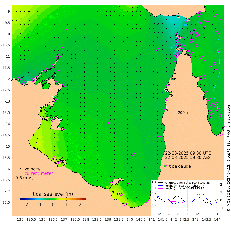 12cm/s -8T +3cm/s rms + 7cm/s -42T. ARA-GOC87 57m 27cm/s 5T +3cm/s rms + 2cm/s -2T. ARA-GOC87 60m 9cm/s 21T +2cm/s rms + 3cm/s 61T. ARA-GOC87 47m -32cm Daru -23cm Bobo Island -21cm Meer Island Barge -14cm Bramble Cay -19cm Unnamed Cay -26cm Pearce Cay -19cm Stephens Island -6cm Merrie England Shoals -16cm Mutacomal Reef -23cm Darnley Island Barge -14cm East Cay -28cm Yorke Island Barge -23cm Rennel Island -26cm Aureed Island -44cm Dungeness Reef -58cm Zagai Island -56cm Yam Island -110cm Dauan Island -87cm Saibai Island -110cm Phipi Reef -73cm Warrior Reef - West -72cm Mabuiag Island Barge -21cm Half Way Island -29cm Coconut Island -28cm Dugong Islet -42cm Poll Island -38cm Kirkcaldie Reef -58cm Suarji Island -41cm Sue Islet -91cm Hawkesbury Island -57cm Alert Patches -50cm Twin Island -95cm Badu Island -64cm St Pauls (Moa Island) -87cm Kubin (Moa Island) -64cm Ince Point -67cm Thursday Island -68cm Nardana Patches -82cm Turtle Head -85cm Round Island -88cm Goods Island -83cm Booby Island -68cm White Rocks Area -41cm Carpentaria -49cm Papou Point -88cm Bampfield Head -62cm Crab Island -70cm Red Wallis Island -80cm Packe Island -20cm Harrington Reef -97cm Herald Camp -12cm Sharp Point -59cm Red Island Point -64cm Possession Island -32cm Alpha Rock -39cm Frederick Point -23cm Wyborn Reef Light -26cm Tetley Island -24cm Triangle Reef -32cm Turtle Head Island -21cm Maclennan Cay -18cm Raine Island -19cm Mcsweeny Reef -16cm Collette Reef -20cm Shadwell Reef -14cm Hannibal Island -11cm Round Point -46cm Vrilya Point -9cm Cape Grenville -19cm Hicks Island -26cm Sir Charles Hardy Island -5cm Harvey Island -5cm Kay Reef -18cm Rocky Island -14cm Chapman Island -14cm Ham Reef -17cm Jubilee Reef -15cm Night Island -9cm Unnamed Reef No. 3 -15cm Morris Island -25cm 1st 3 Mile Opening -18cm Creech Reef -10cm Fife Island -18cm Eden Reef -11cm Stanley Island -5cm Normanby River -36cm Yabooma Island -55cm Hutchison River -34cm Elcho Island -30cm North West Crocodile Island -7cm Cape Wessel -18cm Stevens Island -34cm Guluwuru Island -18cm Hopeful Bay -18cm Auster Point -25cm Two Island Bay -49cm Cadell Strait 2cm Mallison Island -31cm Melville Bay (Gove Harbour) -31cm Truant Island -21cm Cape Arnhem -3cm Cape Grey 2cm Hawk Island 38cm Milner Bay (Groote Eylandt) 37cm Cape Beatrice 62cm West Island 64cm Centre Island 24cm Mornington Island 33cm West Wellesley Islands 7cm Bountiful Island 28cm Albert River Mouth 37cm Sweers Island 17cm Karumba -12cm Nassau River Offshore -36cm Christmas Creek -44cm Archer River -51cm Boyd Point -62cm Weipa (Humbug Point) -36cm Pennefather River -54cm Cullen Point
