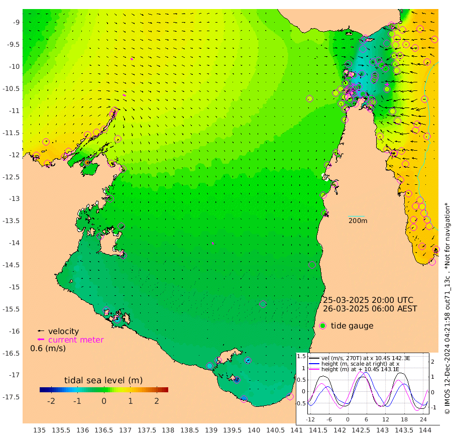 28cm/s 120T +3cm/s rms + 7cm/s -42T. ARA-GOC87 57m 21cm/s 158T +3cm/s rms + 2cm/s -2T. ARA-GOC87 60m 23cm/s 123T +2cm/s rms + 3cm/s 61T. ARA-GOC87 47m 23cm Daru 29cm Bobo Island 88cm Meer Island Barge 83cm Bramble Cay 62cm Unnamed Cay 50cm Pearce Cay 69cm Stephens Island 69cm Merrie England Shoals 33cm Mutacomal Reef 73cm Darnley Island Barge 88cm East Cay 48cm Yorke Island Barge 41cm Rennel Island 30cm Aureed Island 13cm Dungeness Reef -40cm Zagai Island -31cm Yam Island -63cm Dauan Island -63cm Saibai Island -74cm Phipi Reef -46cm Warrior Reef - West -46cm Mabuiag Island Barge 48cm Half Way Island 6cm Coconut Island 35cm Dugong Islet -12cm Poll Island 1cm Kirkcaldie Reef -53cm Suarji Island -11cm Sue Islet 34cm Hawkesbury Island -29cm Alert Patches -27cm Twin Island 6cm Badu Island -43cm St Pauls (Moa Island) 12cm Kubin (Moa Island) -23cm Ince Point -13cm Thursday Island -18cm Nardana Patches 4cm Turtle Head 5cm Round Island 38cm Goods Island 50cm Booby Island 43cm White Rocks Area 49cm Carpentaria -31cm Papou Point 44cm Bampfield Head 34cm Crab Island 41cm Red Wallis Island 23cm Packe Island 19cm Harrington Reef 30cm Herald Camp -28cm Sharp Point -3cm Red Island Point -23cm Possession Island -19cm Alpha Rock -9cm Frederick Point 23cm Wyborn Reef Light 11cm Tetley Island 61cm Triangle Reef 43cm Turtle Head Island 80cm Maclennan Cay 88cm Raine Island 56cm Mcsweeny Reef 61cm Collette Reef 77cm Shadwell Reef 73cm Hannibal Island 84cm Round Point 44cm Vrilya Point 84cm Cape Grenville 83cm Hicks Island 95cm Sir Charles Hardy Island 25cm Harvey Island 98cm Kay Reef 90cm Rocky Island 92cm Chapman Island 91cm Ham Reef 94cm Jubilee Reef 80cm Night Island 91cm Unnamed Reef No. 3 97cm Morris Island 97cm 1st 3 Mile Opening 95cm Creech Reef 89cm Fife Island 121cm Eden Reef 106cm Stanley Island 112cm Normanby River 92cm Yabooma Island 97cm Hutchison River 78cm Elcho Island 68cm North West Crocodile Island 73cm Cape Wessel 81cm Stevens Island 86cm Guluwuru Island 73cm Hopeful Bay 73cm Auster Point 84cm Two Island Bay 105cm Cadell Strait 160cm Mallison Island 64cm Melville Bay (Gove Harbour) 73cm Truant Island 39cm Cape Arnhem 6cm Cape Grey -20cm Hawk Island -50cm Milner Bay (Groote Eylandt) -54cm Cape Beatrice -88cm West Island -95cm Centre Island -102cm Mornington Island -91cm West Wellesley Islands -106cm Bountiful Island -141cm Albert River Mouth -160cm Sweers Island -148cm Karumba -53cm Nassau River Offshore -13cm Christmas Creek 21cm Archer River 32cm Boyd Point 36cm Weipa (Humbug Point) 30cm Pennefather River 35cm Cullen Point