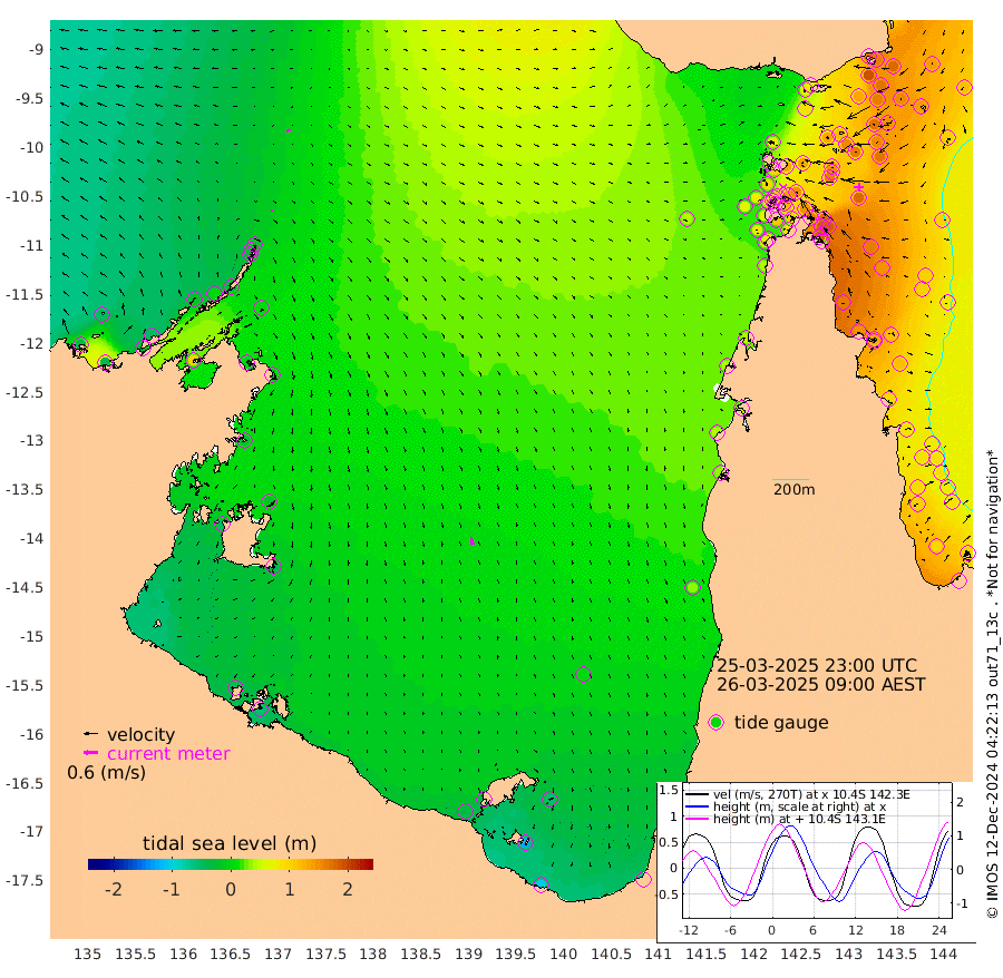 7cm/s -157T +3cm/s rms + 7cm/s -42T. ARA-GOC87 57m 34cm/s 168T +3cm/s rms + 2cm/s -2T. ARA-GOC87 60m 16cm/s -115T +2cm/s rms + 3cm/s 61T. ARA-GOC87 47m 172cm Daru 160cm Bobo Island 100cm Meer Island Barge 140cm Bramble Cay 172cm Unnamed Cay 162cm Pearce Cay 157cm Stephens Island 180cm Merrie England Shoals 189cm Mutacomal Reef 139cm Darnley Island Barge 113cm East Cay 149cm Yorke Island Barge 168cm Rennel Island 150cm Aureed Island 157cm Dungeness Reef 119cm Zagai Island 134cm Yam Island 80cm Dauan Island 72cm Saibai Island 86cm Phipi Reef 128cm Warrior Reef - West 80cm Mabuiag Island Barge 166cm Half Way Island 162cm Coconut Island 173cm Dugong Islet 152cm Poll Island 160cm Kirkcaldie Reef 132cm Suarji Island 141cm Sue Islet 94cm Hawkesbury Island 142cm Alert Patches 143cm Twin Island 81cm Badu Island 134cm St Pauls (Moa Island) 101cm Kubin (Moa Island) 121cm Ince Point 111cm Thursday Island 112cm Nardana Patches 103cm Turtle Head 83cm Round Island 84cm Goods Island 66cm Booby Island 79cm White Rocks Area 44cm Carpentaria 114cm Papou Point 67cm Bampfield Head 47cm Crab Island 77cm Red Wallis Island 108cm Packe Island 184cm Harrington Reef 77cm Herald Camp 34cm Sharp Point 83cm Red Island Point 102cm Possession Island 145cm Alpha Rock 160cm Frederick Point 183cm Wyborn Reef Light 179cm Tetley Island 101cm Triangle Reef 181cm Turtle Head Island 104cm Maclennan Cay 75cm Raine Island 158cm Mcsweeny Reef 145cm Collette Reef 104cm Shadwell Reef 158cm Hannibal Island 149cm Round Point 45cm Vrilya Point 134cm Cape Grenville 116cm Hicks Island 120cm Sir Charles Hardy Island 39cm Harvey Island 119cm Kay Reef 91cm Rocky Island 84cm Chapman Island 79cm Ham Reef 88cm Jubilee Reef 87cm Night Island 86cm Unnamed Reef No. 3 97cm Morris Island 82cm 1st 3 Mile Opening 90cm Creech Reef 100cm Fife Island 97cm Eden Reef 101cm Stanley Island 110cm Normanby River -38cm Yabooma Island -38cm Hutchison River -48cm Elcho Island -47cm North West Crocodile Island -13cm Cape Wessel -21cm Stevens Island 5cm Guluwuru Island -31cm Hopeful Bay -24cm Auster Point -24cm Two Island Bay -23cm Cadell Strait 100cm Mallison Island -1cm Melville Bay (Gove Harbour) 1cm Truant Island -3cm Cape Arnhem -20cm Cape Grey -22cm Hawk Island -52cm Milner Bay (Groote Eylandt) -40cm Cape Beatrice -48cm West Island -60cm Centre Island -42cm Mornington Island -34cm West Wellesley Islands -60cm Bountiful Island -104cm Albert River Mouth -125cm Sweers Island -94cm Karumba 5cm Nassau River Offshore 35cm Christmas Creek 37cm Archer River 43cm Boyd Point 39cm Weipa (Humbug Point) 38cm Pennefather River 40cm Cullen Point