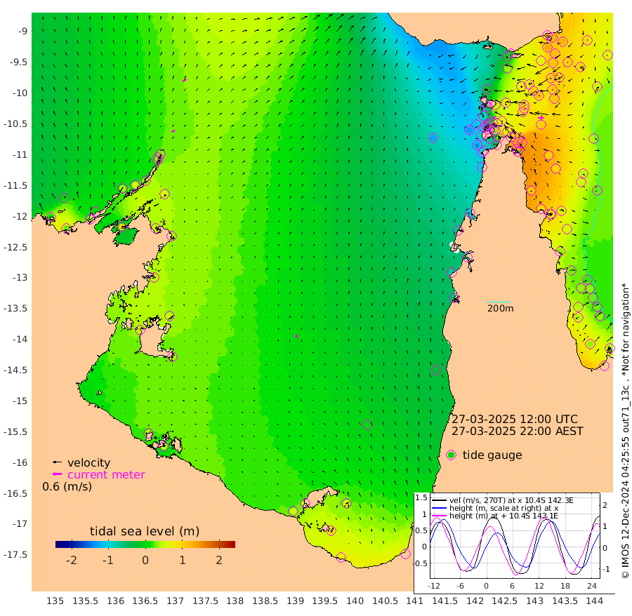 21cm/s 58T +3cm/s rms + 7cm/s -42T. ARA-GOC87 57m 22cm/s 0T +3cm/s rms + 2cm/s -2T. ARA-GOC87 60m 27cm/s 54T +2cm/s rms + 3cm/s 61T. ARA-GOC87 47m 123cm Daru 124cm Bobo Island 50cm Meer Island Barge 87cm Bramble Cay 116cm Unnamed Cay 109cm Pearce Cay 103cm Stephens Island 121cm Merrie England Shoals 128cm Mutacomal Reef 90cm Darnley Island Barge 61cm East Cay 103cm Yorke Island Barge 111cm Rennel Island 106cm Aureed Island 100cm Dungeness Reef 80cm Zagai Island 72cm Yam Island -3cm Dauan Island 5cm Saibai Island 36cm Phipi Reef 69cm Warrior Reef - West -3cm Mabuiag Island Barge 106cm Half Way Island 115cm Coconut Island 105cm Dugong Islet 92cm Poll Island 96cm Kirkcaldie Reef 79cm Suarji Island 87cm Sue Islet -91cm Hawkesbury Island 58cm Alert Patches 63cm Twin Island -71cm Badu Island 57cm St Pauls (Moa Island) -48cm Kubin (Moa Island) 17cm Ince Point -8cm Thursday Island -2cm Nardana Patches -41cm Turtle Head -45cm Round Island -95cm Goods Island -129cm Booby Island -106cm White Rocks Area -122cm Carpentaria 50cm Papou Point -94cm Bampfield Head -106cm Crab Island -120cm Red Wallis Island -70cm Packe Island 128cm Harrington Reef -97cm Herald Camp 22cm Sharp Point -30cm Red Island Point 29cm Possession Island 71cm Alpha Rock 92cm Frederick Point 128cm Wyborn Reef Light 122cm Tetley Island 44cm Triangle Reef 128cm Turtle Head Island 44cm Maclennan Cay 23cm Raine Island 104cm Mcsweeny Reef 95cm Collette Reef 53cm Shadwell Reef 107cm Hannibal Island 90cm Round Point -109cm Vrilya Point 75cm Cape Grenville 65cm Hicks Island 46cm Sir Charles Hardy Island 23cm Harvey Island 59cm Kay Reef 37cm Rocky Island 25cm Chapman Island 21cm Ham Reef 31cm Jubilee Reef 35cm Night Island 24cm Unnamed Reef No. 3 39cm Morris Island 26cm 1st 3 Mile Opening 30cm Creech Reef 43cm Fife Island 33cm Eden Reef 39cm Stanley Island 50cm Normanby River 10cm Yabooma Island 26cm Hutchison River 14cm Elcho Island 11cm North West Crocodile Island 33cm Cape Wessel 43cm Stevens Island 54cm Guluwuru Island 31cm Hopeful Bay 37cm Auster Point 25cm Two Island Bay 37cm Cadell Strait 103cm Mallison Island 52cm Melville Bay (Gove Harbour) 53cm Truant Island 42cm Cape Arnhem 52cm Cape Grey 52cm Hawk Island 55cm Milner Bay (Groote Eylandt) 45cm Cape Beatrice 46cm West Island 48cm Centre Island 53cm Mornington Island 48cm West Wellesley Islands 53cm Bountiful Island 61cm Albert River Mouth 96cm Sweers Island 64cm Karumba 5cm Nassau River Offshore -28cm Christmas Creek -60cm Archer River -75cm Boyd Point -88cm Weipa (Humbug Point) -66cm Pennefather River -107cm Cullen Point