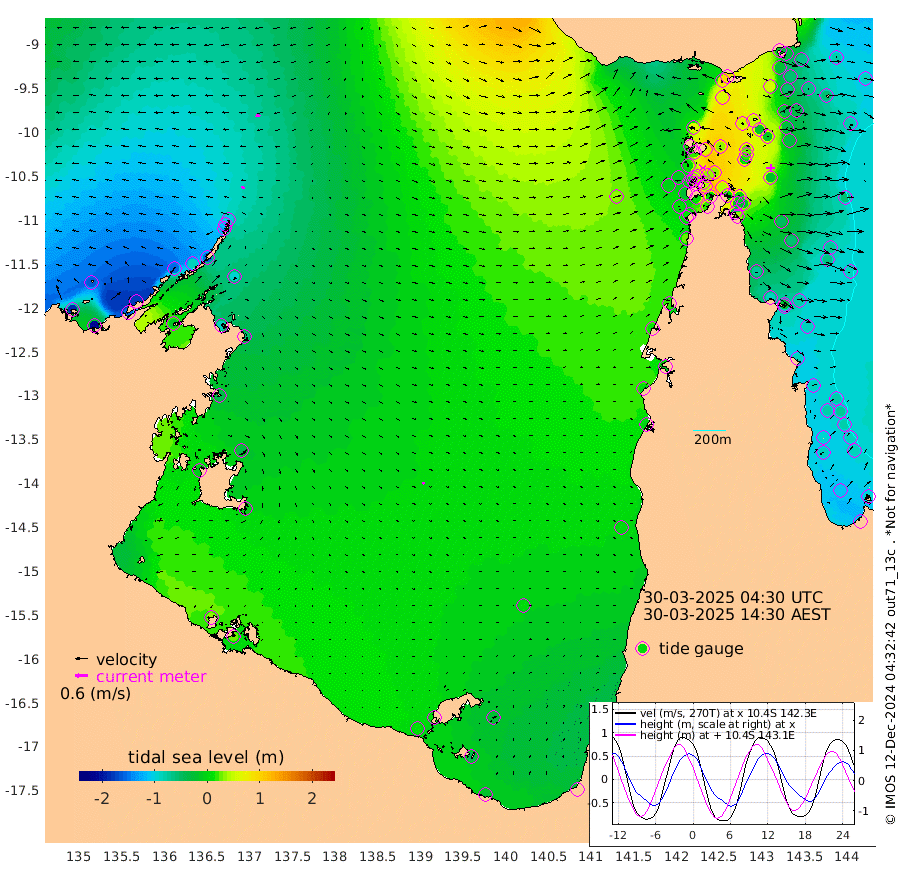 17cm/s -65T +3cm/s rms + 7cm/s -42T. ARA-GOC87 57m 11cm/s 147T +3cm/s rms + 2cm/s -2T. ARA-GOC87 60m 22cm/s -79T +2cm/s rms + 3cm/s 61T. ARA-GOC87 47m -20cm Daru -36cm Bobo Island -78cm Meer Island Barge -78cm Bramble Cay -54cm Unnamed Cay -57cm Pearce Cay -65cm Stephens Island -61cm Merrie England Shoals -24cm Mutacomal Reef -60cm Darnley Island Barge -88cm East Cay -37cm Yorke Island Barge -41cm Rennel Island -35cm Aureed Island -14cm Dungeness Reef 46cm Zagai Island 46cm Yam Island 84cm Dauan Island 93cm Saibai Island 55cm Phipi Reef 53cm Warrior Reef - West 67cm Mabuiag Island Barge -35cm Half Way Island -12cm Coconut Island -20cm Dugong Islet 16cm Poll Island 12cm Kirkcaldie Reef 32cm Suarji Island 30cm Sue Islet 11cm Hawkesbury Island 34cm Alert Patches 36cm Twin Island 22cm Badu Island 55cm St Pauls (Moa Island) 20cm Kubin (Moa Island) 41cm Ince Point 37cm Thursday Island 39cm Nardana Patches 18cm Turtle Head 3cm Round Island -4cm Goods Island 0cm Booby Island -10cm White Rocks Area 31cm Carpentaria 41cm Papou Point -26cm Bampfield Head 10cm Crab Island 11cm Red Wallis Island 12cm Packe Island -21cm Harrington Reef 1cm Herald Camp 34cm Sharp Point 18cm Red Island Point 15cm Possession Island 39cm Alpha Rock 14cm Frederick Point -19cm Wyborn Reef Light -5cm Tetley Island -54cm Triangle Reef -38cm Turtle Head Island -71cm Maclennan Cay -83cm Raine Island -51cm Mcsweeny Reef -56cm Collette Reef -67cm Shadwell Reef -68cm Hannibal Island -85cm Round Point 23cm Vrilya Point -77cm Cape Grenville -83cm Hicks Island -78cm Sir Charles Hardy Island -23cm Harvey Island -88cm Kay Reef -87cm Rocky Island -90cm Chapman Island -80cm Ham Reef -81cm Jubilee Reef -74cm Night Island -82cm Unnamed Reef No. 3 -92cm Morris Island -88cm 1st 3 Mile Opening -85cm Creech Reef -88cm Fife Island -111cm Eden Reef -93cm Stanley Island -106cm Normanby River -186cm Yabooma Island -208cm Hutchison River -176cm Elcho Island -164cm North West Crocodile Island -103cm Cape Wessel -152cm Stevens Island -84cm Guluwuru Island -151cm Hopeful Bay -129cm Auster Point -120cm Two Island Bay -154cm Cadell Strait -10cm Mallison Island -90cm Melville Bay (Gove Harbour) -92cm Truant Island -53cm Cape Arnhem -41cm Cape Grey -30cm Hawk Island -12cm Milner Bay (Groote Eylandt) -2cm Cape Beatrice 31cm West Island 30cm Centre Island 8cm Mornington Island 8cm West Wellesley Islands -29cm Bountiful Island -21cm Albert River Mouth -40cm Sweers Island -21cm Karumba 0cm Nassau River Offshore 1cm Christmas Creek -7cm Archer River 6cm Boyd Point -12cm Weipa (Humbug Point) 14cm Pennefather River 18cm Cullen Point