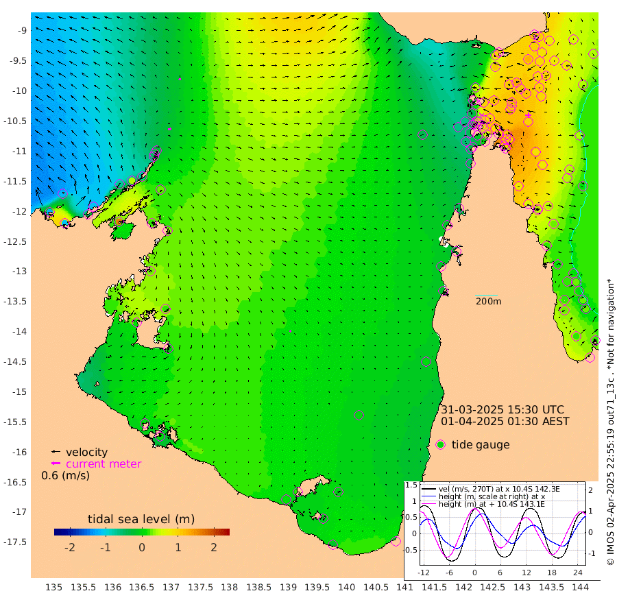 22cm/s 88T +3cm/s rms + 7cm/s -42T. ARA-GOC87 57m 11cm/s 135T +3cm/s rms + 2cm/s -2T. ARA-GOC87 60m 17cm/s 68T +2cm/s rms + 3cm/s 61T. ARA-GOC87 47m 115cm Daru 110cm Bobo Island 43cm Meer Island Barge 58cm Bramble Cay 90cm Unnamed Cay 91cm Pearce Cay 82cm Stephens Island 82cm Merrie England Shoals 103cm Mutacomal Reef 83cm Darnley Island Barge 38cm East Cay 100cm Yorke Island Barge 91cm Rennel Island 105cm Aureed Island 108cm Dungeness Reef 128cm Zagai Island 110cm Yam Island 99cm Dauan Island 99cm Saibai Island 112cm Phipi Reef 127cm Warrior Reef - West 59cm Mabuiag Island Barge 93cm Half Way Island 114cm Coconut Island 101cm Dugong Islet 109cm Poll Island 107cm Kirkcaldie Reef 114cm Suarji Island 113cm Sue Islet -43cm Hawkesbury Island 91cm Alert Patches 95cm Twin Island -7cm Badu Island 104cm St Pauls (Moa Island) 8cm Kubin (Moa Island) 64cm Ince Point 43cm Thursday Island 49cm Nardana Patches 15cm Turtle Head -2cm Round Island -36cm Goods Island -61cm Booby Island -61cm White Rocks Area -40cm Carpentaria 82cm Papou Point -38cm Bampfield Head -50cm Crab Island -57cm Red Wallis Island -12cm Packe Island 113cm Harrington Reef -34cm Herald Camp 39cm Sharp Point 3cm Red Island Point 59cm Possession Island 91cm Alpha Rock 104cm Frederick Point 110cm Wyborn Reef Light 112cm Tetley Island 45cm Triangle Reef 108cm Turtle Head Island 38cm Maclennan Cay 15cm Raine Island 86cm Mcsweeny Reef 76cm Collette Reef 44cm Shadwell Reef 81cm Hannibal Island 54cm Round Point -48cm Vrilya Point 48cm Cape Grenville 45cm Hicks Island 43cm Sir Charles Hardy Island 17cm Harvey Island 30cm Kay Reef 22cm Rocky Island 12cm Chapman Island 12cm Ham Reef 22cm Jubilee Reef 26cm Night Island 12cm Unnamed Reef No. 3 22cm Morris Island 23cm 1st 3 Mile Opening 23cm Creech Reef 23cm Fife Island 17cm Eden Reef 20cm Stanley Island 17cm Normanby River -123cm Yabooma Island -109cm Hutchison River -111cm Elcho Island -118cm North West Crocodile Island -29cm Cape Wessel -73cm Stevens Island 39cm Guluwuru Island -79cm Hopeful Bay -46cm Auster Point -49cm Two Island Bay -47cm Cadell Strait 160cm Mallison Island 20cm Melville Bay (Gove Harbour) 25cm Truant Island 32cm Cape Arnhem 24cm Cape Grey 20cm Hawk Island 10cm Milner Bay (Groote Eylandt) 1cm Cape Beatrice 3cm West Island 8cm Centre Island 18cm Mornington Island 12cm West Wellesley Islands -2cm Bountiful Island -20cm Albert River Mouth -10cm Sweers Island -19cm Karumba 4cm Nassau River Offshore 6cm Christmas Creek -20cm Archer River -17cm Boyd Point -33cm Weipa (Humbug Point) -21cm Pennefather River -42cm Cullen Point