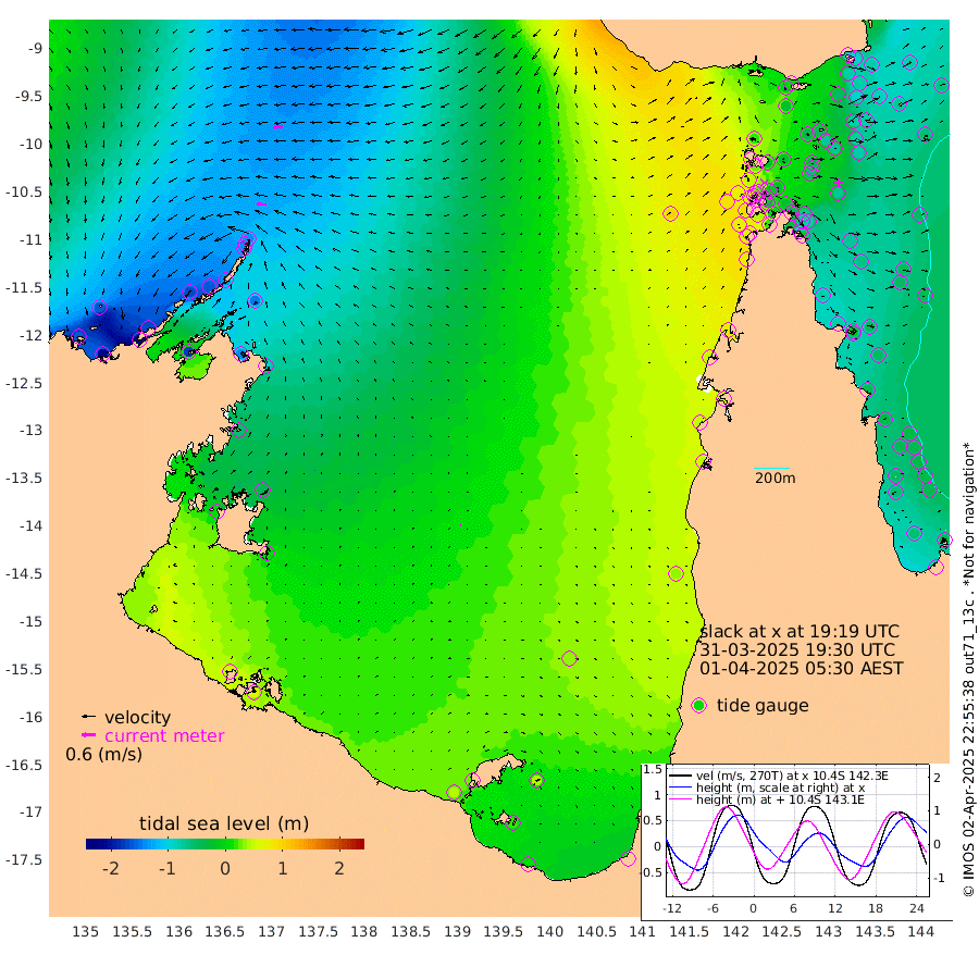 42cm/s -83T +3cm/s rms + 7cm/s -42T. ARA-GOC87 57m 4cm/s 110T +3cm/s rms + 2cm/s -2T. ARA-GOC87 60m 43cm/s -96T +2cm/s rms + 3cm/s 61T. ARA-GOC87 47m -84cm Daru -96cm Bobo Island -57cm Meer Island Barge -76cm Bramble Cay -77cm Unnamed Cay -96cm Pearce Cay -84cm Stephens Island -78cm Merrie England Shoals -76cm Mutacomal Reef -75cm Darnley Island Barge -64cm East Cay -76cm Yorke Island Barge -79cm Rennel Island -80cm Aureed Island -68cm Dungeness Reef -49cm Zagai Island -42cm Yam Island -8cm Dauan Island 2cm Saibai Island -16cm Phipi Reef -50cm Warrior Reef - West 20cm Mabuiag Island Barge -78cm Half Way Island -73cm Coconut Island -72cm Dugong Islet -56cm Poll Island -56cm Kirkcaldie Reef -21cm Suarji Island -43cm Sue Islet 49cm Hawkesbury Island -10cm Alert Patches -25cm Twin Island 39cm Badu Island -19cm St Pauls (Moa Island) 23cm Kubin (Moa Island) 4cm Ince Point 20cm Thursday Island 16cm Nardana Patches 31cm Turtle Head 45cm Round Island 55cm Goods Island 85cm Booby Island 72cm White Rocks Area 105cm Carpentaria -25cm Papou Point 92cm Bampfield Head 65cm Crab Island 74cm Red Wallis Island 40cm Packe Island -79cm Harrington Reef 76cm Herald Camp 0cm Sharp Point 21cm Red Island Point 7cm Possession Island -22cm Alpha Rock -49cm Frederick Point -77cm Wyborn Reef Light -72cm Tetley Island -47cm Triangle Reef -89cm Turtle Head Island -49cm Maclennan Cay -40cm Raine Island -74cm Mcsweeny Reef -66cm Collette Reef -46cm Shadwell Reef -76cm Hannibal Island -77cm Round Point 75cm Vrilya Point -56cm Cape Grenville -62cm Hicks Island -50cm Sir Charles Hardy Island -19cm Harvey Island -48cm Kay Reef -43cm Rocky Island -37cm Chapman Island -34cm Ham Reef -43cm Jubilee Reef -42cm Night Island -37cm Unnamed Reef No. 3 -48cm Morris Island -36cm 1st 3 Mile Opening -42cm Creech Reef -57cm Fife Island -56cm Eden Reef -43cm Stanley Island -60cm Normanby River -162cm Yabooma Island -211cm Hutchison River -171cm Elcho Island -164cm North West Crocodile Island -137cm Cape Wessel -172cm Stevens Island -160cm Guluwuru Island -141cm Hopeful Bay -140cm Auster Point -153cm Two Island Bay -226cm Cadell Strait -173cm Mallison Island -138cm Melville Bay (Gove Harbour) -146cm Truant Island -95cm Cape Arnhem -57cm Cape Grey -40cm Hawk Island 3cm Milner Bay (Groote Eylandt) 7cm Cape Beatrice 60cm West Island 66cm Centre Island 30cm Mornington Island 39cm West Wellesley Islands 43cm Bountiful Island 10cm Albert River Mouth 22cm Sweers Island 15cm Karumba 31cm Nassau River Offshore 37cm Christmas Creek 46cm Archer River 52cm Boyd Point 57cm Weipa (Humbug Point) 49cm Pennefather River 77cm Cullen Point