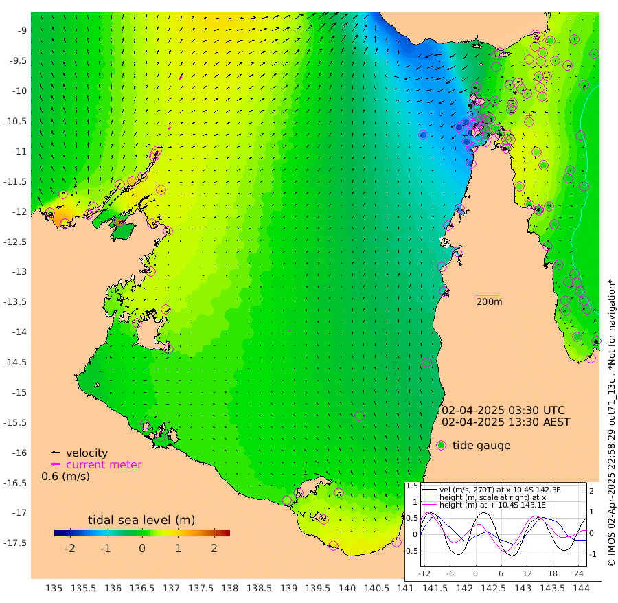 22cm/s 51T +3cm/s rms + 7cm/s -42T. ARA-GOC87 57m 5cm/s -69T +3cm/s rms + 2cm/s -2T. ARA-GOC87 60m 28cm/s 41T +2cm/s rms + 3cm/s 61T. ARA-GOC87 47m 41cm Daru 48cm Bobo Island 13cm Meer Island Barge 20cm Bramble Cay 29cm Unnamed Cay 36cm Pearce Cay 29cm Stephens Island 21cm Merrie England Shoals 31cm Mutacomal Reef 33cm Darnley Island Barge 10cm East Cay 40cm Yorke Island Barge 28cm Rennel Island 41cm Aureed Island 29cm Dungeness Reef 42cm Zagai Island 29cm Yam Island 19cm Dauan Island 25cm Saibai Island 14cm Phipi Reef 45cm Warrior Reef - West -27cm Mabuiag Island Barge 28cm Half Way Island 27cm Coconut Island 30cm Dugong Islet 25cm Poll Island 17cm Kirkcaldie Reef 8cm Suarji Island 29cm Sue Islet -128cm Hawkesbury Island -22cm Alert Patches -9cm Twin Island -111cm Badu Island -2cm St Pauls (Moa Island) -84cm Kubin (Moa Island) -40cm Ince Point -64cm Thursday Island -56cm Nardana Patches -90cm Turtle Head -103cm Round Island -136cm Goods Island -170cm Booby Island -161cm White Rocks Area -152cm Carpentaria -6cm Papou Point -169cm Bampfield Head -150cm Crab Island -158cm Red Wallis Island -115cm Packe Island 28cm Harrington Reef -134cm Herald Camp 7cm Sharp Point -83cm Red Island Point -45cm Possession Island 4cm Alpha Rock 10cm Frederick Point 32cm Wyborn Reef Light 30cm Tetley Island 9cm Triangle Reef 23cm Turtle Head Island 5cm Maclennan Cay -11cm Raine Island 26cm Mcsweeny Reef 21cm Collette Reef 5cm Shadwell Reef 25cm Hannibal Island 13cm Round Point -153cm Vrilya Point 7cm Cape Grenville 10cm Hicks Island 10cm Sir Charles Hardy Island 4cm Harvey Island -2cm Kay Reef -1cm Rocky Island -11cm Chapman Island -7cm Ham Reef -2cm Jubilee Reef -2cm Night Island -11cm Unnamed Reef No. 3 -4cm Morris Island -12cm 1st 3 Mile Opening -6cm Creech Reef 2cm Fife Island -1cm Eden Reef -7cm Stanley Island 2cm Normanby River 34cm Yabooma Island 63cm Hutchison River 48cm Elcho Island 46cm North West Crocodile Island 69cm Cape Wessel 60cm Stevens Island 110cm Guluwuru Island 48cm Hopeful Bay 56cm Auster Point 71cm Two Island Bay 102cm Cadell Strait 172cm Mallison Island 89cm Melville Bay (Gove Harbour) 91cm Truant Island 70cm Cape Arnhem 57cm Cape Grey 54cm Hawk Island 37cm Milner Bay (Groote Eylandt) 35cm Cape Beatrice 20cm West Island 13cm Centre Island 40cm Mornington Island 36cm West Wellesley Islands 51cm Bountiful Island 75cm Albert River Mouth 81cm Sweers Island 62cm Karumba 2cm Nassau River Offshore -32cm Christmas Creek -78cm Archer River -83cm Boyd Point -97cm Weipa (Humbug Point) -108cm Pennefather River -128cm Cullen Point