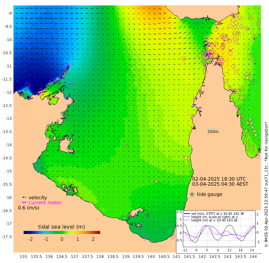 10cm/s -85T +3cm/s rms + 7cm/s -42T. ARA-GOC87 57m 26cm/s 154T +3cm/s rms + 2cm/s -2T. ARA-GOC87 60m 21cm/s -94T +2cm/s rms + 3cm/s 61T. ARA-GOC87 47m 57cm Daru 47cm Bobo Island 35cm Meer Island Barge 35cm Bramble Cay 53cm Unnamed Cay 41cm Pearce Cay 47cm Stephens Island 52cm Merrie England Shoals 57cm Mutacomal Reef 54cm Darnley Island Barge 29cm East Cay 59cm Yorke Island Barge 49cm Rennel Island 55cm Aureed Island 58cm Dungeness Reef 59cm Zagai Island 58cm Yam Island 54cm Dauan Island 59cm Saibai Island 53cm Phipi Reef 61cm Warrior Reef - West 44cm Mabuiag Island Barge 56cm Half Way Island 55cm Coconut Island 63cm Dugong Islet 57cm Poll Island 65cm Kirkcaldie Reef 63cm Suarji Island 69cm Sue Islet 17cm Hawkesbury Island 65cm Alert Patches 61cm Twin Island 22cm Badu Island 64cm St Pauls (Moa Island) 29cm Kubin (Moa Island) 54cm Ince Point 51cm Thursday Island 51cm Nardana Patches 41cm Turtle Head 25cm Round Island 25cm Goods Island 30cm Booby Island 18cm White Rocks Area 62cm Carpentaria 46cm Papou Point 33cm Bampfield Head 25cm Crab Island 28cm Red Wallis Island 34cm Packe Island 62cm Harrington Reef 35cm Herald Camp 26cm Sharp Point 26cm Red Island Point 45cm Possession Island 60cm Alpha Rock 59cm Frederick Point 53cm Wyborn Reef Light 54cm Tetley Island 33cm Triangle Reef 54cm Turtle Head Island 36cm Maclennan Cay 22cm Raine Island 51cm Mcsweeny Reef 49cm Collette Reef 39cm Shadwell Reef 51cm Hannibal Island 32cm Round Point 42cm Vrilya Point 42cm Cape Grenville 32cm Hicks Island 43cm Sir Charles Hardy Island 13cm Harvey Island 35cm Kay Reef 27cm Rocky Island 23cm Chapman Island 26cm Ham Reef 29cm Jubilee Reef 29cm Night Island 27cm Unnamed Reef No. 3 27cm Morris Island 33cm 1st 3 Mile Opening 33cm Creech Reef 24cm Fife Island 27cm Eden Reef 34cm Stanley Island 24cm Normanby River -236cm Yabooma Island -266cm Hutchison River -239cm Elcho Island -237cm North West Crocodile Island -131cm Cape Wessel -204cm Stevens Island -85cm Guluwuru Island -187cm Hopeful Bay -154cm Auster Point -158cm Two Island Bay -203cm Cadell Strait 43cm Mallison Island -93cm Melville Bay (Gove Harbour) -94cm Truant Island -51cm Cape Arnhem -38cm Cape Grey -36cm Hawk Island -22cm Milner Bay (Groote Eylandt) -16cm Cape Beatrice 20cm West Island 23cm Centre Island 13cm Mornington Island 20cm West Wellesley Islands -8cm Bountiful Island -59cm Albert River Mouth -59cm Sweers Island -52cm Karumba 28cm Nassau River Offshore 49cm Christmas Creek 39cm Archer River 46cm Boyd Point 36cm Weipa (Humbug Point) 43cm Pennefather River 41cm Cullen Point