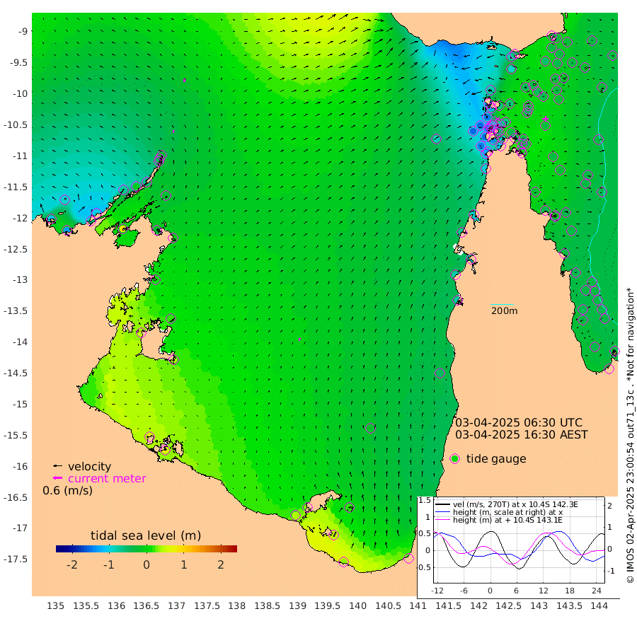 21cm/s 4T +3cm/s rms + 7cm/s -42T. ARA-GOC87 57m 18cm/s 11T +3cm/s rms + 2cm/s -2T. ARA-GOC87 60m 21cm/s 8T +2cm/s rms + 3cm/s 61T. ARA-GOC87 47m -34cm Daru -30cm Bobo Island -28cm Meer Island Barge -33cm Bramble Cay -30cm Unnamed Cay -42cm Pearce Cay -30cm Stephens Island -28cm Merrie England Shoals -32cm Mutacomal Reef -21cm Darnley Island Barge -34cm East Cay -22cm Yorke Island Barge -37cm Rennel Island -31cm Aureed Island -47cm Dungeness Reef -41cm Zagai Island -47cm Yam Island -80cm Dauan Island -56cm Saibai Island -90cm Phipi Reef -54cm Warrior Reef - West -77cm Mabuiag Island Barge -29cm Half Way Island -44cm Coconut Island -31cm Dugong Islet -46cm Poll Island -43cm Kirkcaldie Reef -67cm Suarji Island -30cm Sue Islet -146cm Hawkesbury Island -74cm Alert Patches -66cm Twin Island -151cm Badu Island -66cm St Pauls (Moa Island) -123cm Kubin (Moa Island) -85cm Ince Point -98cm Thursday Island -95cm Nardana Patches -126cm Turtle Head -126cm Round Island -155cm Goods Island -156cm Booby Island -156cm White Rocks Area -90cm Carpentaria -59cm Papou Point -156cm Bampfield Head -127cm Crab Island -147cm Red Wallis Island -140cm Packe Island -36cm Harrington Reef -139cm Herald Camp -4cm Sharp Point -107cm Red Island Point -84cm Possession Island -41cm Alpha Rock -53cm Frederick Point -37cm Wyborn Reef Light -38cm Tetley Island -36cm Triangle Reef -41cm Turtle Head Island -34cm Maclennan Cay -40cm Raine Island -31cm Mcsweeny Reef -28cm Collette Reef -30cm Shadwell Reef -28cm Hannibal Island -40cm Round Point -101cm Vrilya Point -29cm Cape Grenville -35cm Hicks Island -38cm Sir Charles Hardy Island -8cm Harvey Island -31cm Kay Reef -36cm Rocky Island -43cm Chapman Island -33cm Ham Reef -33cm Jubilee Reef -31cm Night Island -36cm Unnamed Reef No. 3 -38cm Morris Island -40cm 1st 3 Mile Opening -35cm Creech Reef -34cm Fife Island -39cm Eden Reef -31cm Stanley Island -31cm Normanby River -108cm Yabooma Island -128cm Hutchison River -102cm Elcho Island -97cm North West Crocodile Island -30cm Cape Wessel -73cm Stevens Island -12cm Guluwuru Island -68cm Hopeful Bay -50cm Auster Point -38cm Two Island Bay -72cm Cadell Strait 88cm Mallison Island -24cm Melville Bay (Gove Harbour) -23cm Truant Island -7cm Cape Arnhem 10cm Cape Grey 16cm Hawk Island 45cm Milner Bay (Groote Eylandt) 42cm Cape Beatrice 73cm West Island 74cm Centre Island 37cm Mornington Island 43cm West Wellesley Islands 15cm Bountiful Island 30cm Albert River Mouth 49cm Sweers Island 22cm Karumba -17cm Nassau River Offshore -49cm Christmas Creek -76cm Archer River -76cm Boyd Point -100cm Weipa (Humbug Point) -71cm Pennefather River -95cm Cullen Point