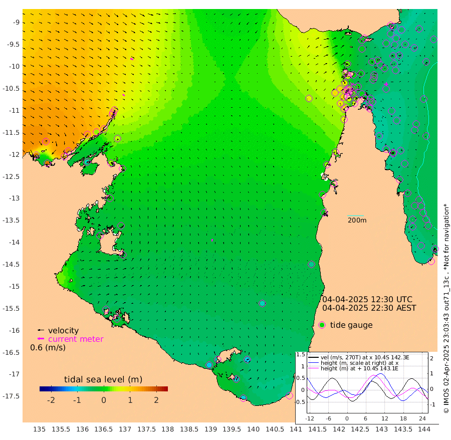 22cm/s 128T +3cm/s rms + 7cm/s -42T. ARA-GOC87 57m 24cm/s 9T +3cm/s rms + 2cm/s -2T. ARA-GOC87 60m 28cm/s 123T +2cm/s rms + 3cm/s 61T. ARA-GOC87 47m -45cm Daru -44cm Bobo Island -49cm Meer Island Barge -48cm Bramble Cay -50cm Unnamed Cay -45cm Pearce Cay -52cm Stephens Island -50cm Merrie England Shoals -43cm Mutacomal Reef -60cm Darnley Island Barge -46cm East Cay -55cm Yorke Island Barge -42cm Rennel Island -52cm Aureed Island -39cm Dungeness Reef -21cm Zagai Island -15cm Yam Island -8cm Dauan Island -10cm Saibai Island -13cm Phipi Reef -30cm Warrior Reef - West 30cm Mabuiag Island Barge -45cm Half Way Island -28cm Coconut Island -46cm Dugong Islet -21cm Poll Island -25cm Kirkcaldie Reef -10cm Suarji Island -29cm Sue Islet 88cm Hawkesbury Island 5cm Alert Patches 4cm Twin Island 80cm Badu Island 6cm St Pauls (Moa Island) 59cm Kubin (Moa Island) 23cm Ince Point 37cm Thursday Island 33cm Nardana Patches 46cm Turtle Head 73cm Round Island 75cm Goods Island 91cm Booby Island 92cm White Rocks Area 70cm Carpentaria 18cm Papou Point 103cm Bampfield Head 84cm Crab Island 85cm Red Wallis Island 60cm Packe Island -37cm Harrington Reef 73cm Herald Camp -6cm Sharp Point 55cm Red Island Point 33cm Possession Island -5cm Alpha Rock -12cm Frederick Point -29cm Wyborn Reef Light -23cm Tetley Island -37cm Triangle Reef -21cm Turtle Head Island -44cm Maclennan Cay -34cm Raine Island -49cm Mcsweeny Reef -50cm Collette Reef -46cm Shadwell Reef -56cm Hannibal Island -44cm Round Point 74cm Vrilya Point -50cm Cape Grenville -44cm Hicks Island -56cm Sir Charles Hardy Island -16cm Harvey Island -48cm Kay Reef -44cm Rocky Island -40cm Chapman Island -41cm Ham Reef -43cm Jubilee Reef -42cm Night Island -40cm Unnamed Reef No. 3 -44cm Morris Island -41cm 1st 3 Mile Opening -46cm Creech Reef -48cm Fife Island -54cm Eden Reef -49cm Stanley Island -50cm Normanby River 161cm Yabooma Island 171cm Hutchison River 154cm Elcho Island 153cm North West Crocodile Island 86cm Cape Wessel 136cm Stevens Island 32cm Guluwuru Island 118cm Hopeful Bay 105cm Auster Point 103cm Two Island Bay 116cm Cadell Strait -86cm Mallison Island 42cm Melville Bay (Gove Harbour) 49cm Truant Island 18cm Cape Arnhem 3cm Cape Grey -8cm Hawk Island -14cm Milner Bay (Groote Eylandt) -30cm Cape Beatrice -58cm West Island -53cm Centre Island -97cm Mornington Island -105cm West Wellesley Islands -110cm Bountiful Island -99cm Albert River Mouth -100cm Sweers Island -95cm Karumba -89cm Nassau River Offshore -68cm Christmas Creek -13cm Archer River 3cm Boyd Point 7cm Weipa (Humbug Point) 34cm Pennefather River 51cm Cullen Point