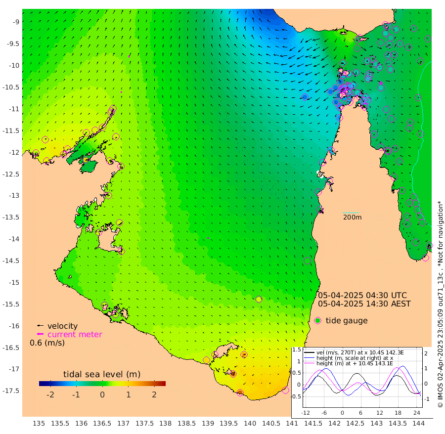 13cm/s 9T +3cm/s rms + 7cm/s -42T. ARA-GOC87 57m 17cm/s -67T +3cm/s rms + 2cm/s -2T. ARA-GOC87 60m 20cm/s 22T +2cm/s rms + 3cm/s 61T. ARA-GOC87 47m -66cm Daru -57cm Bobo Island -27cm Meer Island Barge -42cm Bramble Cay -64cm Unnamed Cay -59cm Pearce Cay -57cm Stephens Island -69cm Merrie England Shoals -76cm Mutacomal Reef -44cm Darnley Island Barge -35cm East Cay -53cm Yorke Island Barge -69cm Rennel Island -53cm Aureed Island -69cm Dungeness Reef -52cm Zagai Island -71cm Yam Island -32cm Dauan Island -31cm Saibai Island -35cm Phipi Reef -46cm Warrior Reef - West -78cm Mabuiag Island Barge -74cm Half Way Island -76cm Coconut Island -79cm Dugong Islet -78cm Poll Island -90cm Kirkcaldie Reef -81cm Suarji Island -73cm Sue Islet -145cm Hawkesbury Island -105cm Alert Patches -102cm Twin Island -120cm Badu Island -98cm St Pauls (Moa Island) -120cm Kubin (Moa Island) -106cm Ince Point -117cm Thursday Island -111cm Nardana Patches -116cm Turtle Head -123cm Round Island -131cm Goods Island -148cm Booby Island -147cm White Rocks Area -144cm Carpentaria -93cm Papou Point -159cm Bampfield Head -128cm Crab Island -144cm Red Wallis Island -130cm Packe Island -93cm Harrington Reef -138cm Herald Camp -23cm Sharp Point -114cm Red Island Point -107cm Possession Island -90cm Alpha Rock -95cm Frederick Point -81cm Wyborn Reef Light -84cm Tetley Island -32cm Triangle Reef -101cm Turtle Head Island -37cm Maclennan Cay -22cm Raine Island -60cm Mcsweeny Reef -51cm Collette Reef -31cm Shadwell Reef -52cm Hannibal Island -50cm Round Point -135cm Vrilya Point -48cm Cape Grenville -39cm Hicks Island -34cm Sir Charles Hardy Island -14cm Harvey Island -39cm Kay Reef -24cm Rocky Island -20cm Chapman Island -22cm Ham Reef -25cm Jubilee Reef -25cm Night Island -25cm Unnamed Reef No. 3 -28cm Morris Island -28cm 1st 3 Mile Opening -28cm Creech Reef -24cm Fife Island -18cm Eden Reef -31cm Stanley Island -31cm Normanby River 44cm Yabooma Island 69cm Hutchison River 64cm Elcho Island 59cm North West Crocodile Island 40cm Cape Wessel 52cm Stevens Island 65cm Guluwuru Island 56cm Hopeful Bay 39cm Auster Point 41cm Two Island Bay 74cm Cadell Strait 102cm Mallison Island 59cm Melville Bay (Gove Harbour) 53cm Truant Island 47cm Cape Arnhem 45cm Cape Grey 55cm Hawk Island 53cm Milner Bay (Groote Eylandt) 55cm Cape Beatrice 45cm West Island 45cm Centre Island 98cm Mornington Island 95cm West Wellesley Islands 130cm Bountiful Island 187cm Albert River Mouth 192cm Sweers Island 166cm Karumba 58cm Nassau River Offshore 12cm Christmas Creek -36cm Archer River -59cm Boyd Point -54cm Weipa (Humbug Point) -87cm Pennefather River -105cm Cullen Point