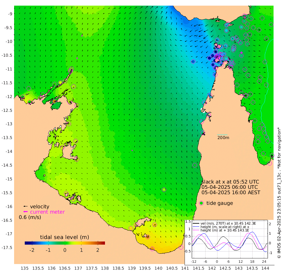 21cm/s 22T +3cm/s rms + 7cm/s -42T. ARA-GOC87 57m 17cm/s -32T +3cm/s rms + 2cm/s -2T. ARA-GOC87 60m 28cm/s 28T +2cm/s rms + 3cm/s 61T. ARA-GOC87 47m -51cm Daru -37cm Bobo Island -2cm Meer Island Barge -14cm Bramble Cay -36cm Unnamed Cay -38cm Pearce Cay -26cm Stephens Island -34cm Merrie England Shoals -55cm Mutacomal Reef -14cm Darnley Island Barge -7cm East Cay -29cm Yorke Island Barge -48cm Rennel Island -34cm Aureed Island -64cm Dungeness Reef -72cm Zagai Island -89cm Yam Island -100cm Dauan Island -86cm Saibai Island -100cm Phipi Reef -78cm Warrior Reef - West -126cm Mabuiag Island Barge -47cm Half Way Island -67cm Coconut Island -58cm Dugong Islet -81cm Poll Island -86cm Kirkcaldie Reef -104cm Suarji Island -73cm Sue Islet -201cm Hawkesbury Island -126cm Alert Patches -118cm Twin Island -189cm Badu Island -123cm St Pauls (Moa Island) -169cm Kubin (Moa Island) -138cm Ince Point -153cm Thursday Island -148cm Nardana Patches -165cm Turtle Head -171cm Round Island -188cm Goods Island -203cm Booby Island -198cm White Rocks Area -162cm Carpentaria -113cm Papou Point -204cm Bampfield Head -172cm Crab Island -195cm Red Wallis Island -180cm Packe Island -69cm Harrington Reef -188cm Herald Camp -28cm Sharp Point -153cm Red Island Point -132cm Possession Island -95cm Alpha Rock -97cm Frederick Point -64cm Wyborn Reef Light -72cm Tetley Island -18cm Triangle Reef -76cm Turtle Head Island -14cm Maclennan Cay -6cm Raine Island -33cm Mcsweeny Reef -24cm Collette Reef -10cm Shadwell Reef -21cm Hannibal Island -21cm Round Point -161cm Vrilya Point -16cm Cape Grenville -13cm Hicks Island -12cm Sir Charles Hardy Island -4cm Harvey Island -8cm Kay Reef -3cm Rocky Island -2cm Chapman Island -1cm Ham Reef -3cm Jubilee Reef -4cm Night Island -4cm Unnamed Reef No. 3 -4cm Morris Island -8cm 1st 3 Mile Opening -4cm Creech Reef 2cm Fife Island 10cm Eden Reef -1cm Stanley Island 3cm Normanby River -8cm Yabooma Island 1cm Hutchison River 8cm Elcho Island 2cm North West Crocodile Island 30cm Cape Wessel 17cm Stevens Island 59cm Guluwuru Island 23cm Hopeful Bay 19cm Auster Point 24cm Two Island Bay 34cm Cadell Strait 155cm Mallison Island 46cm Melville Bay (Gove Harbour) 44cm Truant Island 41cm Cape Arnhem 45cm Cape Grey 52cm Hawk Island 63cm Milner Bay (Groote Eylandt) 62cm Cape Beatrice 66cm West Island 67cm Centre Island 89cm Mornington Island 92cm West Wellesley Islands 101cm Bountiful Island 146cm Albert River Mouth 163cm Sweers Island 125cm Karumba 33cm Nassau River Offshore -15cm Christmas Creek -65cm Archer River -85cm Boyd Point -93cm Weipa (Humbug Point) -104cm Pennefather River -136cm Cullen Point
