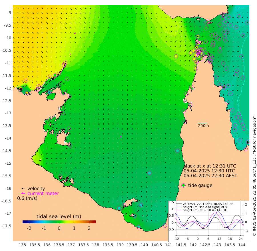 12cm/s 124T +3cm/s rms + 7cm/s -42T. ARA-GOC87 57m 31cm/s 10T +3cm/s rms + 2cm/s -2T. ARA-GOC87 60m 19cm/s 121T +2cm/s rms + 3cm/s 61T. ARA-GOC87 47m -35cm Daru -38cm Bobo Island -61cm Meer Island Barge -57cm Bramble Cay -46cm Unnamed Cay -48cm Pearce Cay -53cm Stephens Island -48cm Merrie England Shoals -32cm Mutacomal Reef -62cm Darnley Island Barge -61cm East Cay -50cm Yorke Island Barge -37cm Rennel Island -47cm Aureed Island -29cm Dungeness Reef -4cm Zagai Island 3cm Yam Island -1cm Dauan Island 0cm Saibai Island -5cm Phipi Reef -17cm Warrior Reef - West 37cm Mabuiag Island Barge -37cm Half Way Island -18cm Coconut Island -35cm Dugong Islet -7cm Poll Island -10cm Kirkcaldie Reef 10cm Suarji Island -11cm Sue Islet 66cm Hawkesbury Island 19cm Alert Patches 19cm Twin Island 60cm Badu Island 24cm St Pauls (Moa Island) 49cm Kubin (Moa Island) 31cm Ince Point 40cm Thursday Island 37cm Nardana Patches 36cm Turtle Head 65cm Round Island 51cm Goods Island 64cm Booby Island 67cm White Rocks Area 59cm Carpentaria 32cm Papou Point 85cm Bampfield Head 60cm Crab Island 60cm Red Wallis Island 43cm Packe Island -22cm Harrington Reef 59cm Herald Camp 5cm Sharp Point 44cm Red Island Point 42cm Possession Island 13cm Alpha Rock 2cm Frederick Point -17cm Wyborn Reef Light -9cm Tetley Island -47cm Triangle Reef -11cm Turtle Head Island -55cm Maclennan Cay -54cm Raine Island -47cm Mcsweeny Reef -52cm Collette Reef -56cm Shadwell Reef -58cm Hannibal Island -55cm Round Point 54cm Vrilya Point -57cm Cape Grenville -55cm Hicks Island -69cm Sir Charles Hardy Island -18cm Harvey Island -62cm Kay Reef -61cm Rocky Island -63cm Chapman Island -60cm Ham Reef -60cm Jubilee Reef -56cm Night Island -61cm Unnamed Reef No. 3 -62cm Morris Island -58cm 1st 3 Mile Opening -63cm Creech Reef -66cm Fife Island -79cm Eden Reef -66cm Stanley Island -69cm Normanby River 105cm Yabooma Island 105cm Hutchison River 98cm Elcho Island 100cm North West Crocodile Island 53cm Cape Wessel 88cm Stevens Island 3cm Guluwuru Island 73cm Hopeful Bay 69cm Auster Point 68cm Two Island Bay 57cm Cadell Strait -115cm Mallison Island 15cm Melville Bay (Gove Harbour) 21cm Truant Island 3cm Cape Arnhem 1cm Cape Grey -5cm Hawk Island 5cm Milner Bay (Groote Eylandt) -13cm Cape Beatrice -21cm West Island -16cm Centre Island -77cm Mornington Island -84cm West Wellesley Islands -93cm Bountiful Island -84cm Albert River Mouth -77cm Sweers Island -81cm Karumba -88cm Nassau River Offshore -77cm Christmas Creek -34cm Archer River -14cm Boyd Point -17cm Weipa (Humbug Point) 17cm Pennefather River 33cm Cullen Point