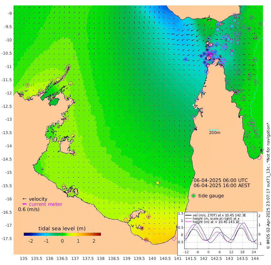 16cm/s 16T +3cm/s rms + 7cm/s -42T. ARA-GOC87 57m 18cm/s -48T +3cm/s rms + 2cm/s -2T. ARA-GOC87 60m 23cm/s 26T +2cm/s rms + 3cm/s 61T. ARA-GOC87 47m -77cm Daru -64cm Bobo Island -11cm Meer Island Barge -28cm Bramble Cay -59cm Unnamed Cay -60cm Pearce Cay -49cm Stephens Island -56cm Merrie England Shoals -81cm Mutacomal Reef -34cm Darnley Island Barge -16cm East Cay -54cm Yorke Island Barge -71cm Rennel Island -58cm Aureed Island -86cm Dungeness Reef -93cm Zagai Island -110cm Yam Island -98cm Dauan Island -89cm Saibai Island -98cm Phipi Reef -94cm Warrior Reef - West -126cm Mabuiag Island Barge -74cm Half Way Island -91cm Coconut Island -86cm Dugong Islet -104cm Poll Island -110cm Kirkcaldie Reef -122cm Suarji Island -97cm Sue Islet -179cm Hawkesbury Island -139cm Alert Patches -135cm Twin Island -163cm Badu Island -141cm St Pauls (Moa Island) -159cm Kubin (Moa Island) -144cm Ince Point -152cm Thursday Island -149cm Nardana Patches -151cm Turtle Head -158cm Round Island -160cm Goods Island -170cm Booby Island -168cm White Rocks Area -147cm Carpentaria -128cm Papou Point -180cm Bampfield Head -143cm Crab Island -166cm Red Wallis Island -161cm Packe Island -101cm Harrington Reef -169cm Herald Camp -36cm Sharp Point -142cm Red Island Point -139cm Possession Island -116cm Alpha Rock -120cm Frederick Point -92cm Wyborn Reef Light -100cm Tetley Island -26cm Triangle Reef -107cm Turtle Head Island -23cm Maclennan Cay -4cm Raine Island -55cm Mcsweeny Reef -41cm Collette Reef -16cm Shadwell Reef -40cm Hannibal Island -35cm Round Point -138cm Vrilya Point -29cm Cape Grenville -24cm Hicks Island -21cm Sir Charles Hardy Island -9cm Harvey Island -15cm Kay Reef -5cm Rocky Island 1cm Chapman Island -1cm Ham Reef -5cm Jubilee Reef -8cm Night Island -3cm Unnamed Reef No. 3 -6cm Morris Island -8cm 1st 3 Mile Opening -6cm Creech Reef -1cm Fife Island 9cm Eden Reef -4cm Stanley Island -3cm Normanby River 16cm Yabooma Island 29cm Hutchison River 34cm Elcho Island 27cm North West Crocodile Island 28cm Cape Wessel 31cm Stevens Island 51cm Guluwuru Island 39cm Hopeful Bay 24cm Auster Point 24cm Two Island Bay 45cm Cadell Strait 130cm Mallison Island 43cm Melville Bay (Gove Harbour) 39cm Truant Island 37cm Cape Arnhem 40cm Cape Grey 49cm Hawk Island 58cm Milner Bay (Groote Eylandt) 60cm Cape Beatrice 58cm West Island 59cm Centre Island 99cm Mornington Island 101cm West Wellesley Islands 121cm Bountiful Island 175cm Albert River Mouth 186cm Sweers Island 153cm Karumba 54cm Nassau River Offshore 7cm Christmas Creek -38cm Archer River -64cm Boyd Point -63cm Weipa (Humbug Point) -84cm Pennefather River -114cm Cullen Point