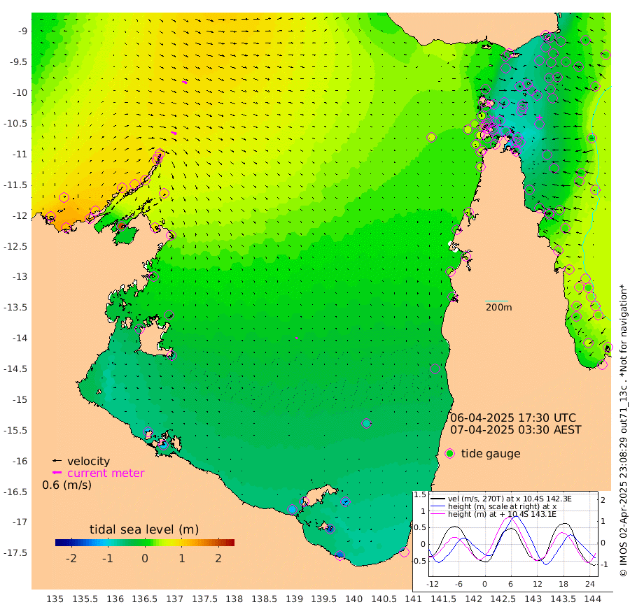 38cm/s 115T +3cm/s rms + 7cm/s -42T. ARA-GOC87 57m 14cm/s 145T +3cm/s rms + 2cm/s -2T. ARA-GOC87 60m 34cm/s 111T +2cm/s rms + 3cm/s 61T. ARA-GOC87 47m -48cm Daru -36cm Bobo Island 21cm Meer Island Barge 1cm Bramble Cay -27cm Unnamed Cay -26cm Pearce Cay -20cm Stephens Island -29cm Merrie England Shoals -49cm Mutacomal Reef -5cm Darnley Island Barge 17cm East Cay -23cm Yorke Island Barge -41cm Rennel Island -33cm Aureed Island -50cm Dungeness Reef -48cm Zagai Island -53cm Yam Island -24cm Dauan Island -15cm Saibai Island -48cm Phipi Reef -51cm Warrior Reef - West -20cm Mabuiag Island Barge -40cm Half Way Island -49cm Coconut Island -49cm Dugong Islet -56cm Poll Island -60cm Kirkcaldie Reef -70cm Suarji Island -46cm Sue Islet 40cm Hawkesbury Island -55cm Alert Patches -53cm Twin Island 25cm Badu Island -58cm St Pauls (Moa Island) 8cm Kubin (Moa Island) -36cm Ince Point -22cm Thursday Island -26cm Nardana Patches -3cm Turtle Head 14cm Round Island 34cm Goods Island 51cm Booby Island 36cm White Rocks Area 55cm Carpentaria -44cm Papou Point 59cm Bampfield Head 39cm Crab Island 42cm Red Wallis Island 16cm Packe Island -63cm Harrington Reef 39cm Herald Camp -28cm Sharp Point -3cm Red Island Point -30cm Possession Island -50cm Alpha Rock -55cm Frederick Point -45cm Wyborn Reef Light -47cm Tetley Island 15cm Triangle Reef -42cm Turtle Head Island 14cm Maclennan Cay 33cm Raine Island -25cm Mcsweeny Reef -14cm Collette Reef 15cm Shadwell Reef -14cm Hannibal Island 1cm Round Point 41cm Vrilya Point 2cm Cape Grenville 10cm Hicks Island 25cm Sir Charles Hardy Island 0cm Harvey Island 20cm Kay Reef 29cm Rocky Island 42cm Chapman Island 40cm Ham Reef 32cm Jubilee Reef 20cm Night Island 36cm Unnamed Reef No. 3 28cm Morris Island 31cm 1st 3 Mile Opening 30cm Creech Reef 22cm Fife Island 45cm Eden Reef 29cm Stanley Island 28cm Normanby River 107cm Yabooma Island 117cm Hutchison River 99cm Elcho Island 87cm North West Crocodile Island 100cm Cape Wessel 102cm Stevens Island 104cm Guluwuru Island 100cm Hopeful Bay 95cm Auster Point 102cm Two Island Bay 129cm Cadell Strait 195cm Mallison Island 84cm Melville Bay (Gove Harbour) 96cm Truant Island 57cm Cape Arnhem 12cm Cape Grey -9cm Hawk Island -49cm Milner Bay (Groote Eylandt) -65cm Cape Beatrice -111cm West Island -109cm Centre Island -120cm Mornington Island -120cm West Wellesley Islands -125cm Bountiful Island -157cm Albert River Mouth -163cm Sweers Island -158cm Karumba -78cm Nassau River Offshore -34cm Christmas Creek 13cm Archer River 27cm Boyd Point 32cm Weipa (Humbug Point) 22cm Pennefather River 42cm Cullen Point