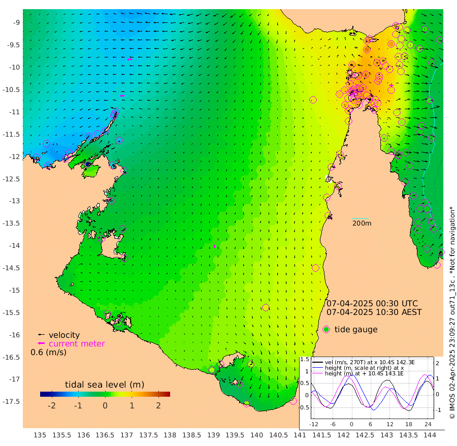 37cm/s -94T +3cm/s rms + 7cm/s -42T. ARA-GOC87 57m 26cm/s -175T +3cm/s rms + 2cm/s -2T. ARA-GOC87 60m 45cm/s -99T +2cm/s rms + 3cm/s 61T. ARA-GOC87 47m 87cm Daru 66cm Bobo Island -4cm Meer Island Barge 16cm Bramble Cay 54cm Unnamed Cay 60cm Pearce Cay 42cm Stephens Island 48cm Merrie England Shoals 84cm Mutacomal Reef 28cm Darnley Island Barge 0cm East Cay 54cm Yorke Island Barge 73cm Rennel Island 65cm Aureed Island 102cm Dungeness Reef 115cm Zagai Island 130cm Yam Island 146cm Dauan Island 124cm Saibai Island 158cm Phipi Reef 136cm Warrior Reef - West 130cm Mabuiag Island Barge 73cm Half Way Island 94cm Coconut Island 92cm Dugong Islet 117cm Poll Island 122cm Kirkcaldie Reef 145cm Suarji Island 108cm Sue Islet 129cm Hawkesbury Island 146cm Alert Patches 139cm Twin Island 134cm Badu Island 153cm St Pauls (Moa Island) 131cm Kubin (Moa Island) 142cm Ince Point 140cm Thursday Island 141cm Nardana Patches 137cm Turtle Head 116cm Round Island 120cm Goods Island 110cm Booby Island 112cm White Rocks Area 68cm Carpentaria 125cm Papou Point 88cm Bampfield Head 93cm Crab Island 113cm Red Wallis Island 131cm Packe Island 102cm Harrington Reef 116cm Herald Camp 49cm Sharp Point 122cm Red Island Point 122cm Possession Island 116cm Alpha Rock 123cm Frederick Point 85cm Wyborn Reef Light 94cm Tetley Island 15cm Triangle Reef 87cm Turtle Head Island 10cm Maclennan Cay -15cm Raine Island 51cm Mcsweeny Reef 36cm Collette Reef 5cm Shadwell Reef 33cm Hannibal Island 19cm Round Point 82cm Vrilya Point 15cm Cape Grenville 9cm Hicks Island 5cm Sir Charles Hardy Island 5cm Harvey Island -6cm Kay Reef -11cm Rocky Island -21cm Chapman Island -20cm Ham Reef -13cm Jubilee Reef -5cm Night Island -17cm Unnamed Reef No. 3 -12cm Morris Island -11cm 1st 3 Mile Opening -11cm Creech Reef -11cm Fife Island -31cm Eden Reef -16cm Stanley Island -19cm Normanby River -119cm Yabooma Island -130cm Hutchison River -122cm Elcho Island -106cm North West Crocodile Island -123cm Cape Wessel -130cm Stevens Island -120cm Guluwuru Island -128cm Hopeful Bay -119cm Auster Point -121cm Two Island Bay -137cm Cadell Strait -217cm Mallison Island -102cm Melville Bay (Gove Harbour) -113cm Truant Island -75cm Cape Arnhem -49cm Cape Grey -35cm Hawk Island -30cm Milner Bay (Groote Eylandt) -7cm Cape Beatrice 22cm West Island 16cm Centre Island 44cm Mornington Island 41cm West Wellesley Islands 48cm Bountiful Island 31cm Albert River Mouth 12cm Sweers Island 51cm Karumba 72cm Nassau River Offshore 78cm Christmas Creek 63cm Archer River 63cm Boyd Point 67cm Weipa (Humbug Point) 63cm Pennefather River 74cm Cullen Point