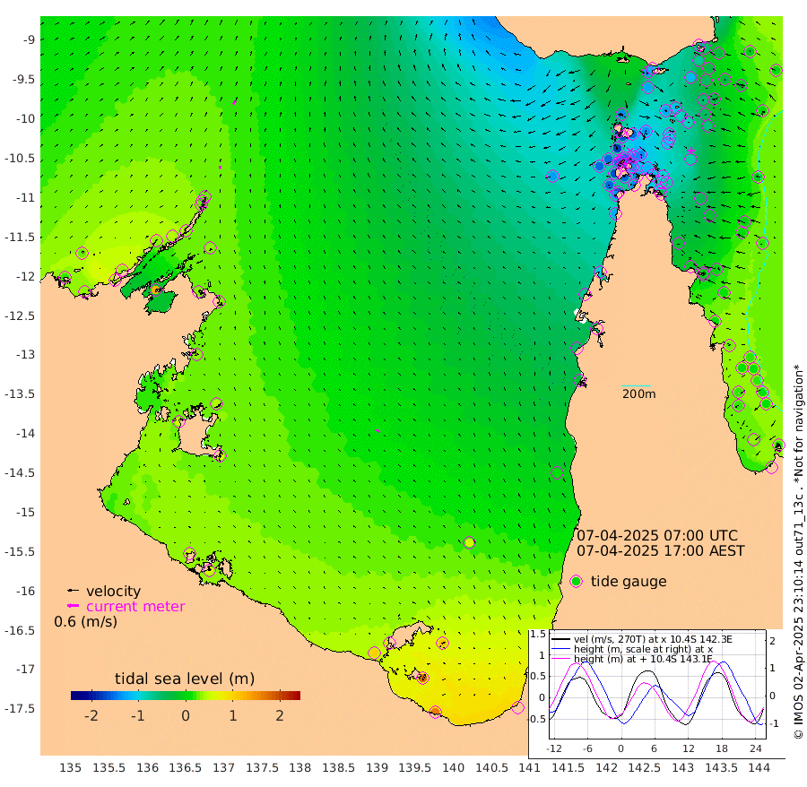 15cm/s 21T +3cm/s rms + 7cm/s -42T. ARA-GOC87 57m 18cm/s -41T +3cm/s rms + 2cm/s -2T. ARA-GOC87 60m 21cm/s 32T +2cm/s rms + 3cm/s 61T. ARA-GOC87 47m -70cm Daru -55cm Bobo Island 7cm Meer Island Barge -8cm Bramble Cay -43cm Unnamed Cay -46cm Pearce Cay -31cm Stephens Island -34cm Merrie England Shoals -69cm Mutacomal Reef -19cm Darnley Island Barge 5cm East Cay -44cm Yorke Island Barge -58cm Rennel Island -50cm Aureed Island -83cm Dungeness Reef -108cm Zagai Island -122cm Yam Island -129cm Dauan Island -119cm Saibai Island -122cm Phipi Reef -113cm Warrior Reef - West -141cm Mabuiag Island Barge -61cm Half Way Island -84cm Coconut Island -77cm Dugong Islet -106cm Poll Island -108cm Kirkcaldie Reef -131cm Suarji Island -102cm Sue Islet -173cm Hawkesbury Island -141cm Alert Patches -139cm Twin Island -163cm Badu Island -152cm St Pauls (Moa Island) -160cm Kubin (Moa Island) -148cm Ince Point -154cm Thursday Island -152cm Nardana Patches -149cm Turtle Head -157cm Round Island -151cm Goods Island -157cm Booby Island -153cm White Rocks Area -135cm Carpentaria -135cm Papou Point -167cm Bampfield Head -130cm Crab Island -154cm Red Wallis Island -156cm Packe Island -89cm Harrington Reef -166cm Herald Camp -42cm Sharp Point -136cm Red Island Point -140cm Possession Island -119cm Alpha Rock -118cm Frederick Point -82cm Wyborn Reef Light -94cm Tetley Island -13cm Triangle Reef -93cm Turtle Head Island -6cm Maclennan Cay 17cm Raine Island -39cm Mcsweeny Reef -24cm Collette Reef 1cm Shadwell Reef -20cm Hannibal Island -11cm Round Point -121cm Vrilya Point -7cm Cape Grenville -4cm Hicks Island -4cm Sir Charles Hardy Island -3cm Harvey Island 10cm Kay Reef 15cm Rocky Island 23cm Chapman Island 19cm Ham Reef 15cm Jubilee Reef 11cm Night Island 19cm Unnamed Reef No. 3 16cm Morris Island 12cm 1st 3 Mile Opening 15cm Creech Reef 22cm Fife Island 34cm Eden Reef 20cm Stanley Island 24cm Normanby River 22cm Yabooma Island 32cm Hutchison River 36cm Elcho Island 29cm North West Crocodile Island 27cm Cape Wessel 35cm Stevens Island 43cm Guluwuru Island 43cm Hopeful Bay 26cm Auster Point 21cm Two Island Bay 42cm Cadell Strait 124cm Mallison Island 37cm Melville Bay (Gove Harbour) 33cm Truant Island 30cm Cape Arnhem 36cm Cape Grey 43cm Hawk Island 54cm Milner Bay (Groote Eylandt) 56cm Cape Beatrice 55cm West Island 57cm Centre Island 93cm Mornington Island 98cm West Wellesley Islands 111cm Bountiful Island 162cm Albert River Mouth 174cm Sweers Island 141cm Karumba 53cm Nassau River Offshore 10cm Christmas Creek -28cm Archer River -57cm Boyd Point -55cm Weipa (Humbug Point) -70cm Pennefather River -105cm Cullen Point
